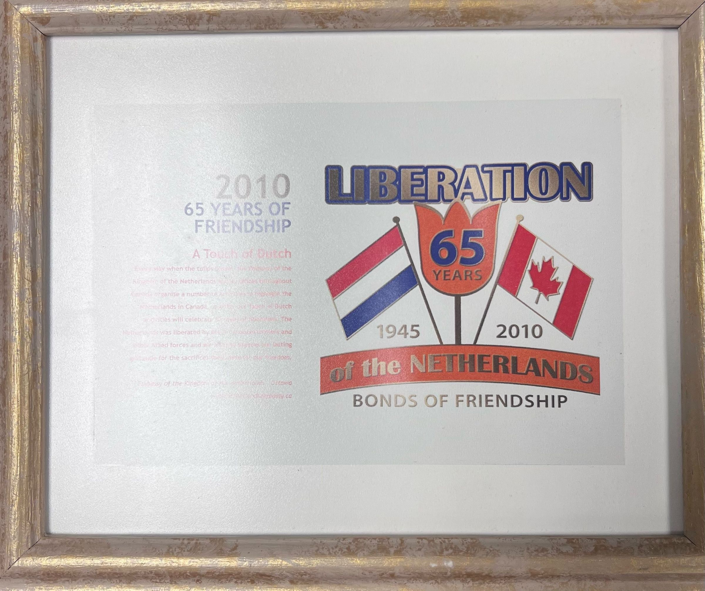 A plaque in celebration between the Netherlands and Canada for 65 years of friendship.