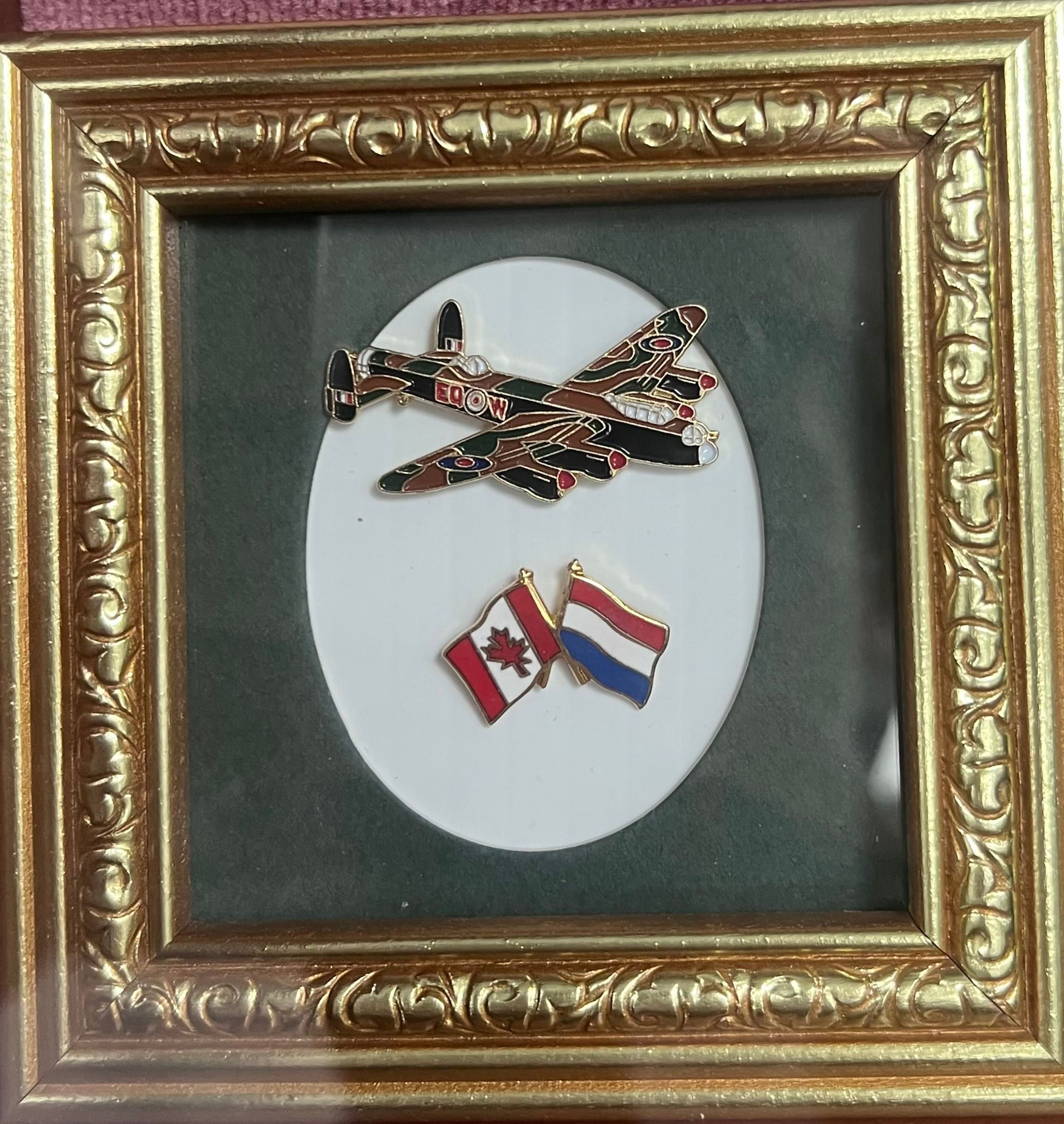 A pin of a Lancaster and a pin the Dutch and Canadian Flag in a frame.