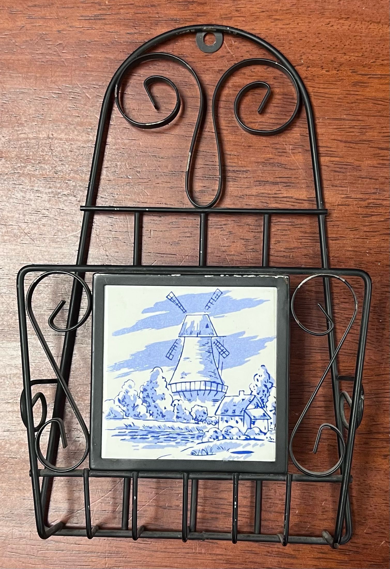 A metal wire wall hanger of sorts with a square ceramic plate featuring a blue and white Dutch windmill.