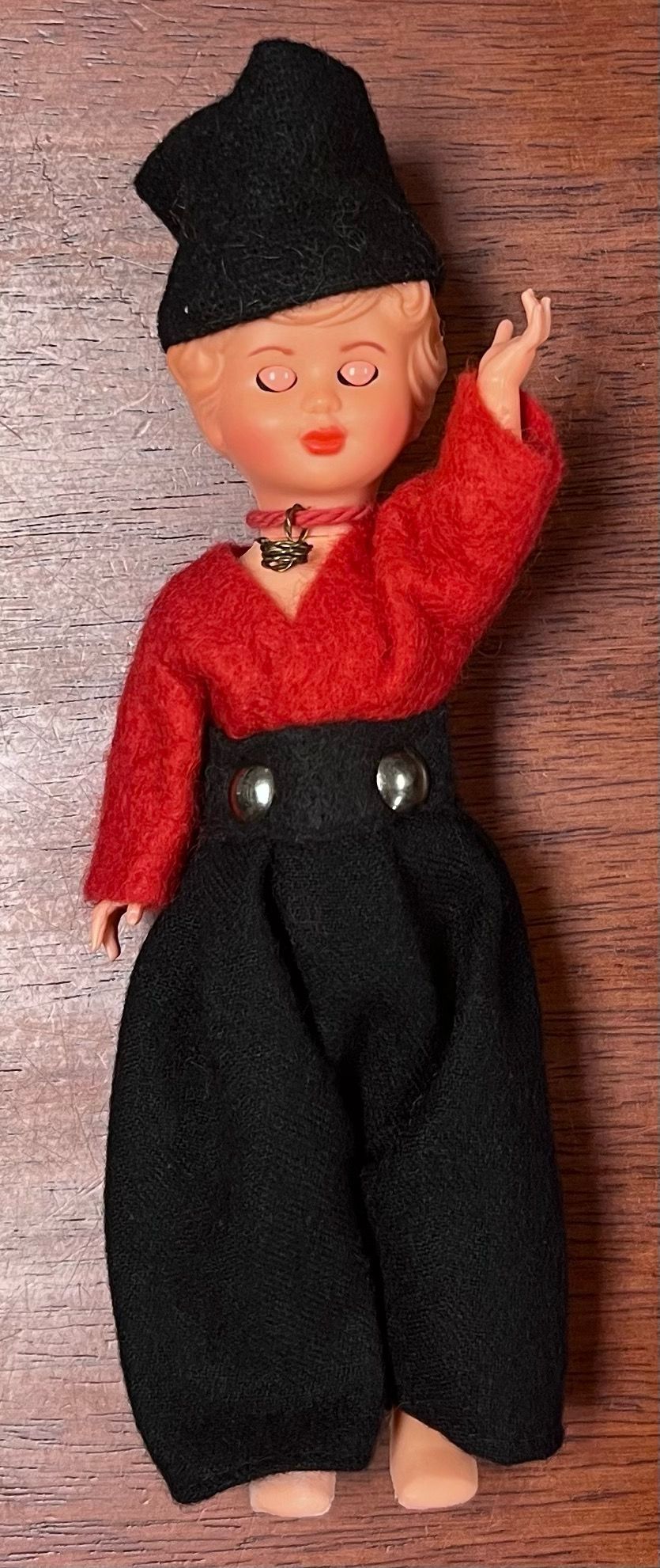 A Dutch doll wearing red and black.