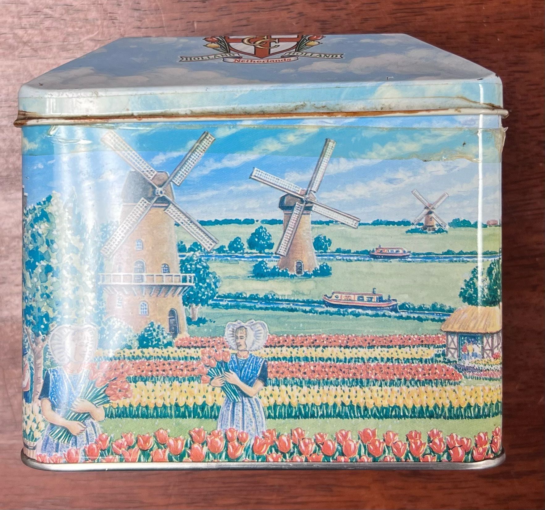 A Dutch candy tin featuring images of the Dutch countryside.