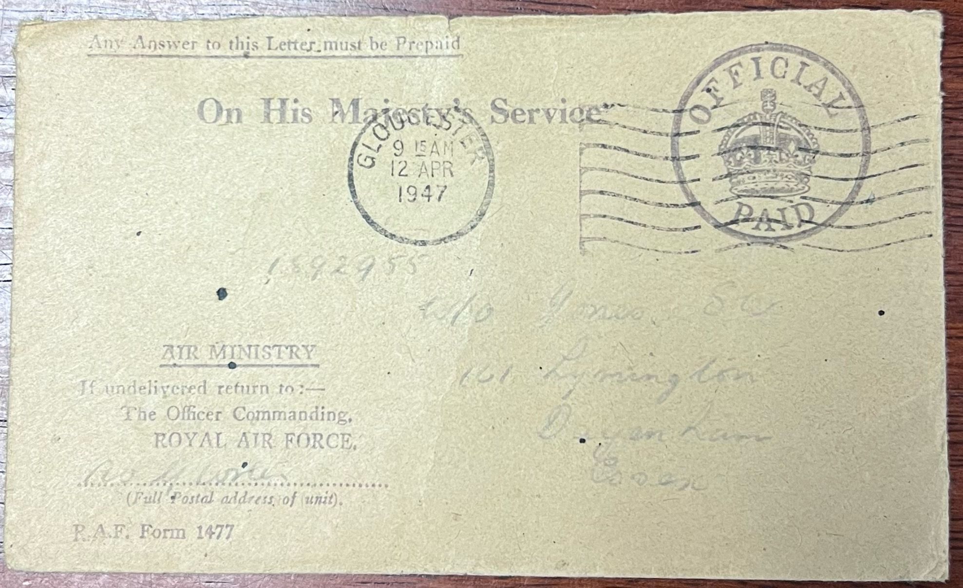 A envelope addressed to Stan Jones in 1947 from the British military.