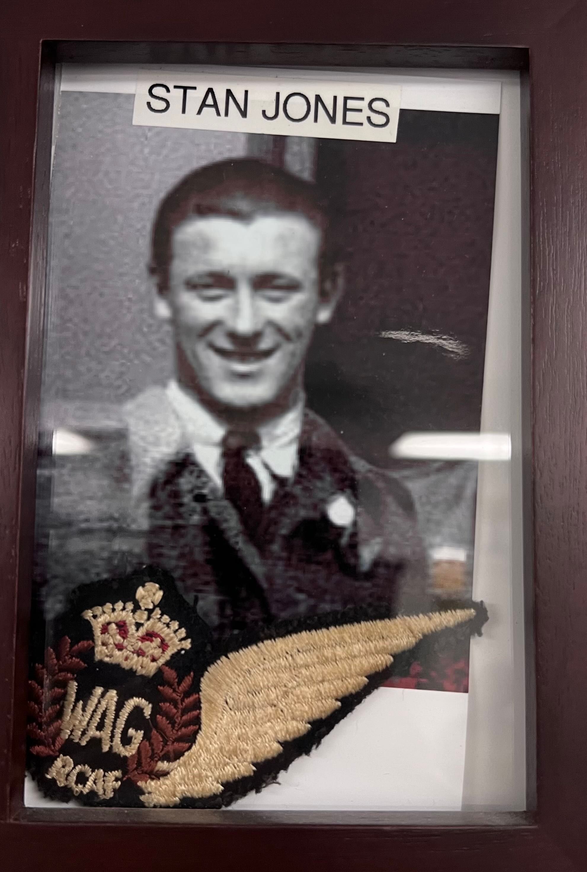 A photo of Stan Jones with a Wireless Air Gunner Insignia in the frame.