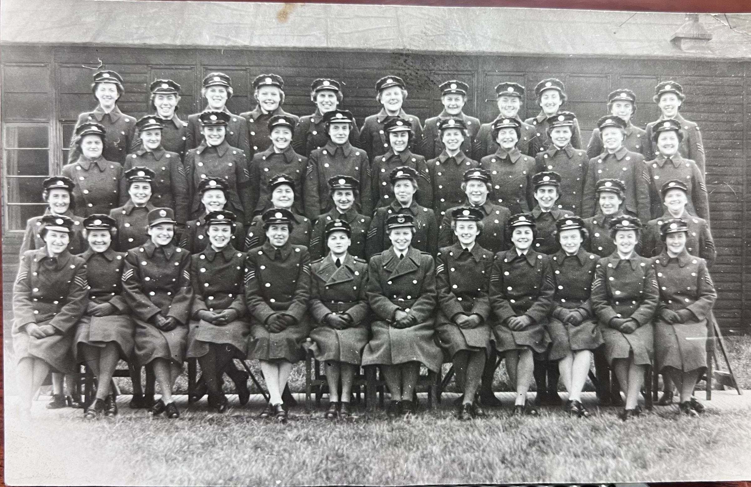 A group photo of Enid Morris and many other WAF servicewomen. The back is full of signatures and notes from the people in the photo.Photograph Details