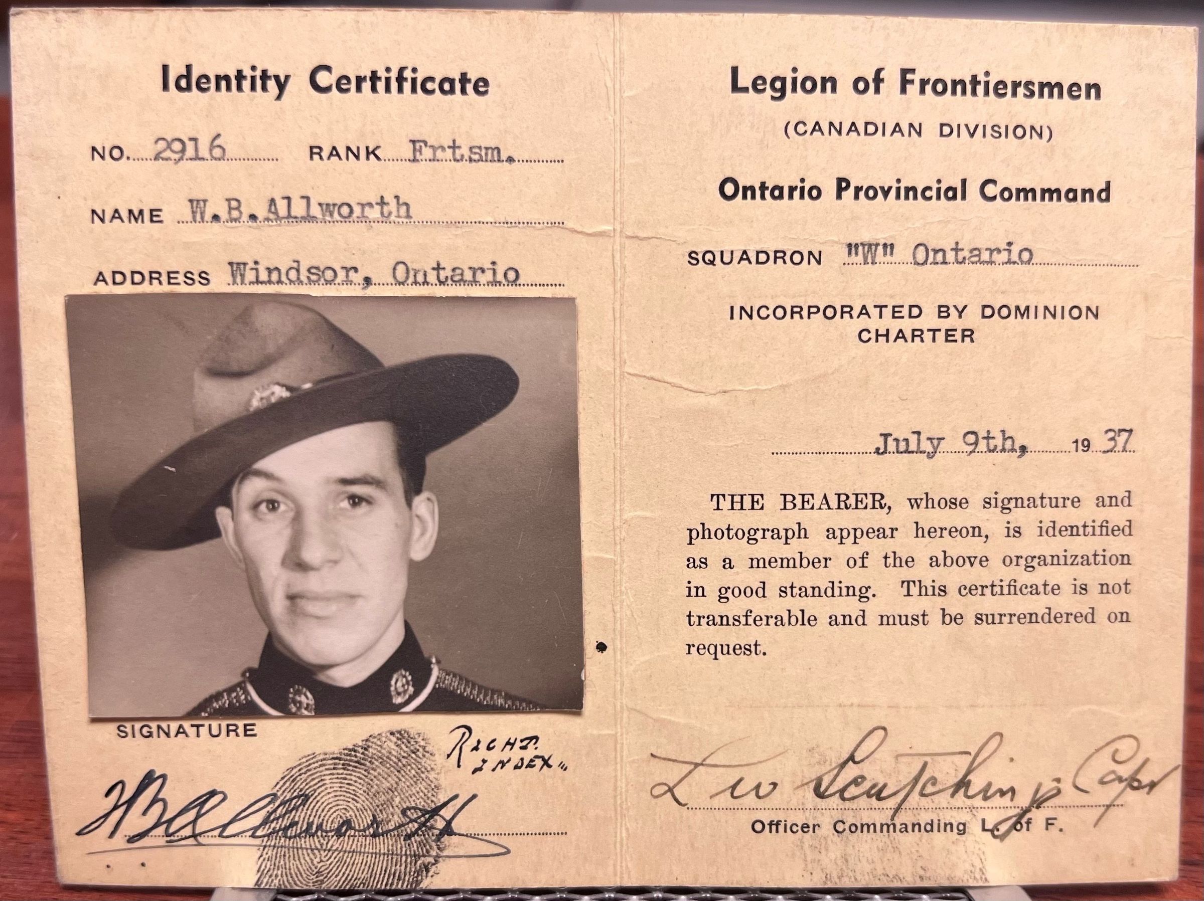 A certificate of Wanzer Allworth's, showing he is part of the Legion of Frontiersmen.