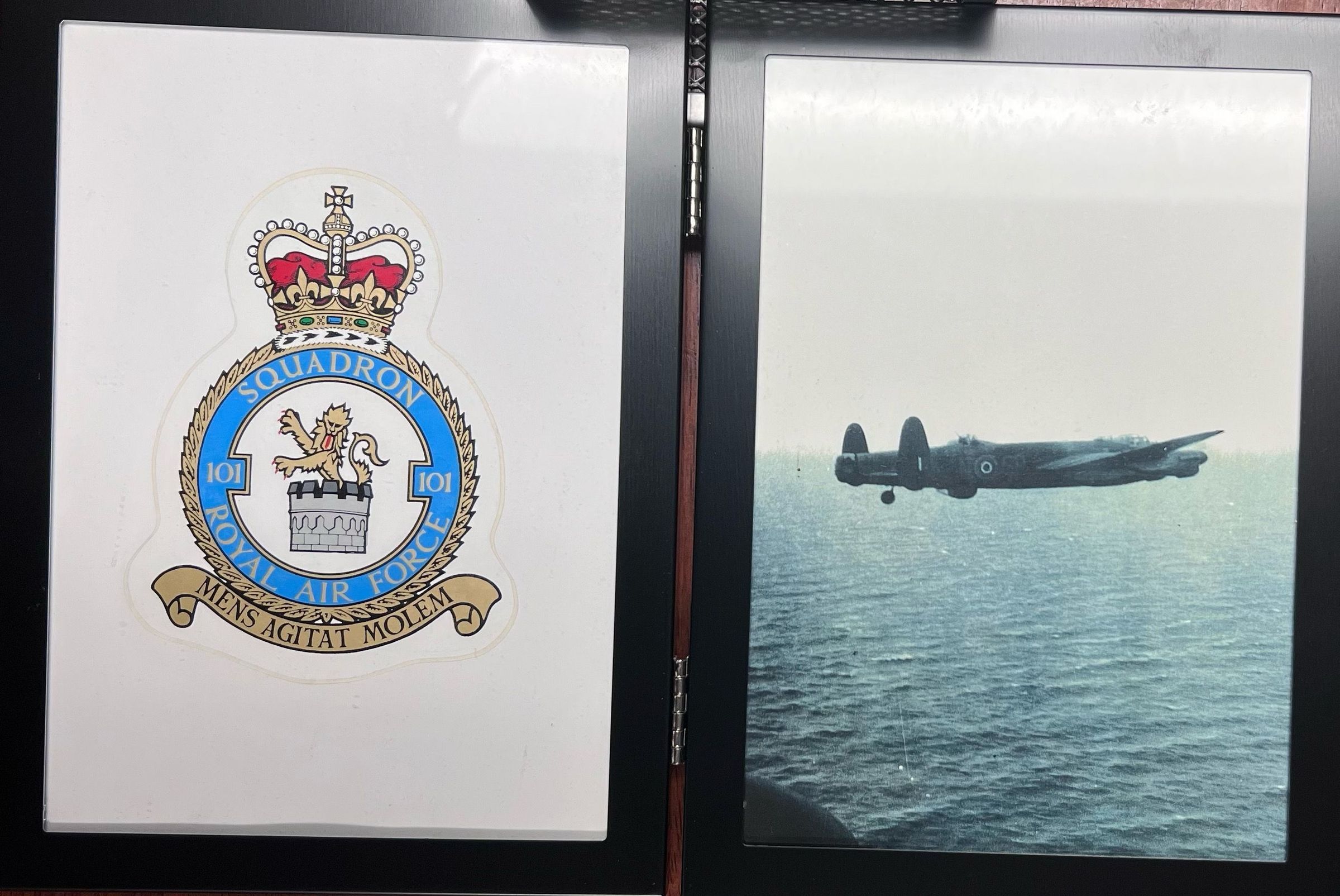 A photo of a Lancaster alongside a 101 RAF Squadron emblem.