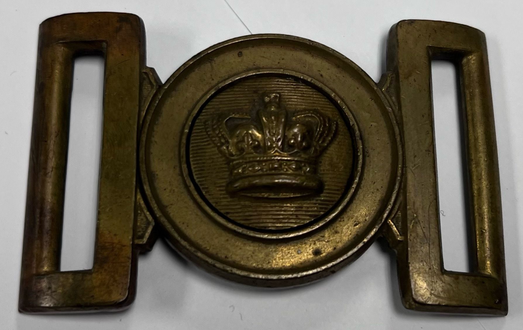 A brass belt buckel that can separate into two pieces, adorned with the royal crown in the center.Collection