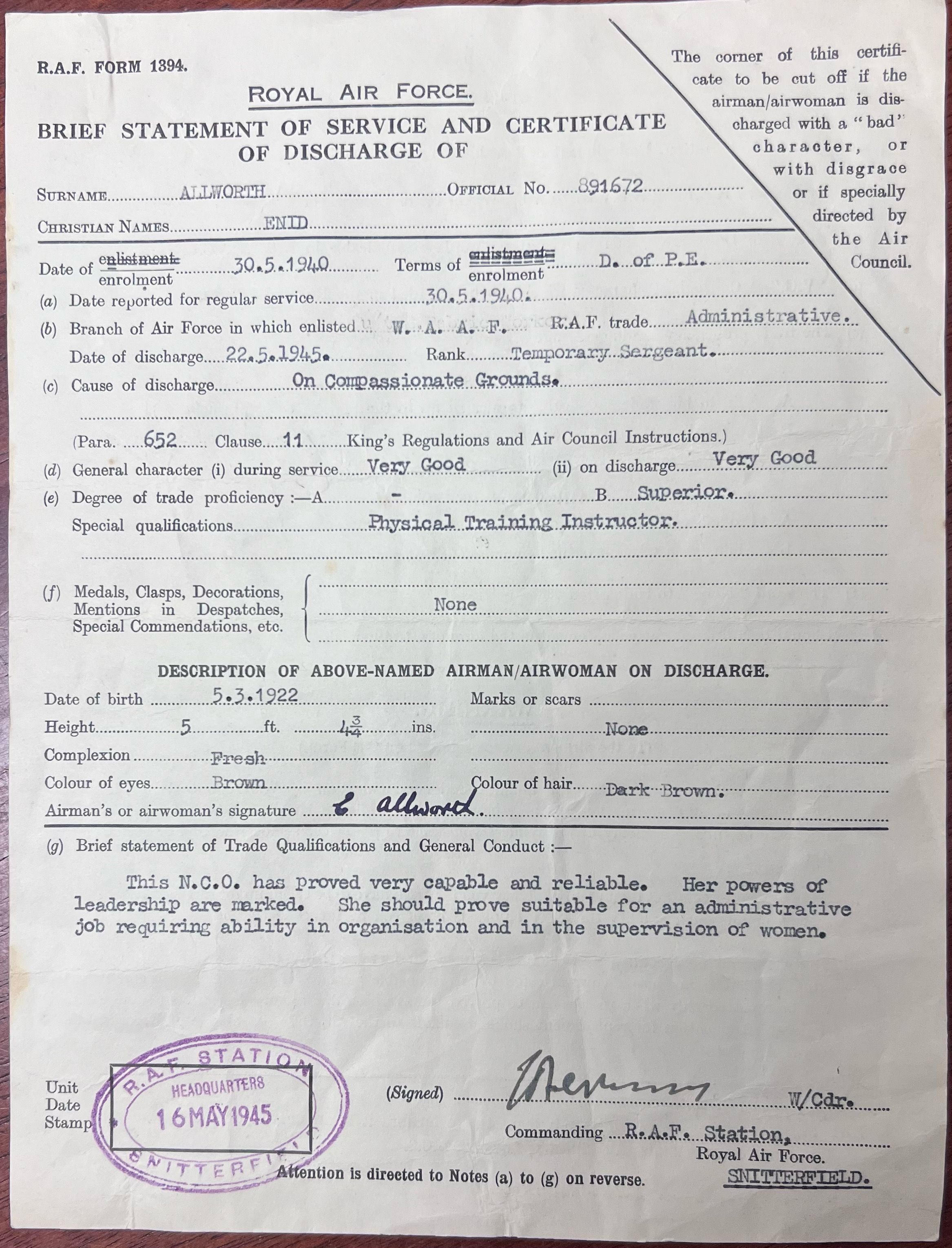 A form regarding the discharge of Enid Allworth from military service.