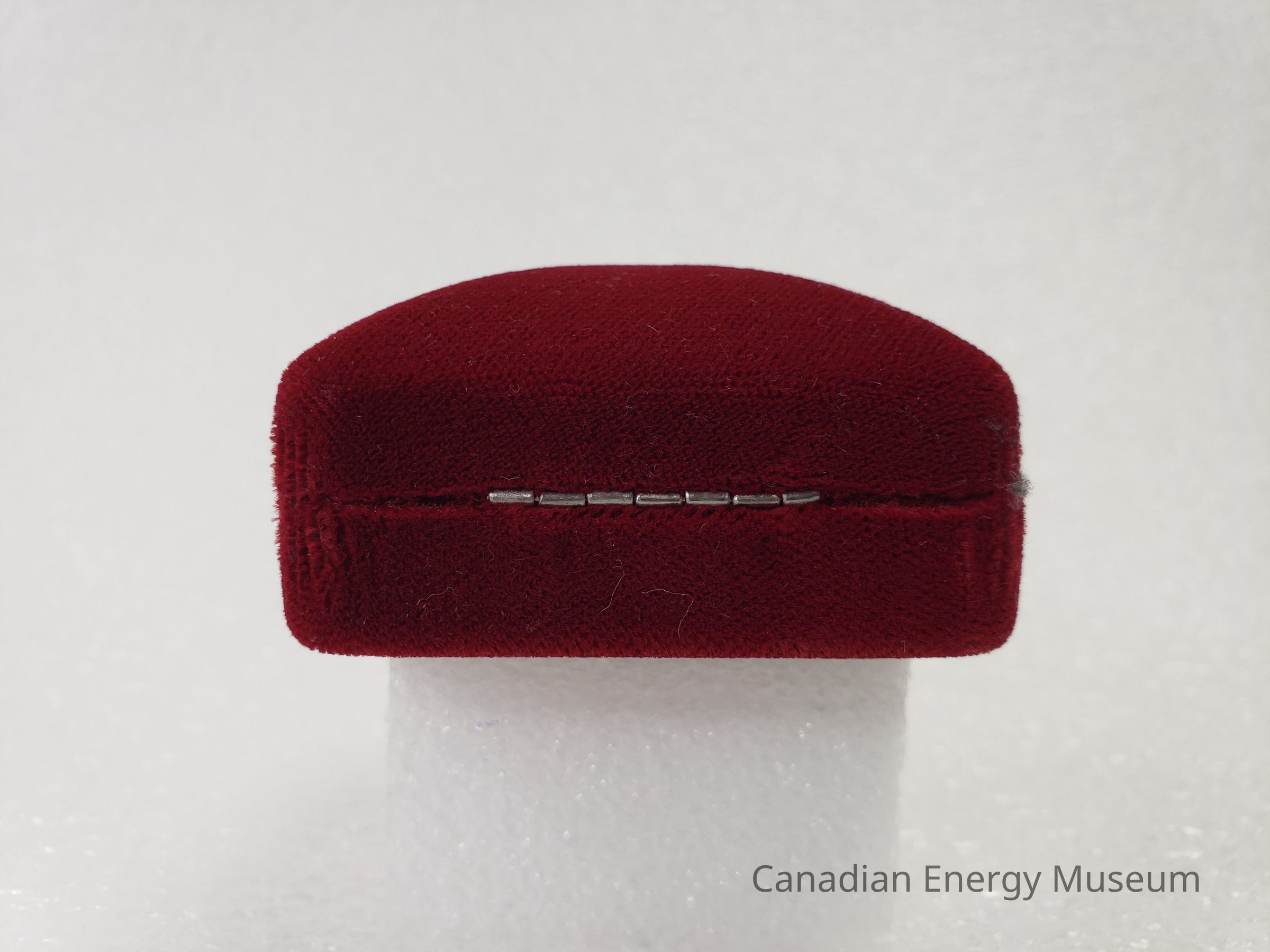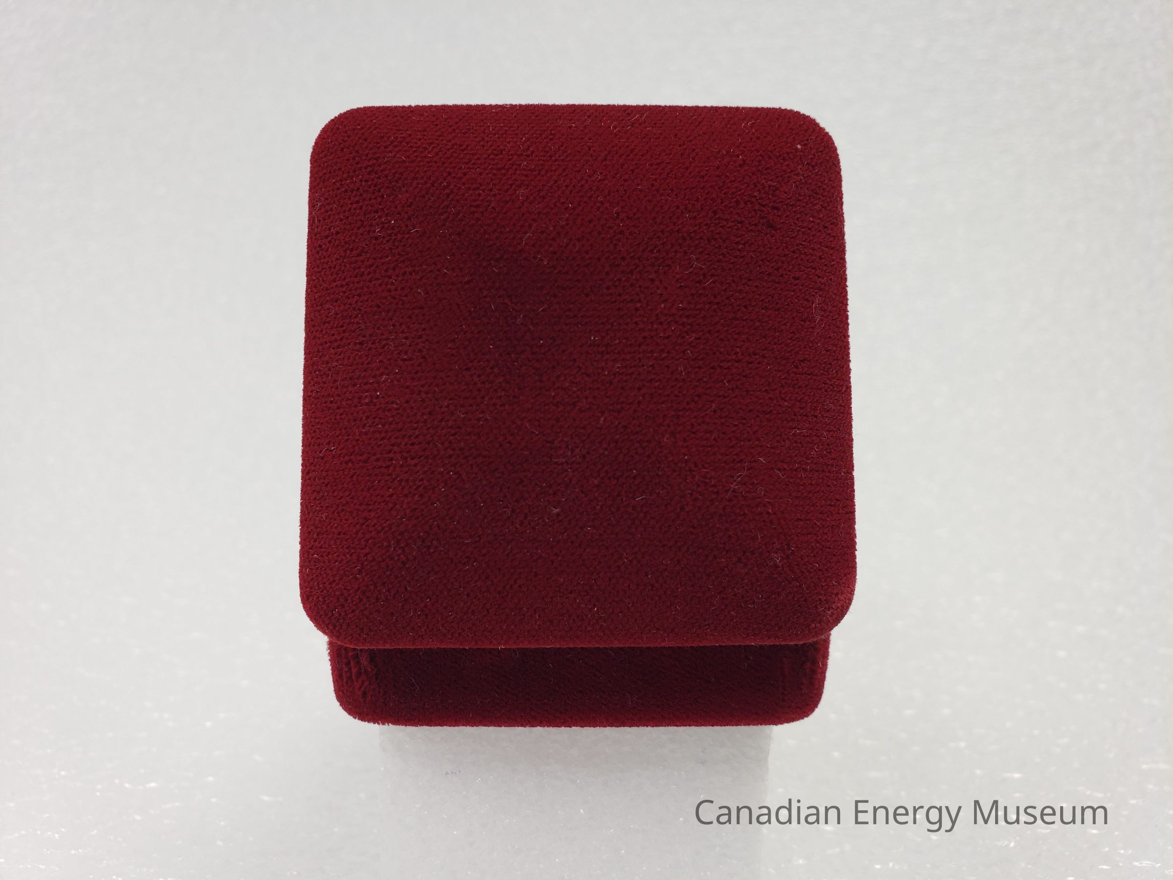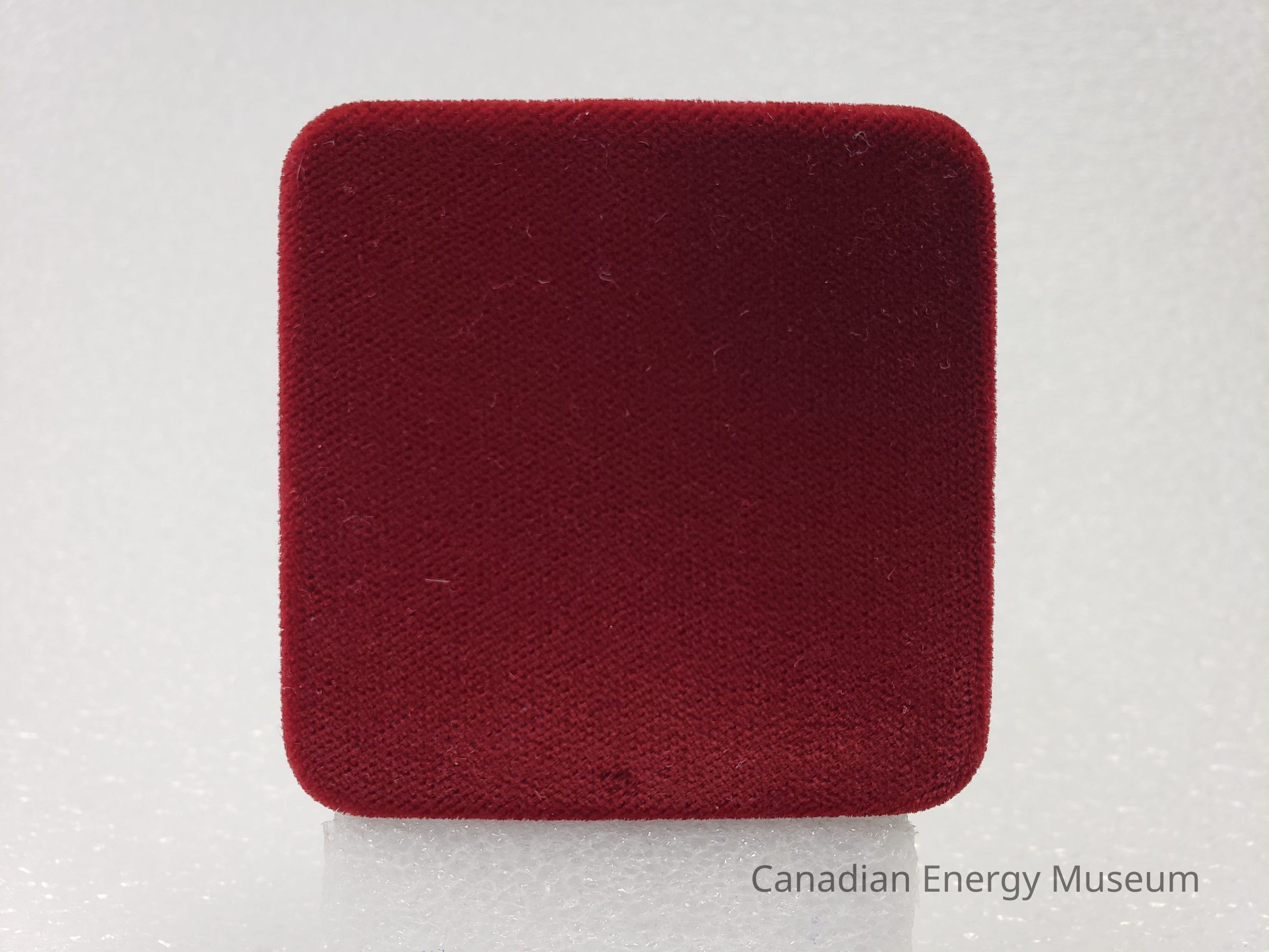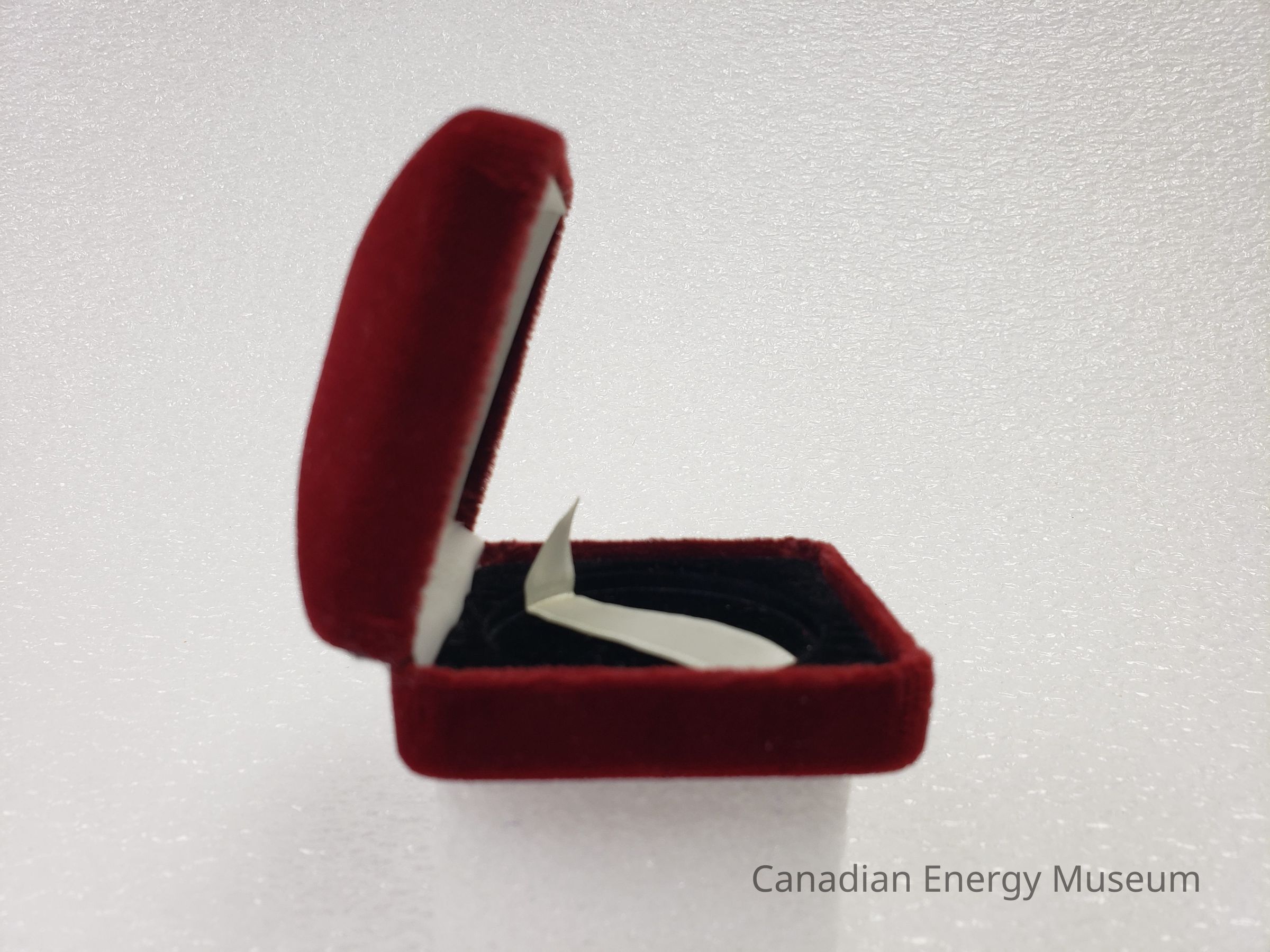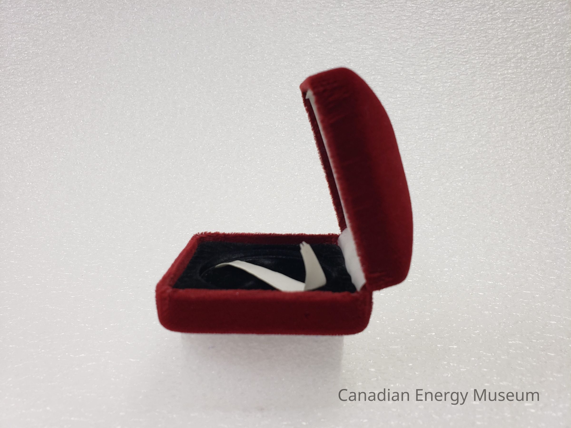 This is a clam-shell 'ring box' style case, with a red velvet/flocked outer fabric, a black velvet/flocked interior of the bottom, and white satin lining on the interior of the top. In the centre of the top's interior is printed the Texaco round start logo in black. The interior of the base is formed to hold the coin, with a cream satin ribbon beneath the coin for easy removal. The hinge is a silver-coloured metal, with seven joints.