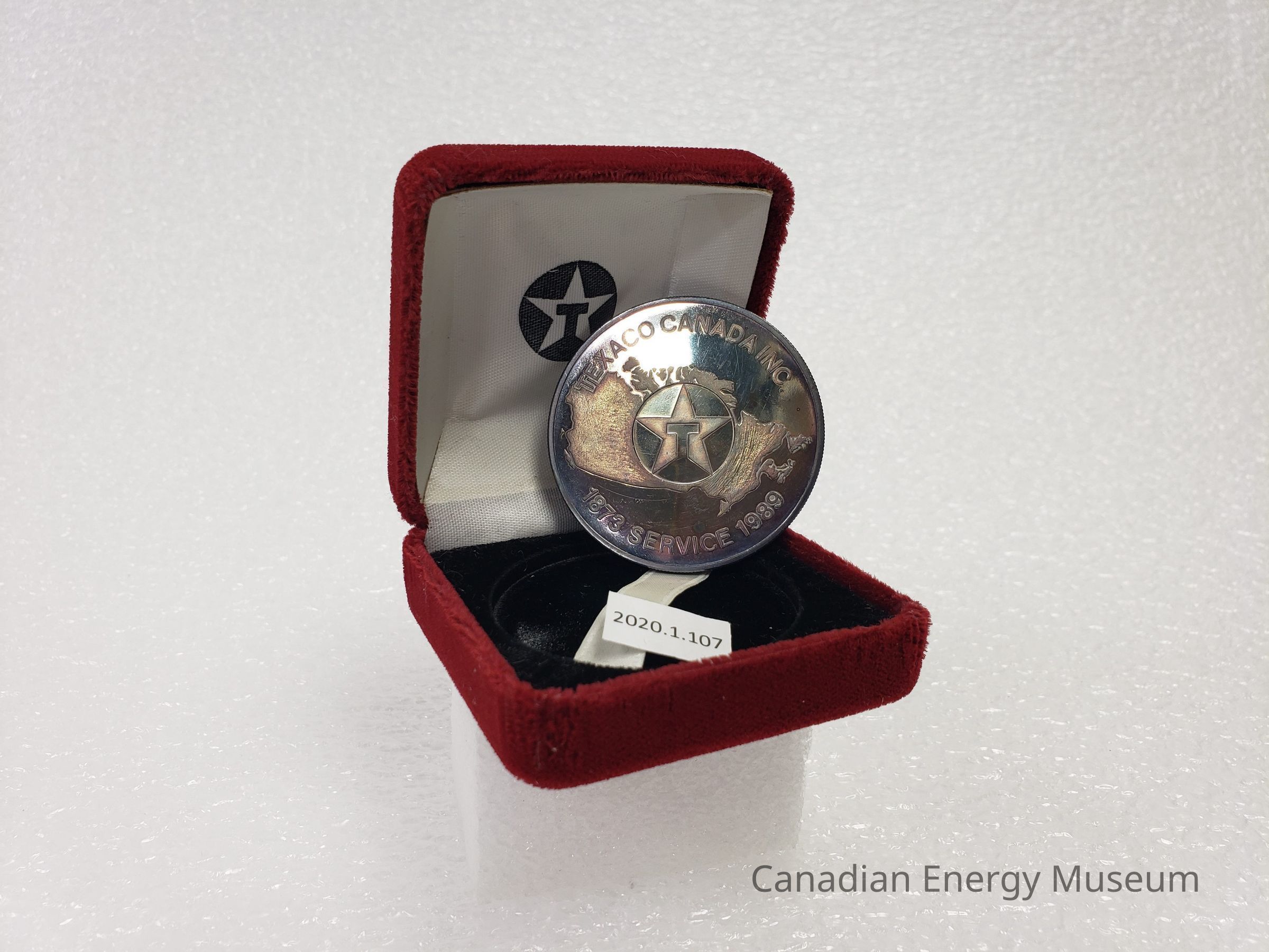 Old Description (Kelsey Dalrymple, 2/10/2020): Commemorative Texaco coin in red felt box. One side is engraved with a map of Canada, with the Texaco logo in the centre. It reads "TEXACO CANADA INC / 1873 SERVICE 1989" The verso is engraved with an Indigenous man wearing a headdress, beside the Texaco logo. The border is engraved with the different names Texaco operated under in Canada before becoming Texaco.Collection