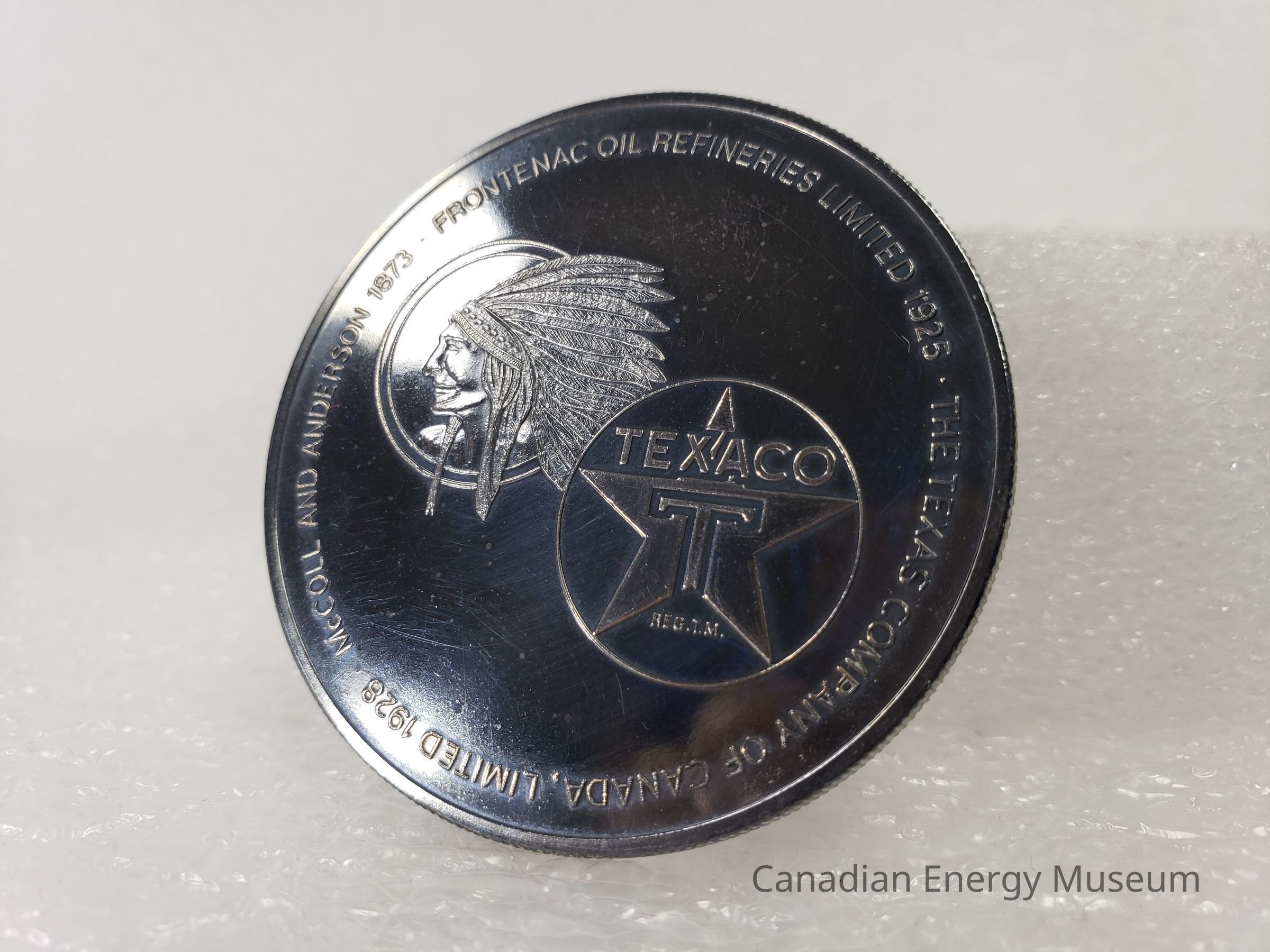 A large, silver-coloured commemorative coin with a matching clam-shell case. The coin is branded to Texaco Canada Inc., also referring to Frontenac Oil Refineries Limited 1925, The Texas Company of Canada Limited 1928, and McColl and Anderson 1873.