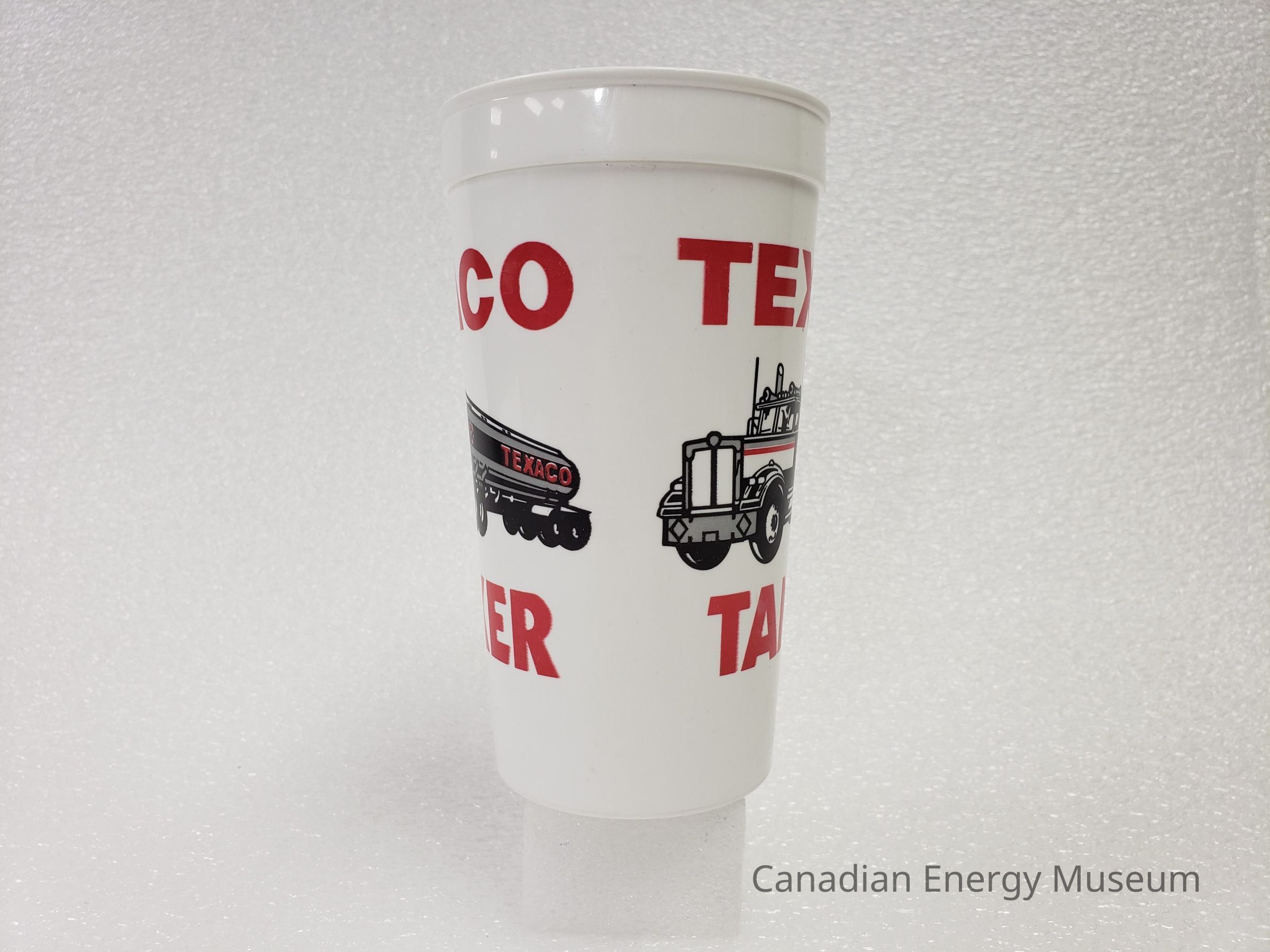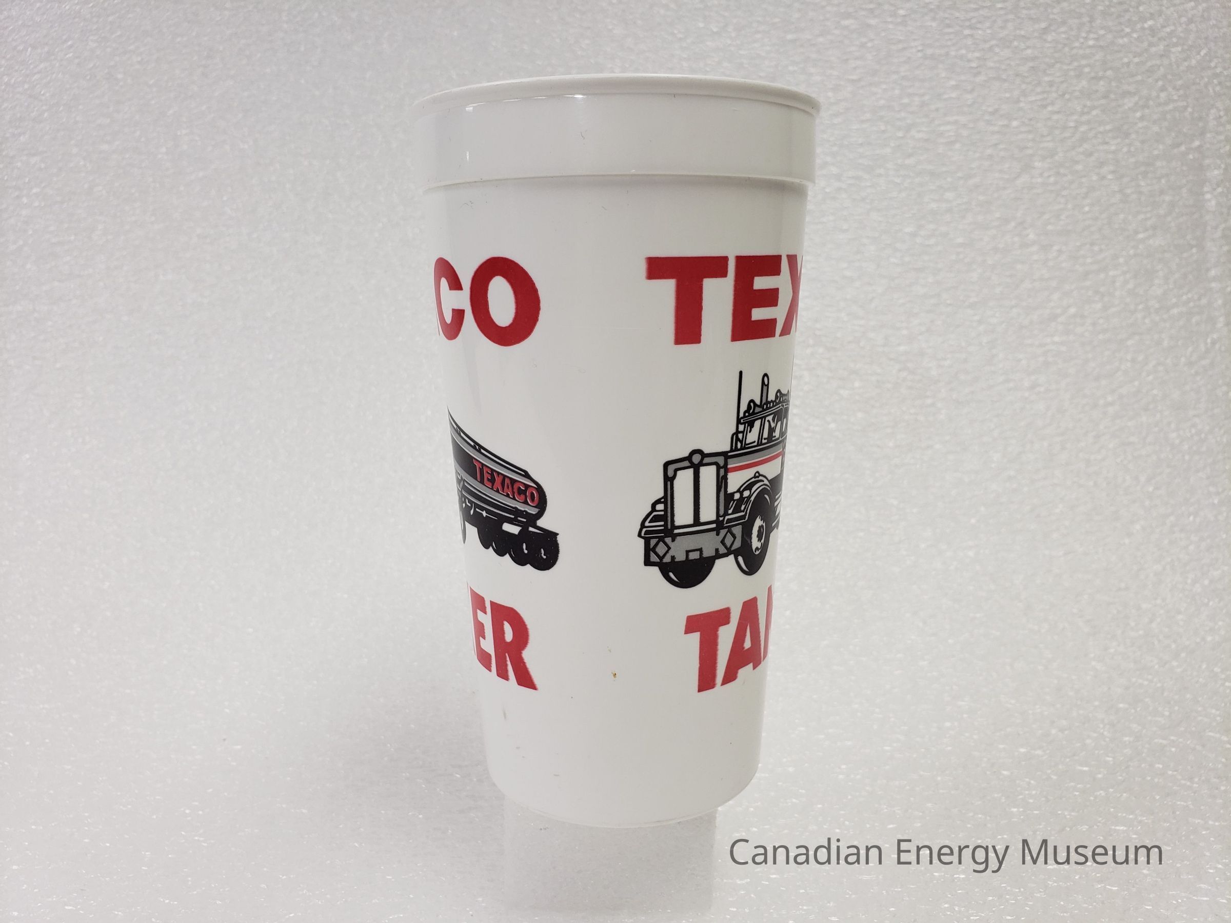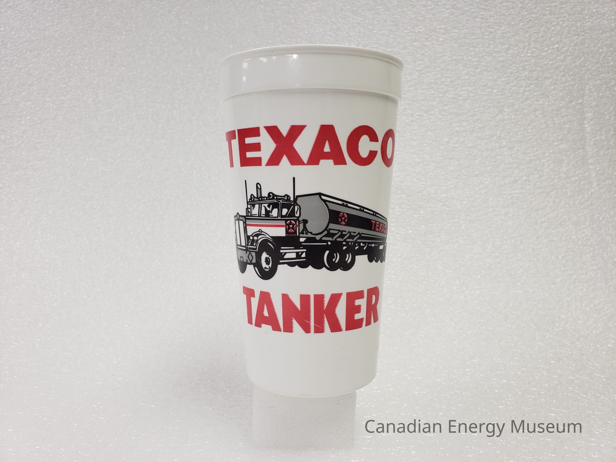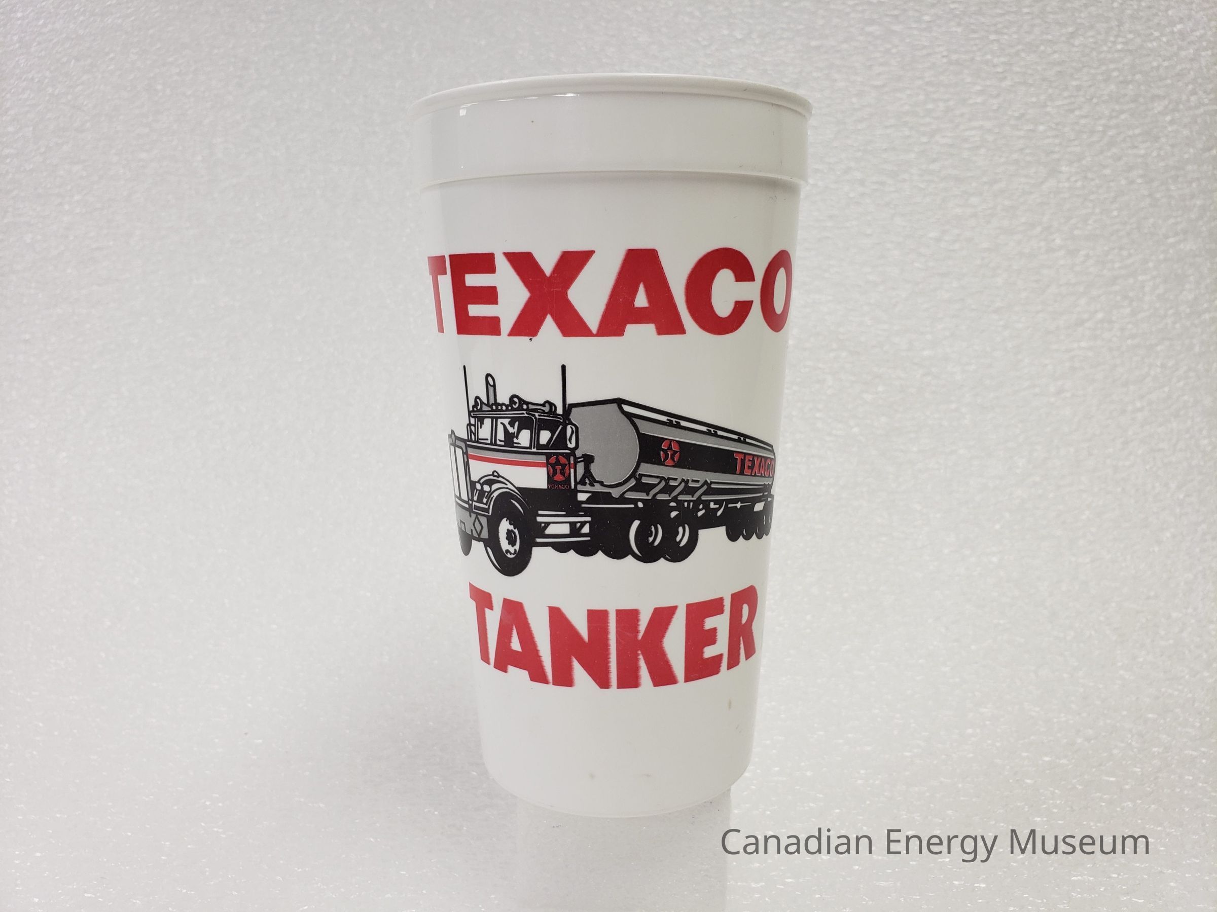 Old Description (Kelsey Dalrymple, 2/10/2020): Large plastic traveling cup. White, with grey and red illustration of a Texaco tanker on either side.Collection