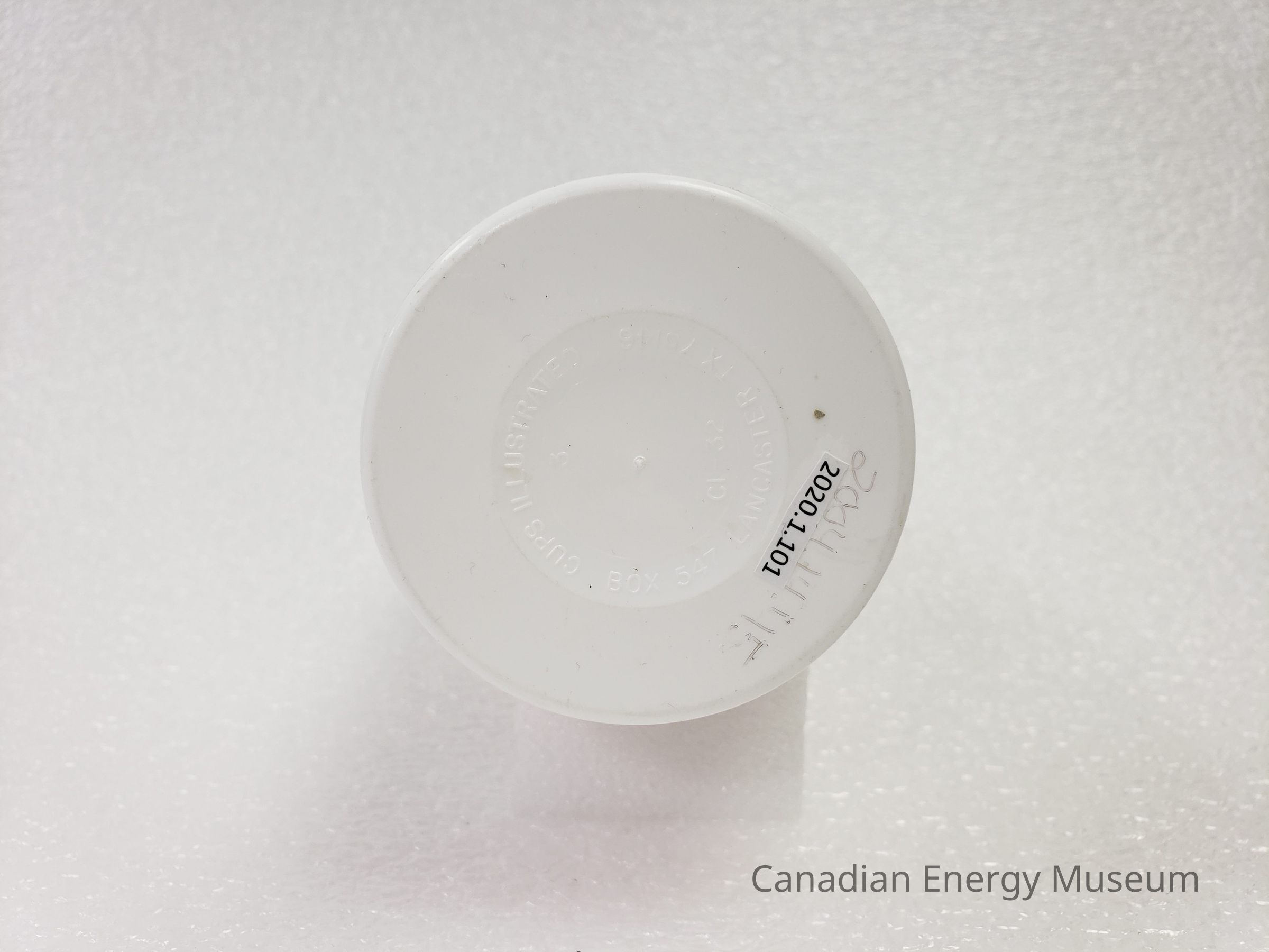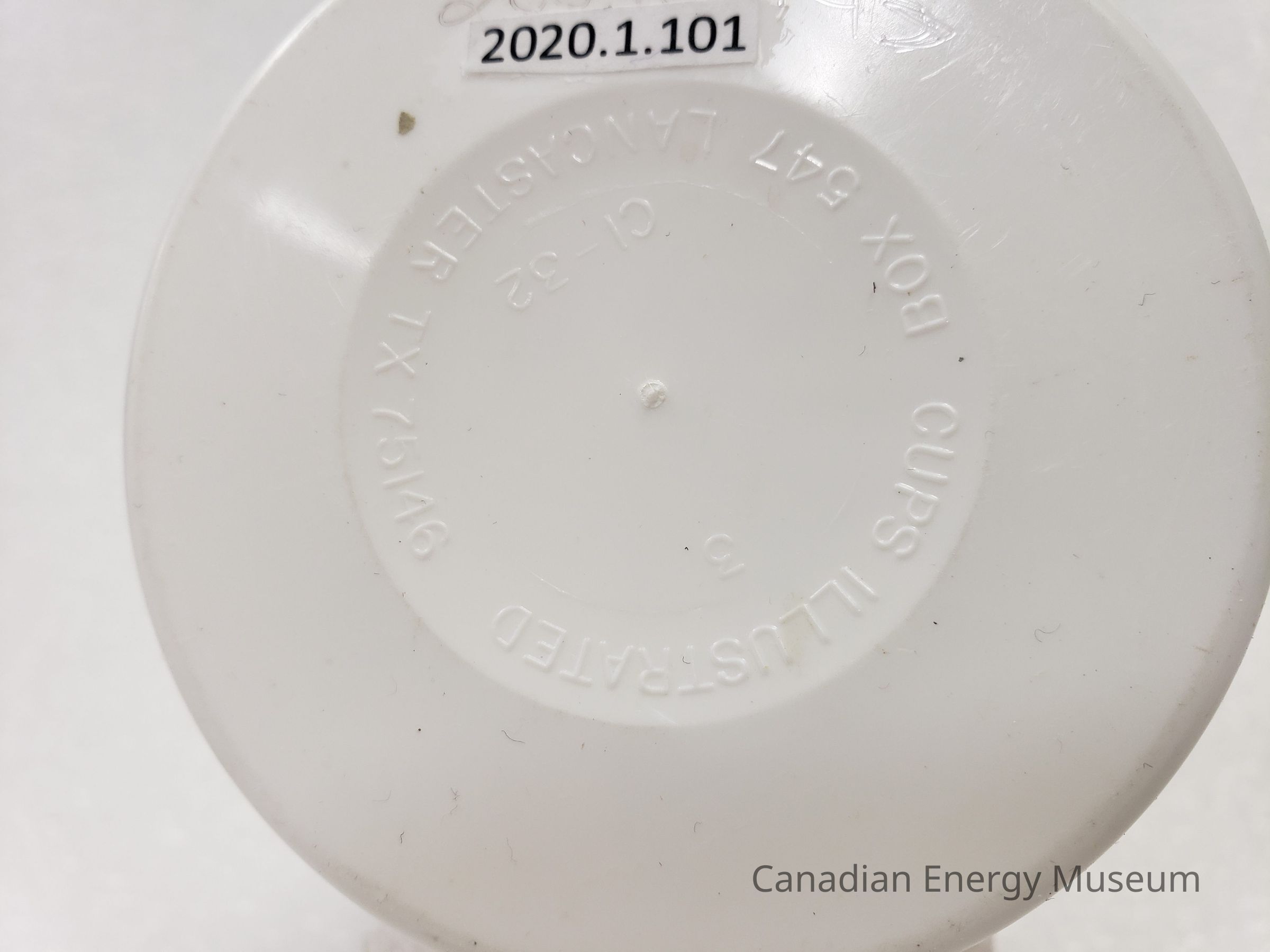 Features: This is a large cup, made from white plastic. Below the rim is a broad apron. On the body of the cup are two prints including the text in red "Texaco" and "Tanker", between which is a black lineart image of a fuel tanker, coloured in grey and red. The lip is thickened (2mm x 3mm), with a 1mm ledge 24mm below the lip. The base has a shallow rounded indent 25mm from the edge. Following the curve of this indent is the following text raised in the plastic: "CUPS ILLUSTRATED; BOX 547 LANCASTER TX 75146"; "CI-32"; and "3".