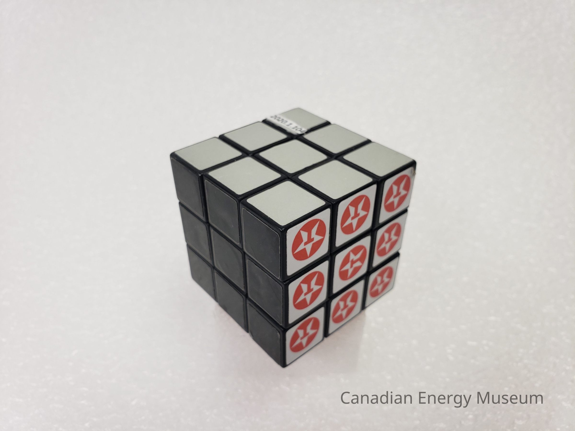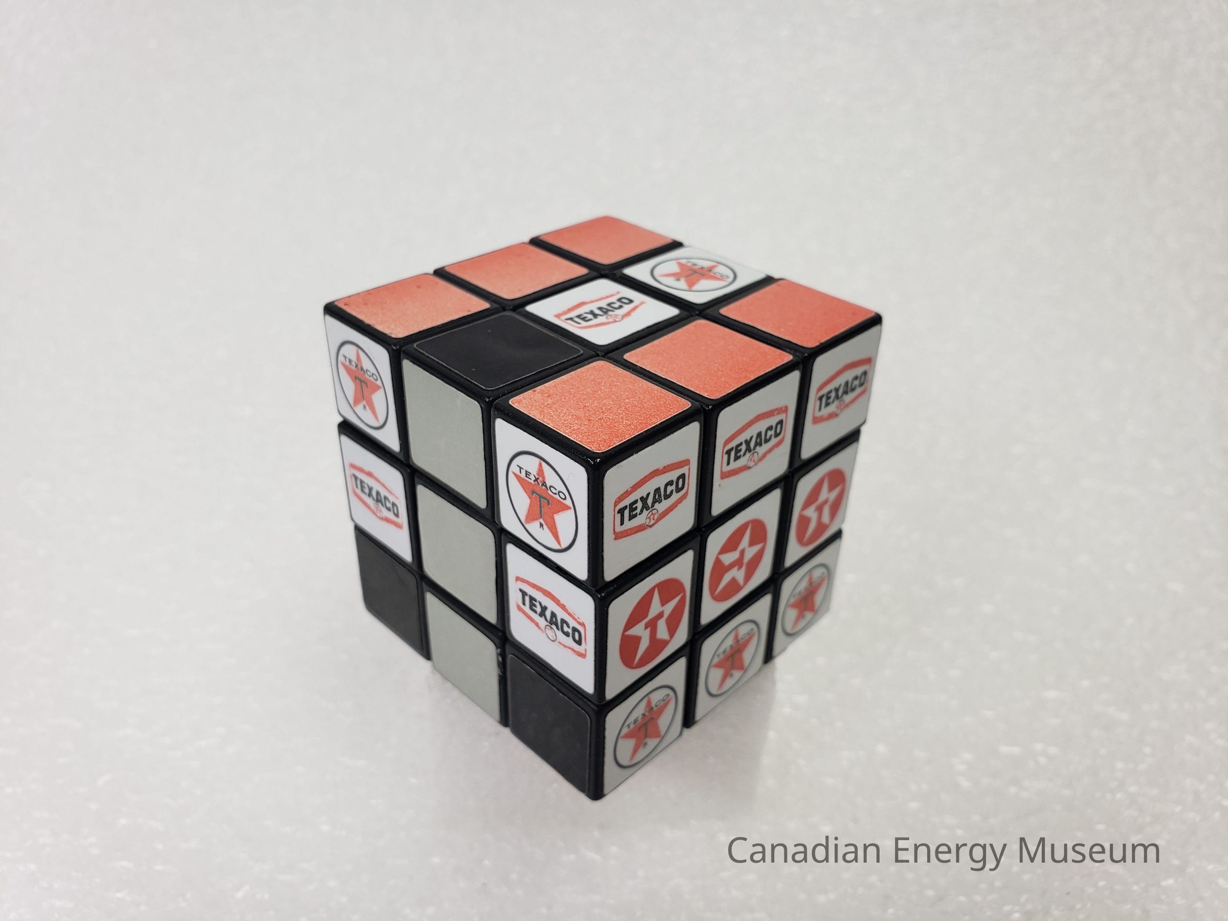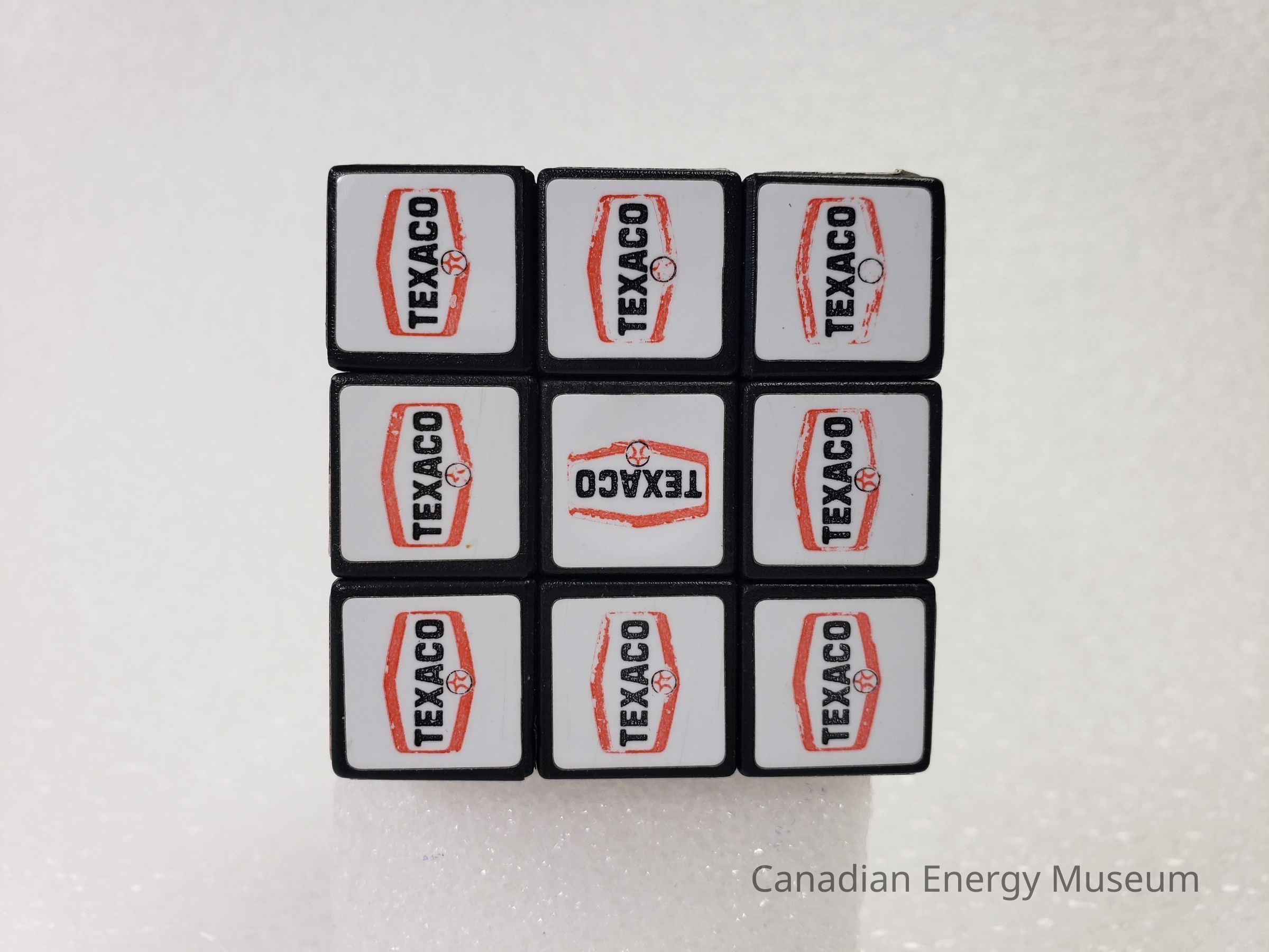 Old Description (Kelsey Dalrymple, 2/10/2020): Solved plastic Rubik's cube. Three sides are grey, black and red. The other three sides have three different variations of the Texaco logo.Collection