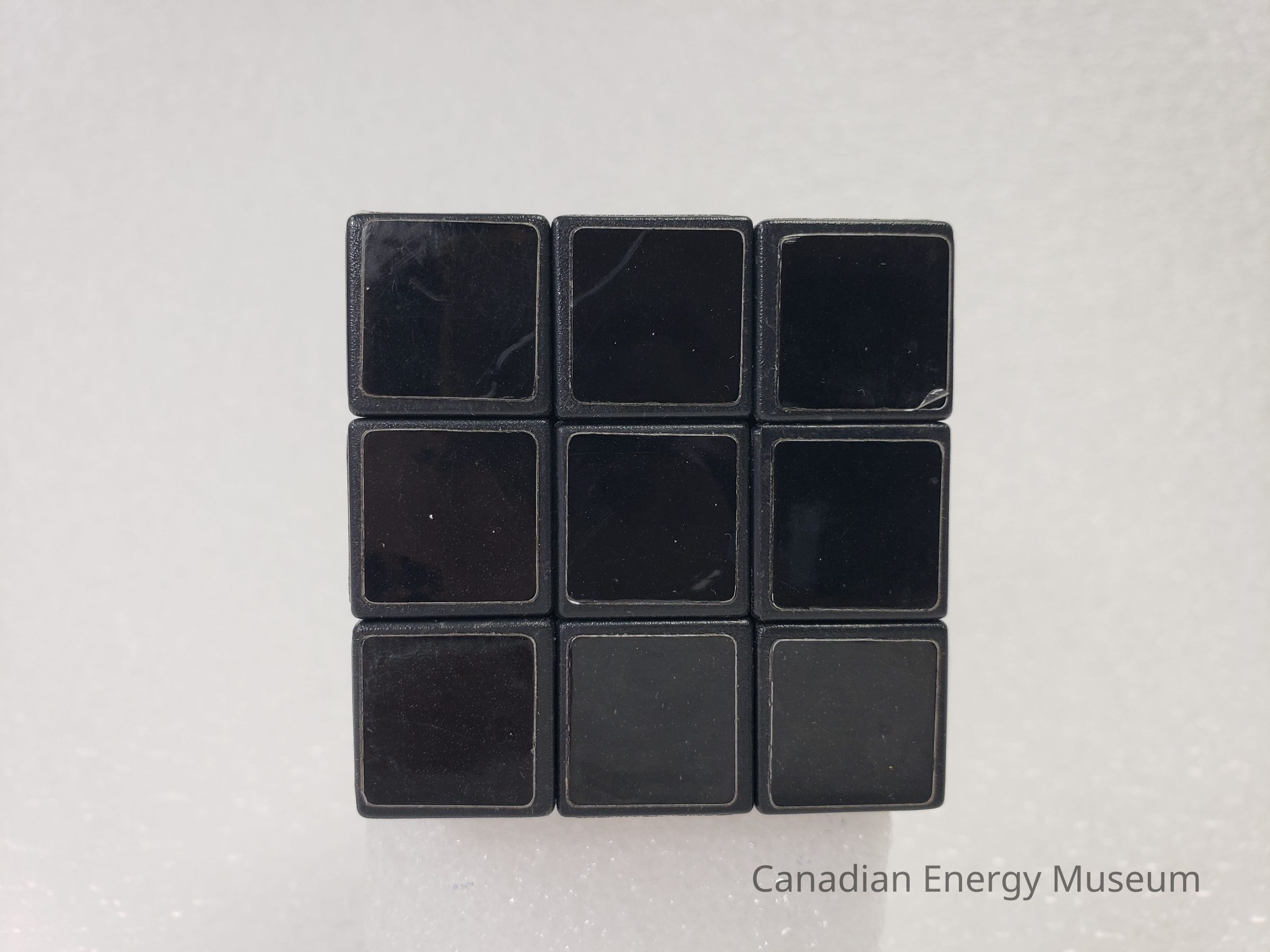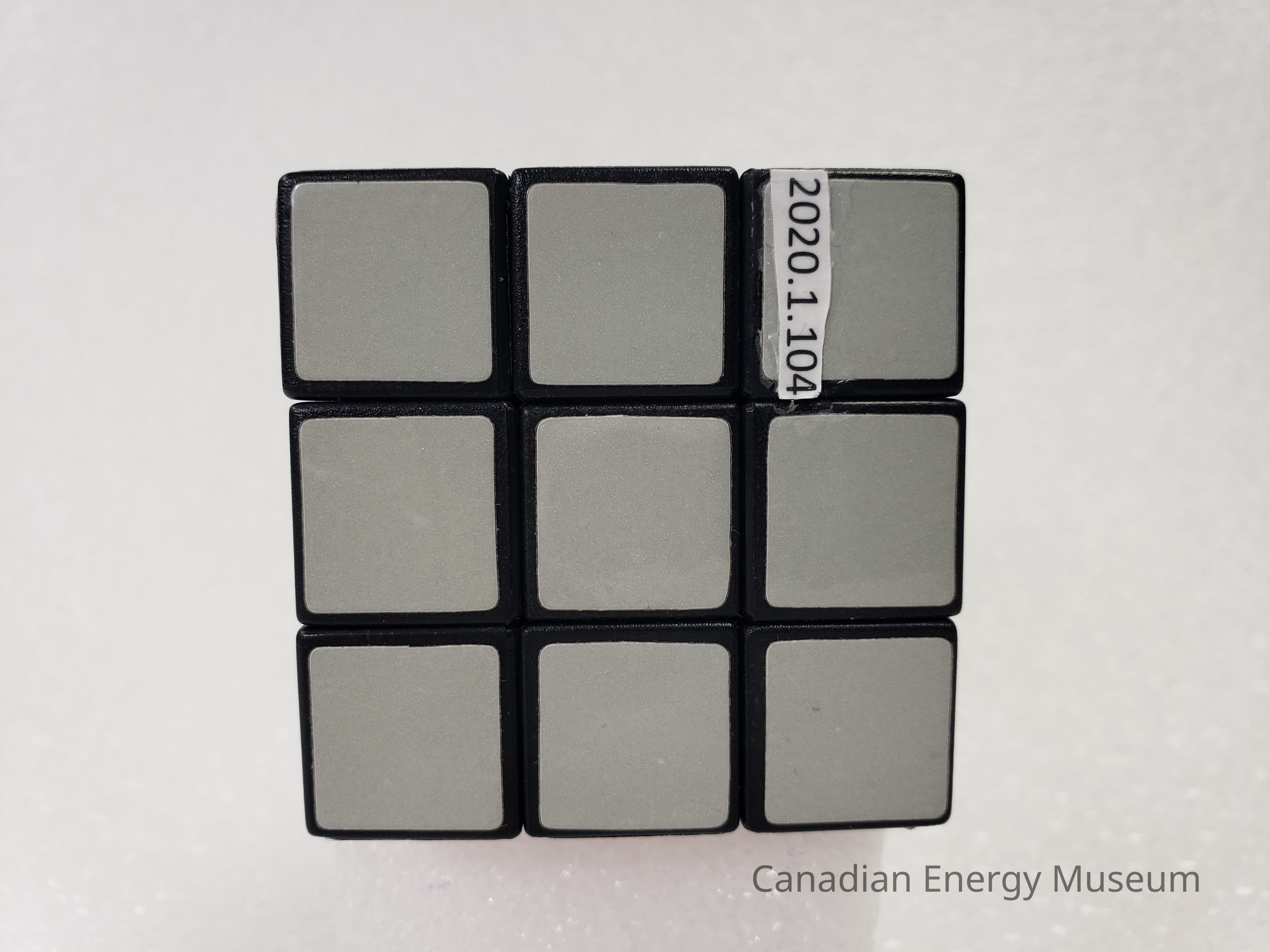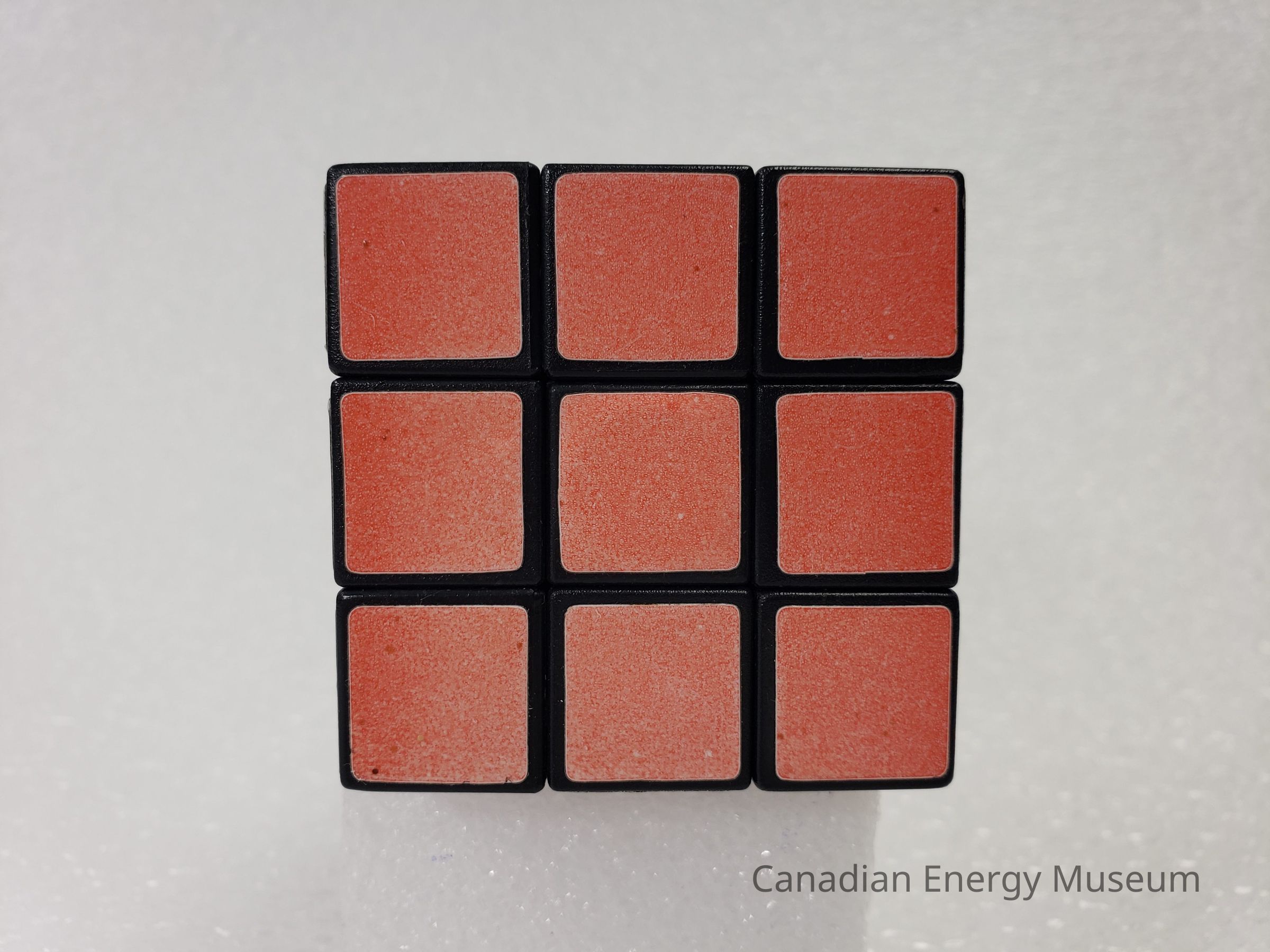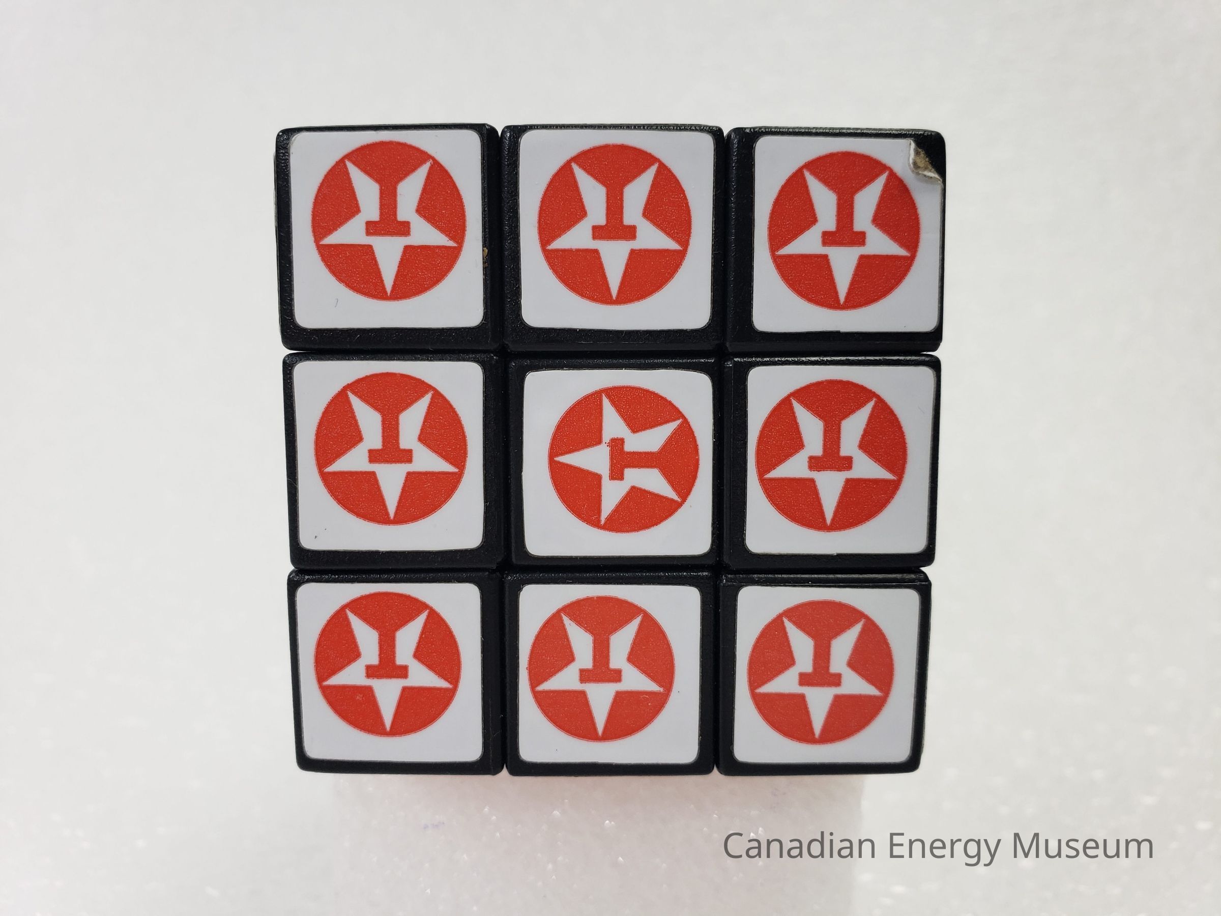 Old Description (Kelsey Dalrymple, 2/10/2020): Solved plastic Rubik's cube. Three sides are grey, black and red. The other three sides have three different variations of the Texaco logo.Collection