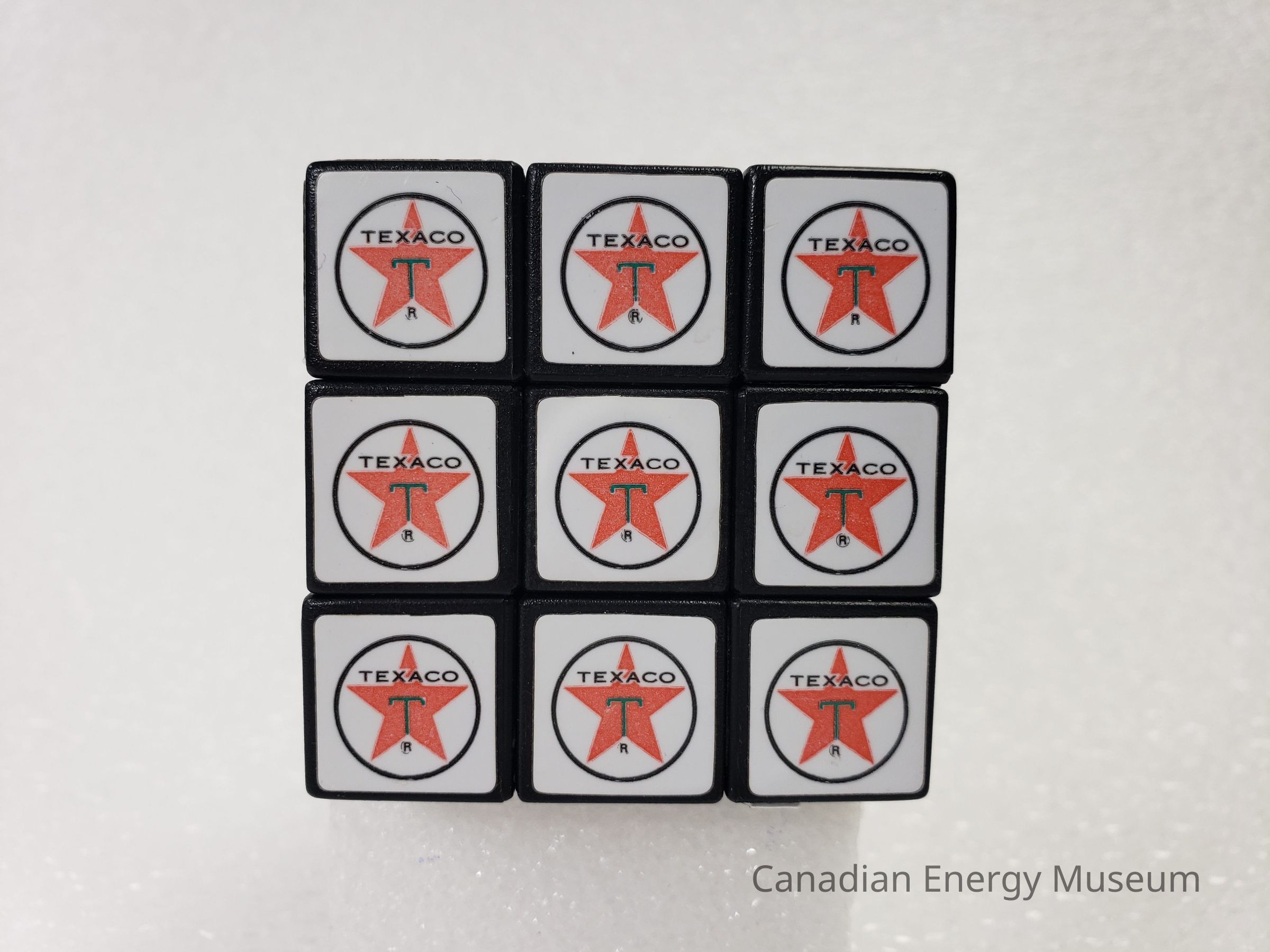 This 3x3 puzzle cube is made from black plastic with Texaco theme stickers on the surface of each square. Internal mechanisms are likely metal. Each side contains 9 squares, with matching stickers of either Texaco logos or flat colour.