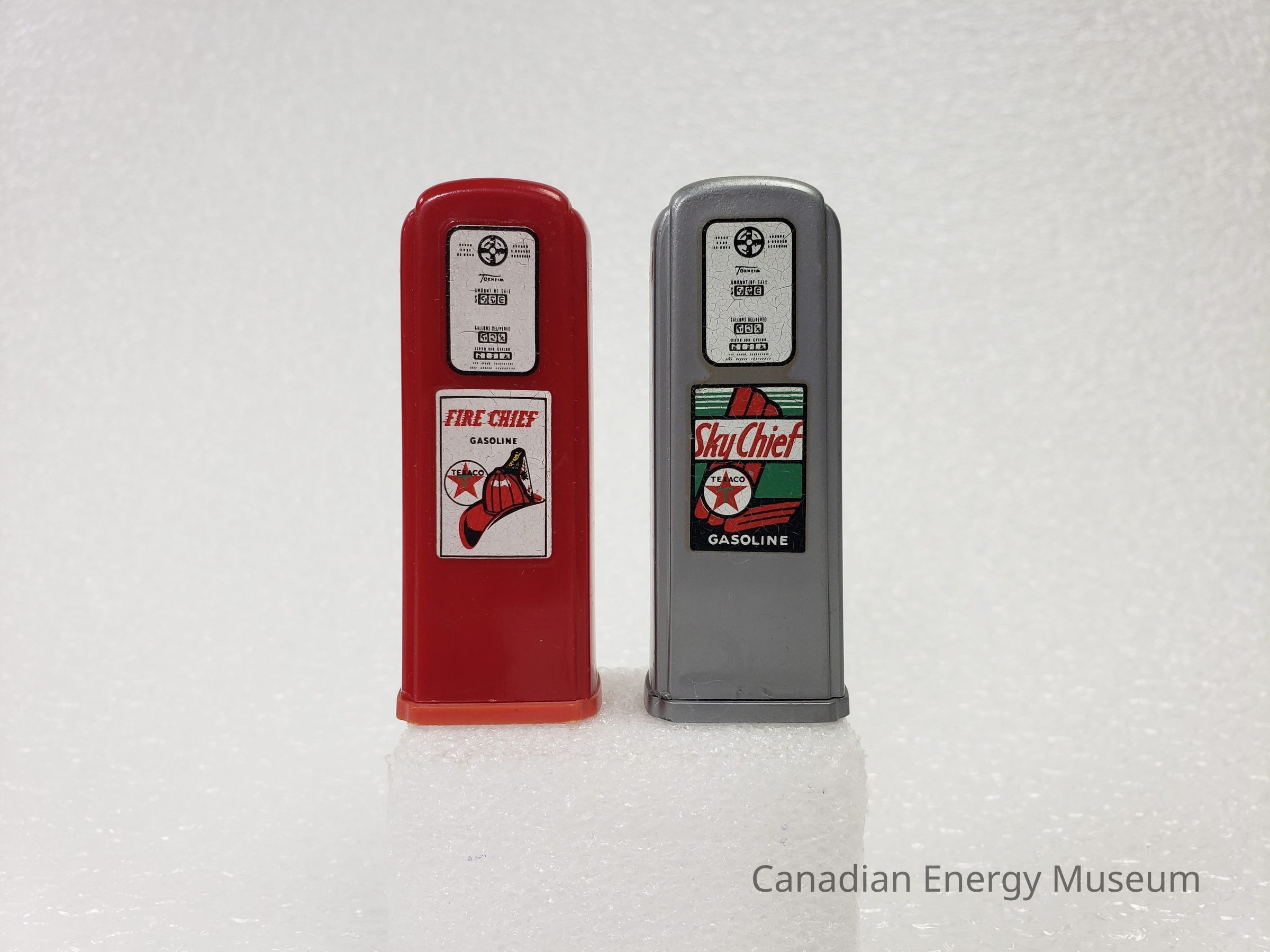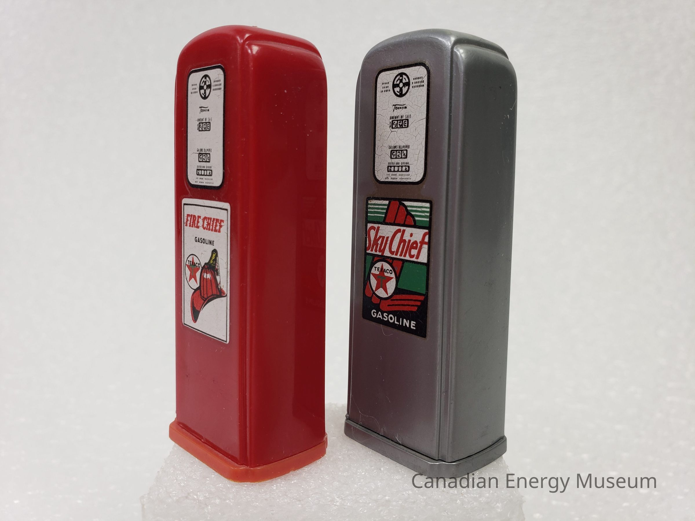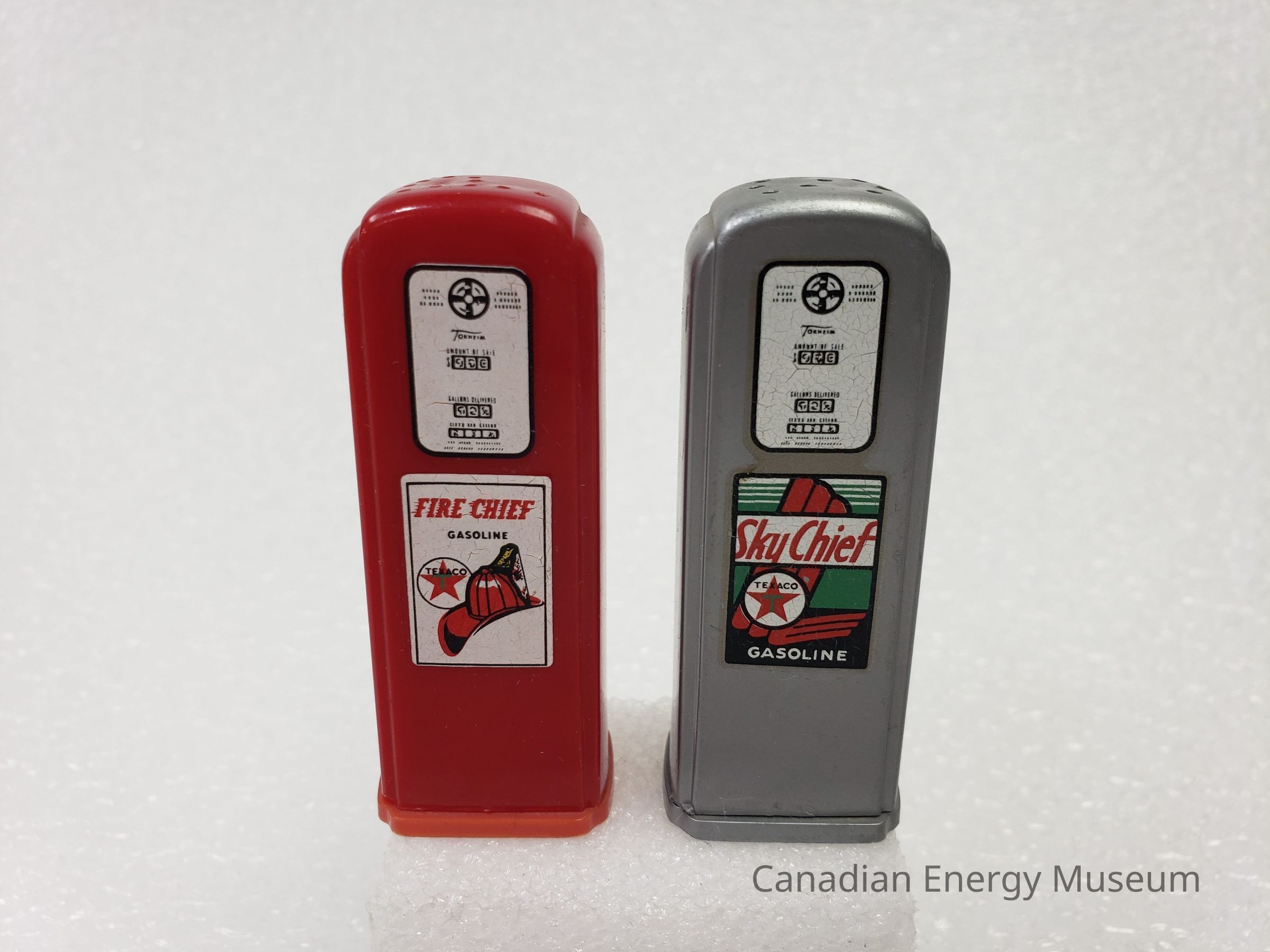 A set of salt and pepper shakers, shaped like gas pumps and branded to Texaco's Fire Chief and Sky Chief.