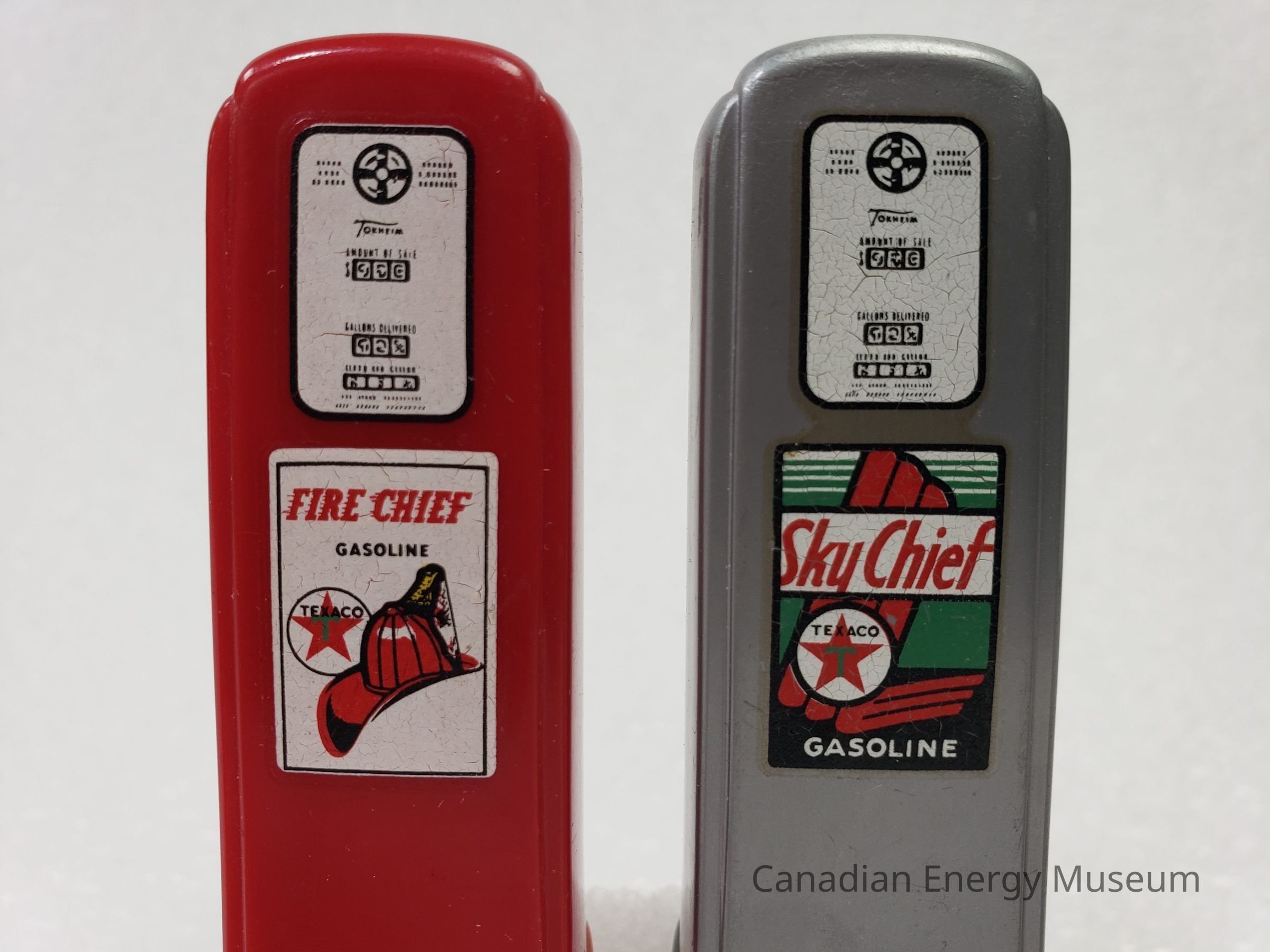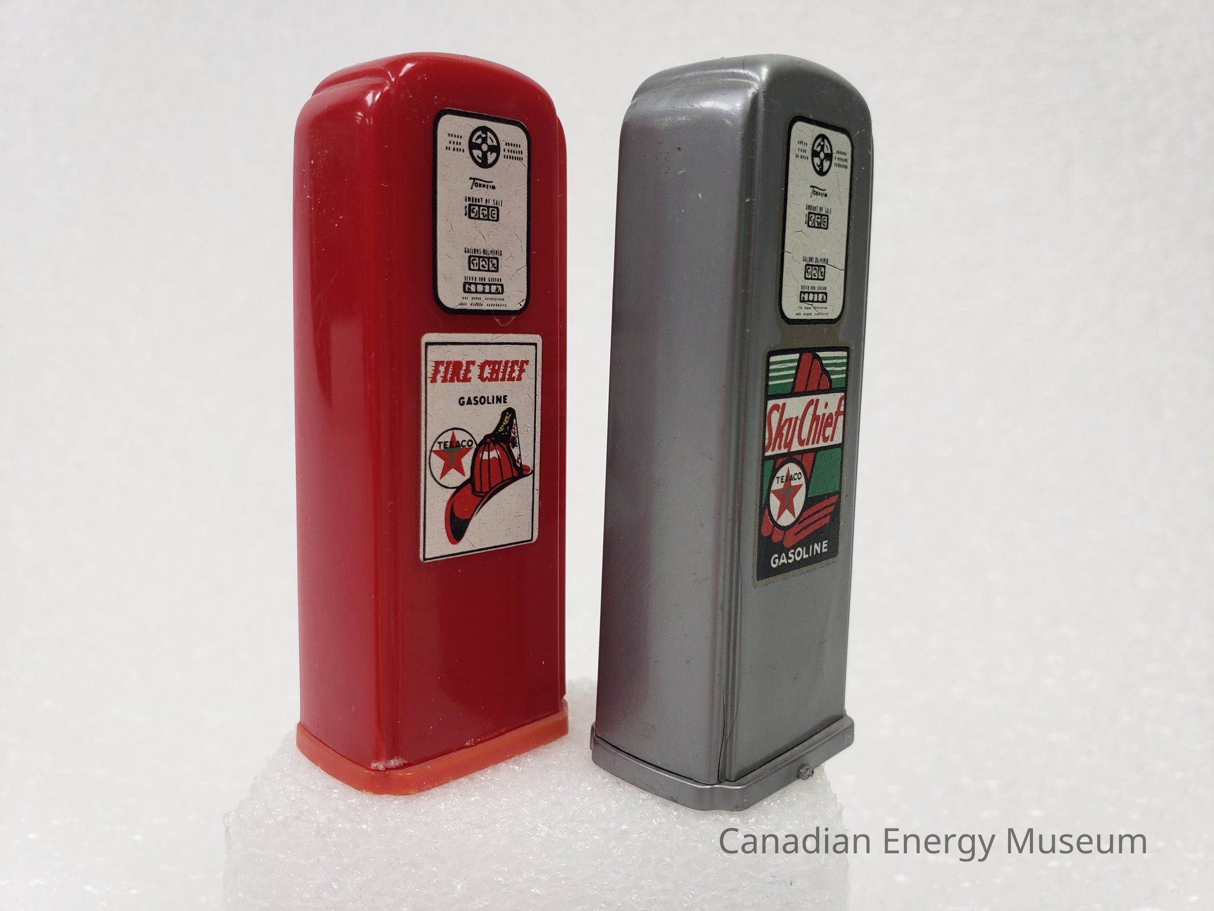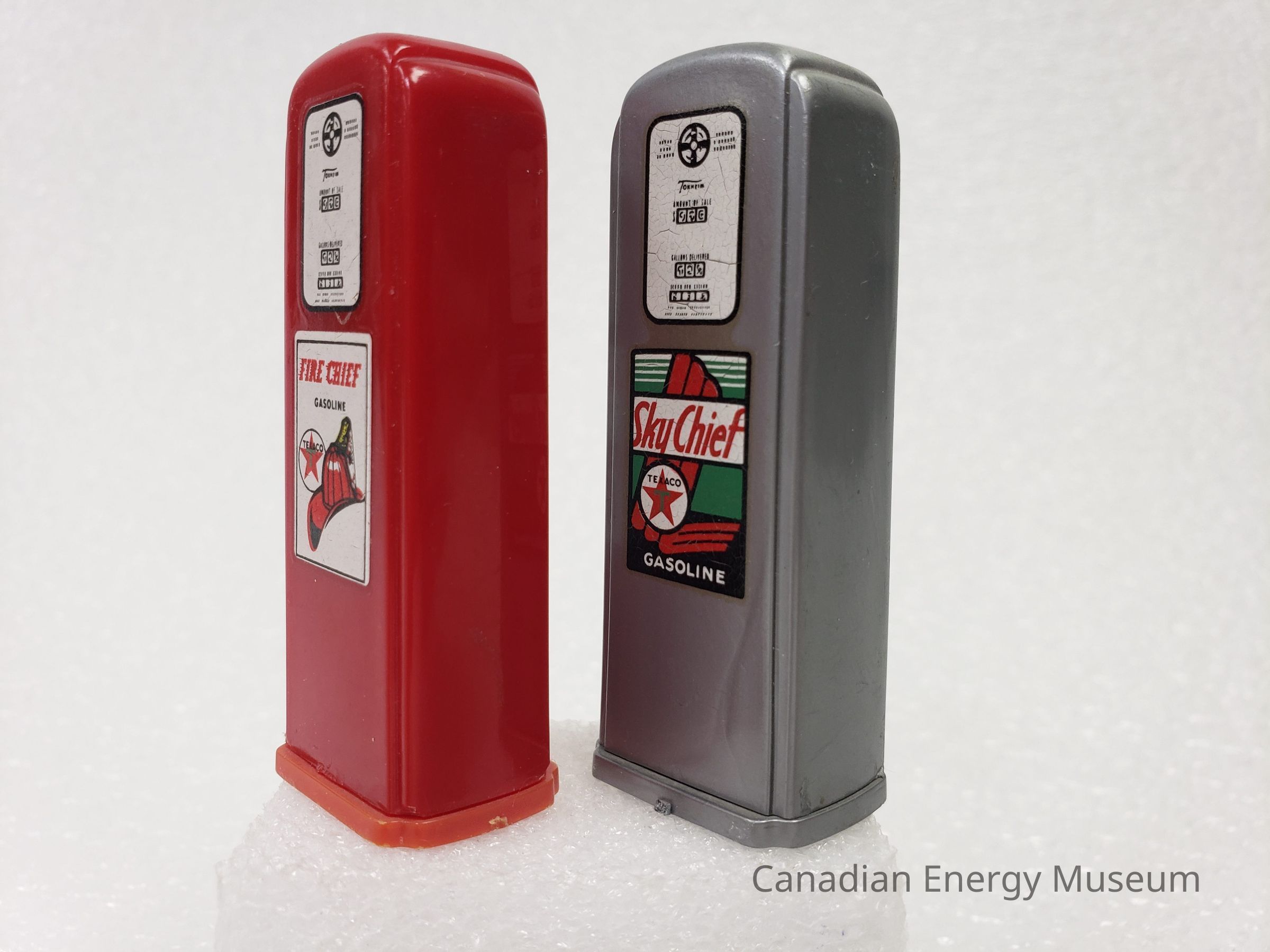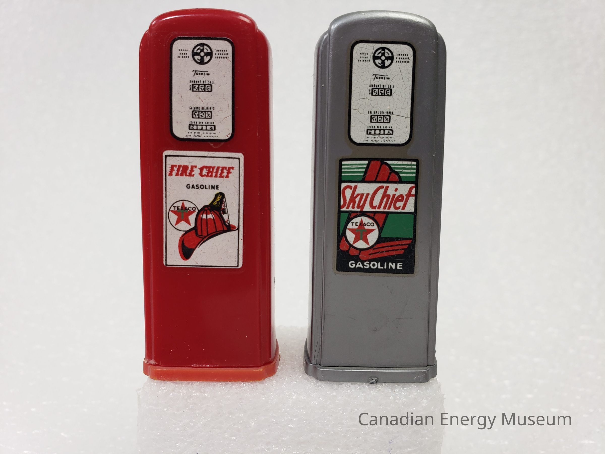 A set of salt and pepper shakers, shaped like gas pumps and branded to Texaco's Fire Chief and Sky Chief.