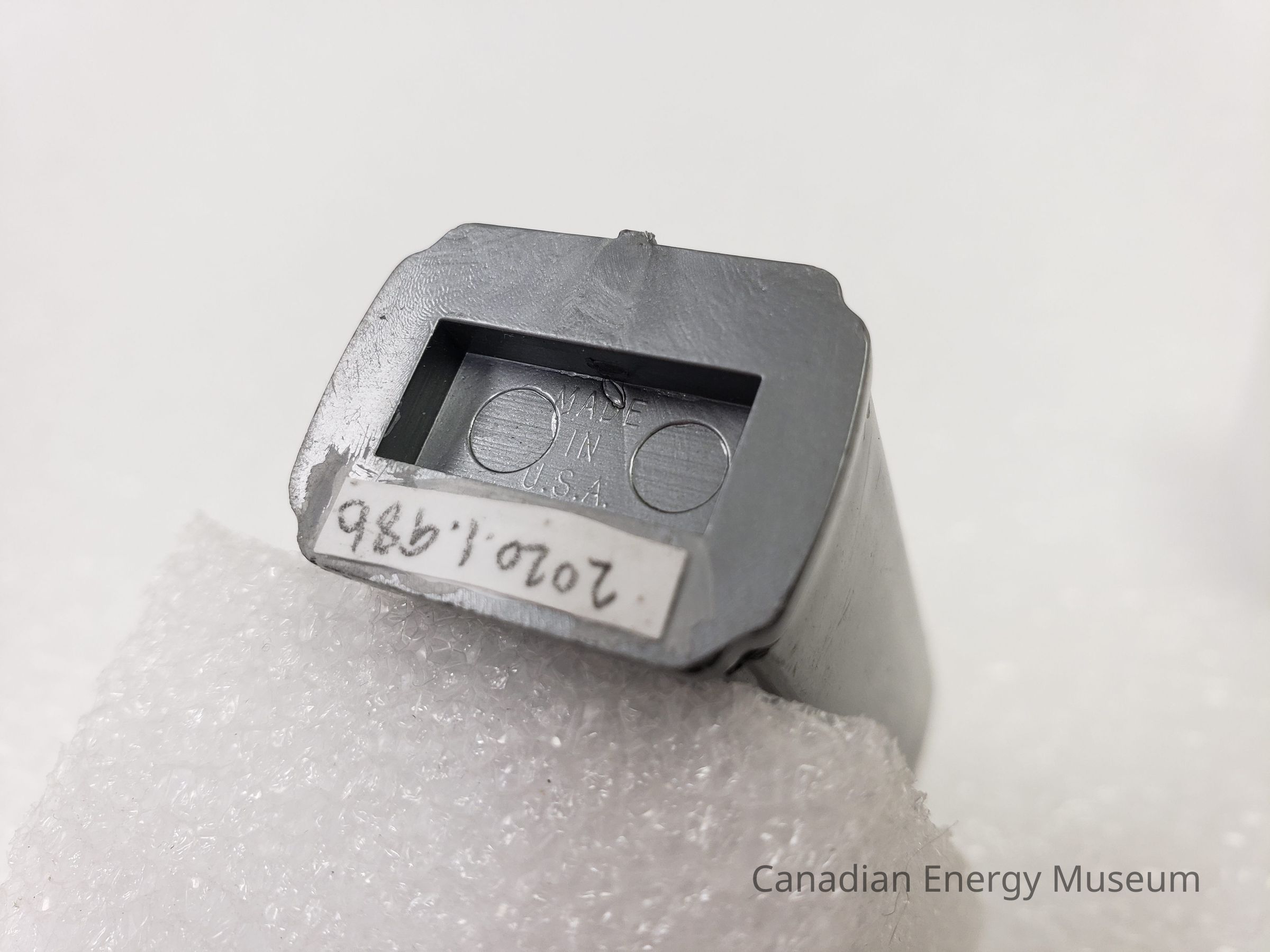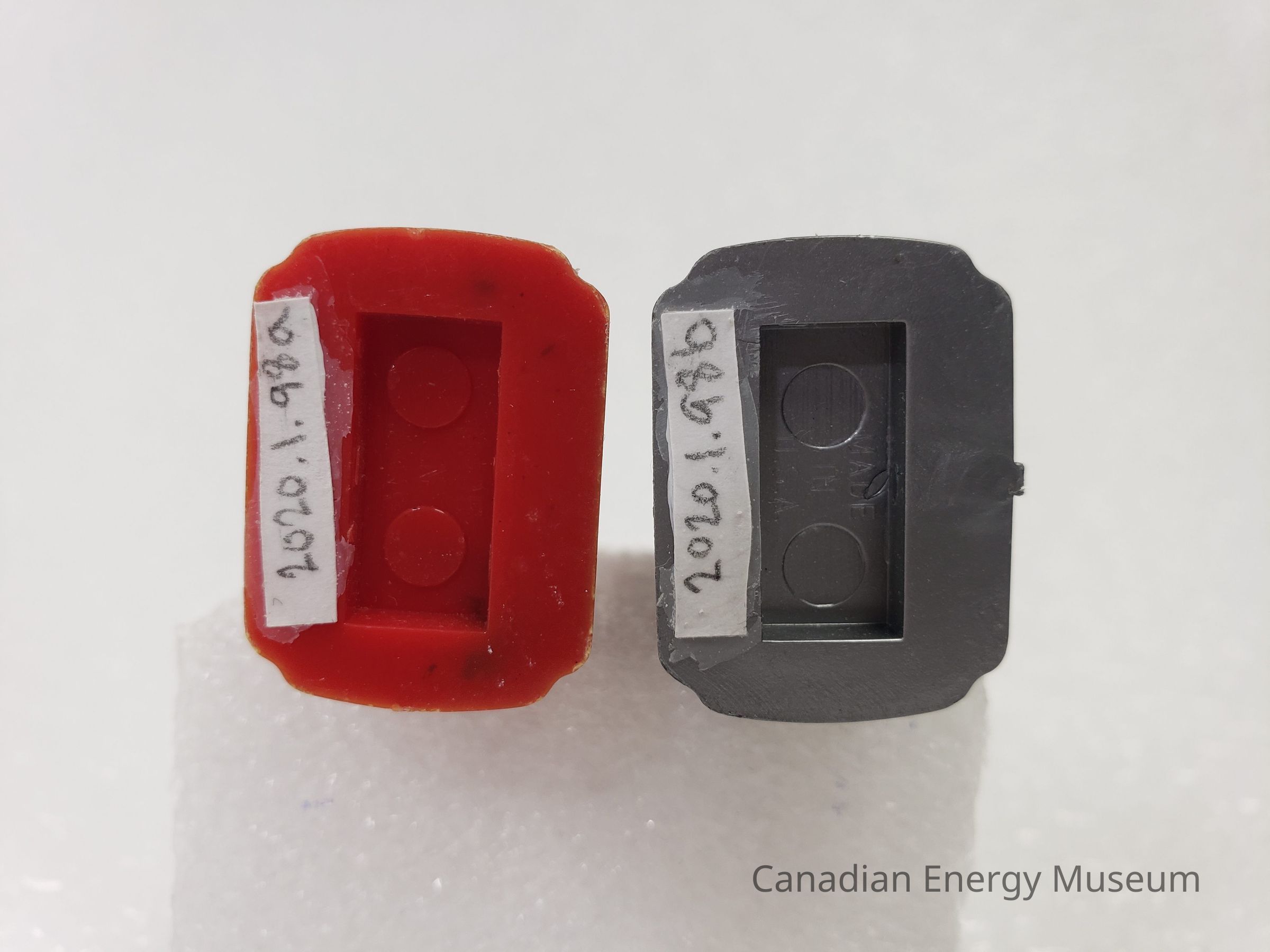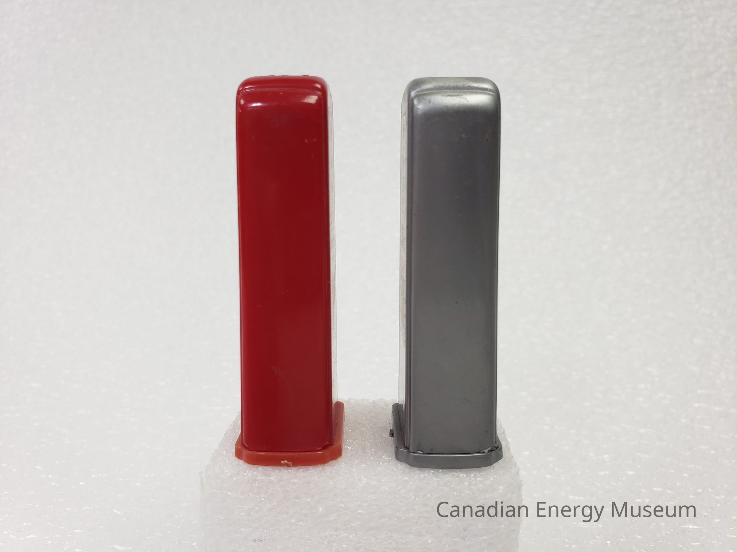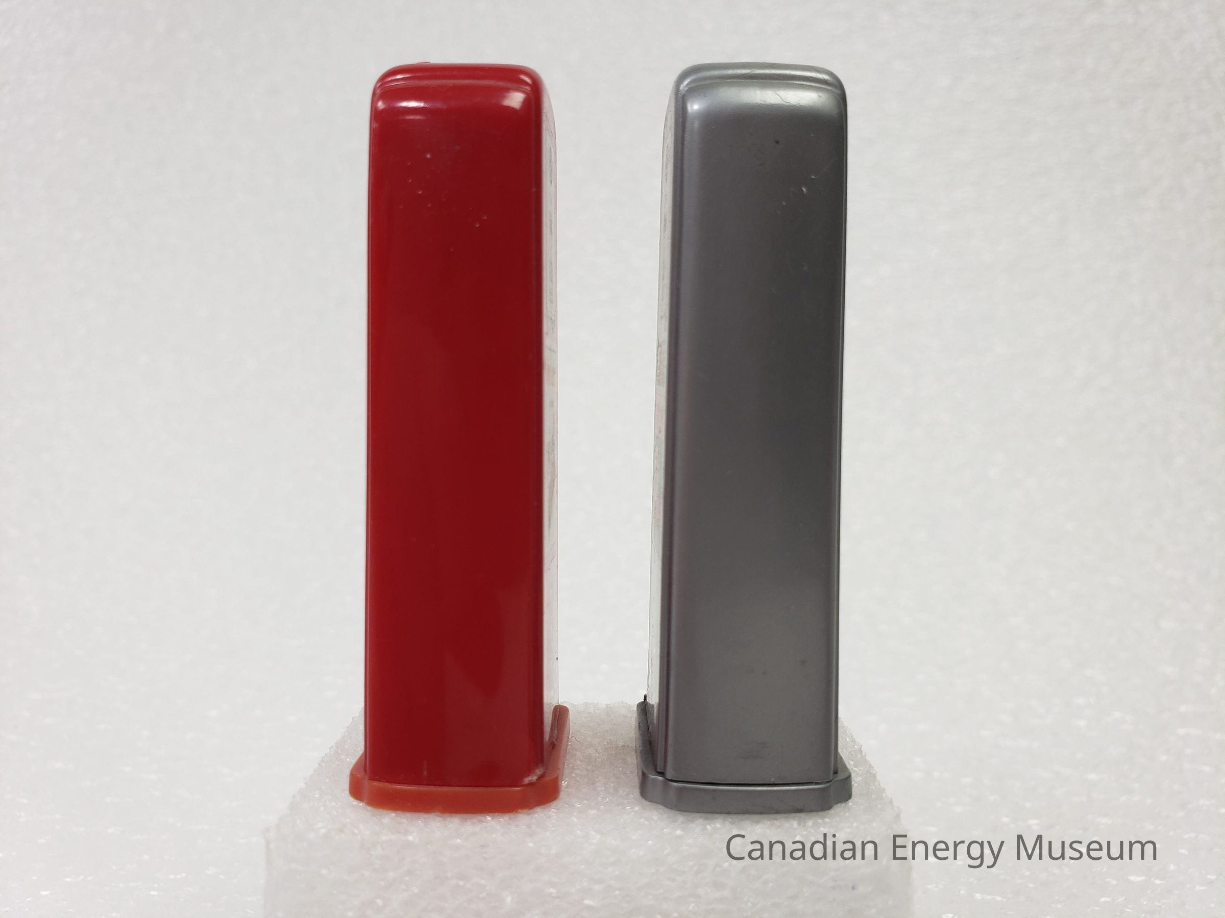 A set of novelty salt and pepper shakers moulded into the shape of gas pumps, likely modelled off a mid-century Tokheim design. The shape is a uniform vertical width, with art deco style shaping to either side, and a lightly widened base (which can be pulled loose to refill the shakers). The top of the shakers each has the relative letter "S" or "P" composed of holes (through which the salt/pepper is dispensed). The underside has the moulded text "MADE IN U.S.A" on each shaker.