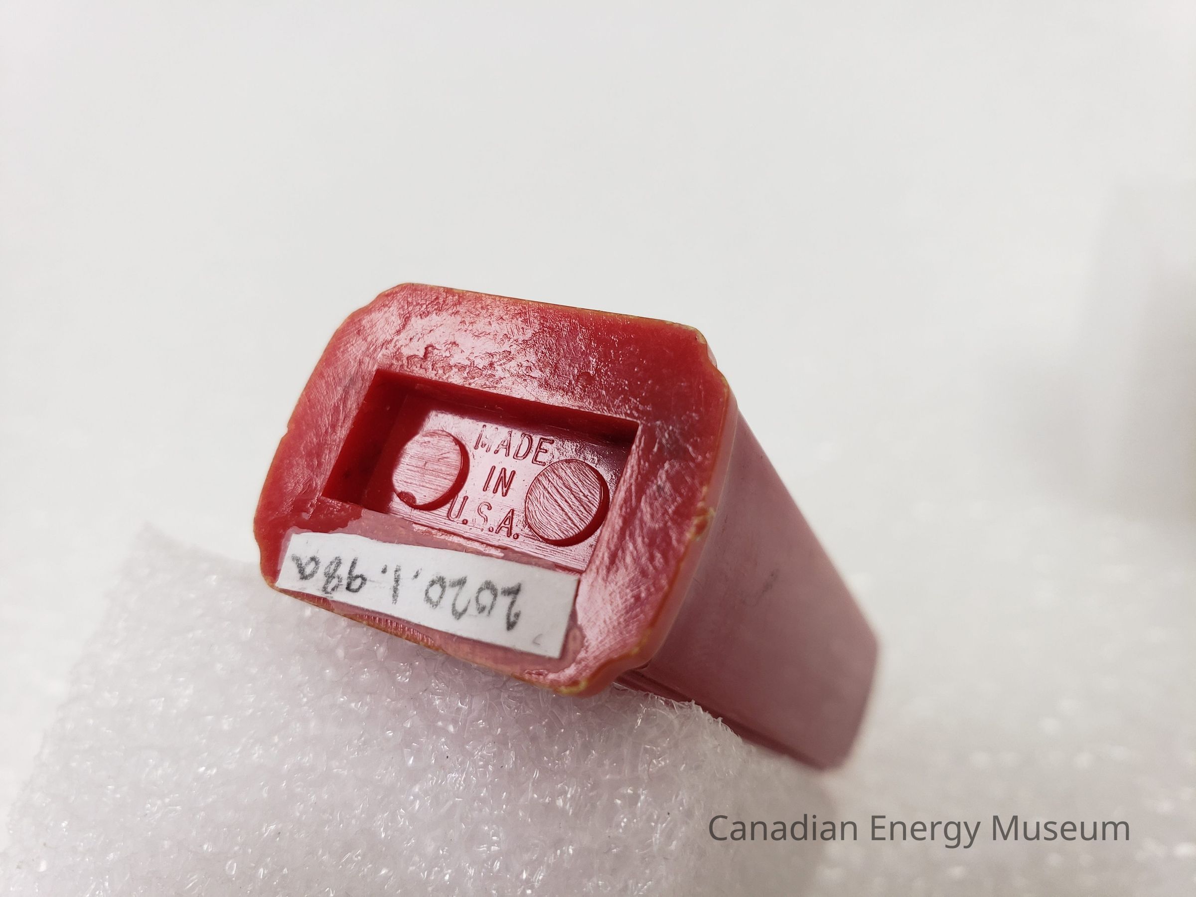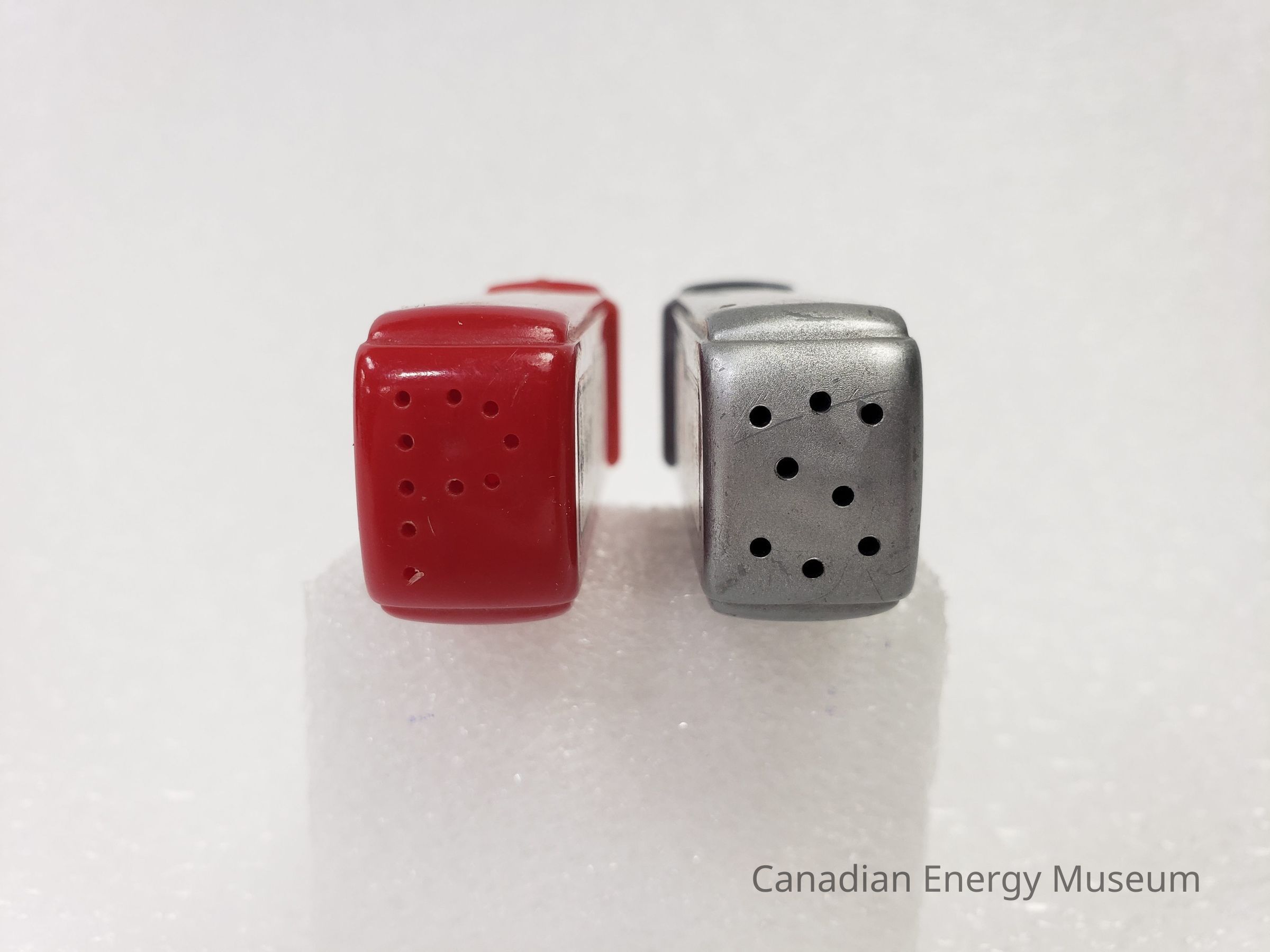 Old Description (Kelsey Dalrymple, 2/10/2020): a) Novelty pepper shaker in the shape of a gas pump. Shaker is red with stickers advertising Texaco Fire Chief gasoline. Perforation in shape of a "P" on top to indicates it is for pepper.