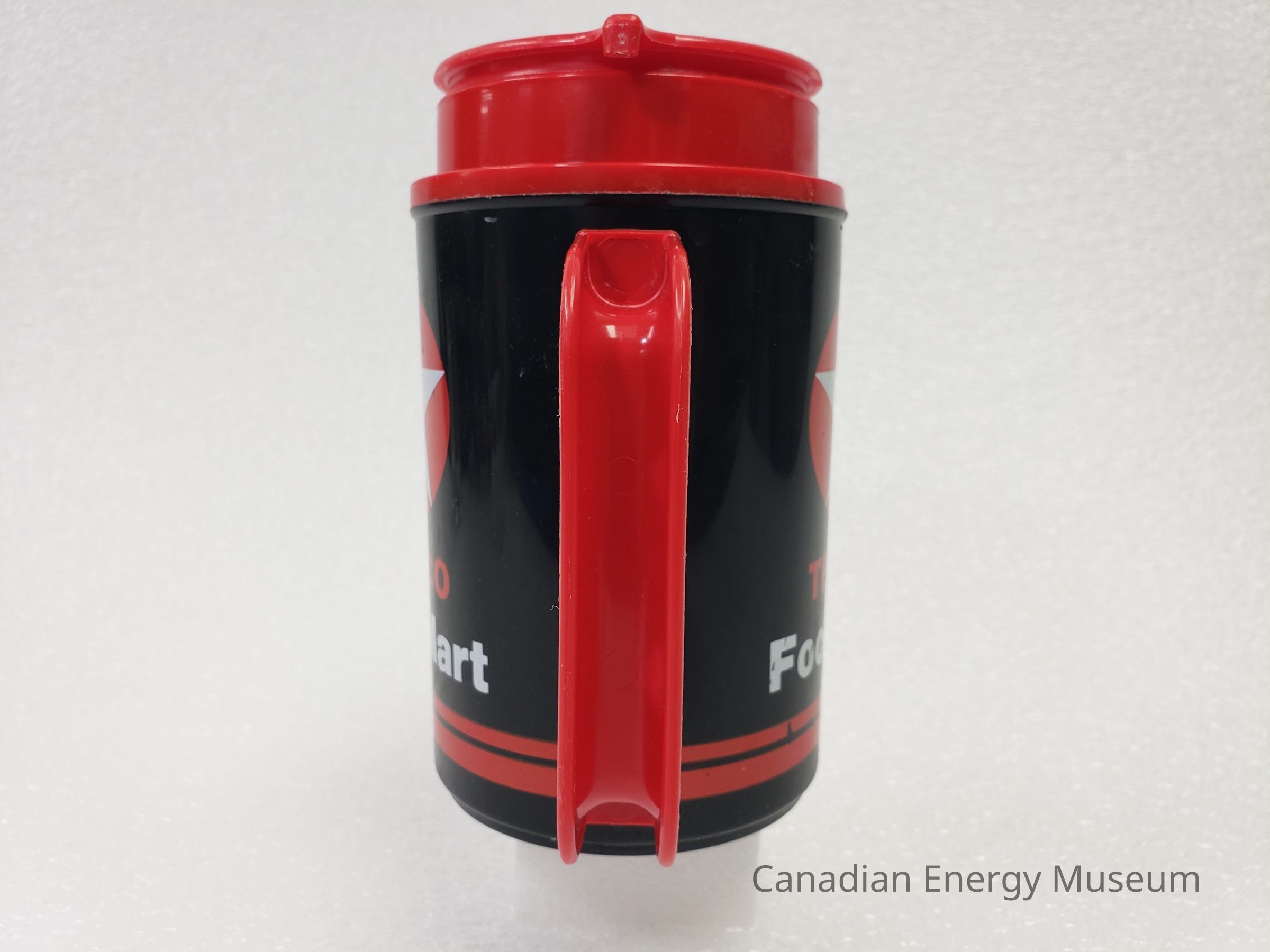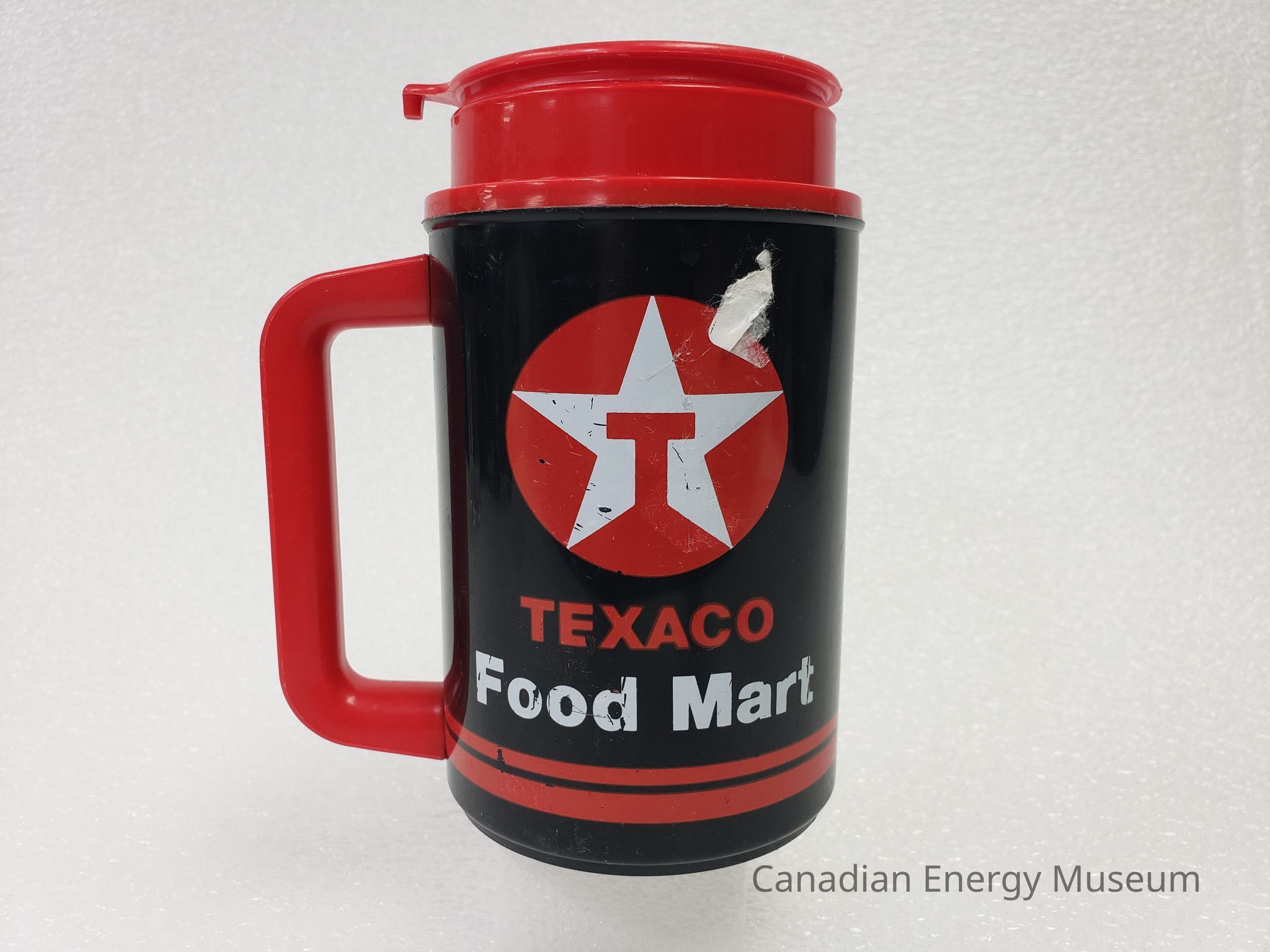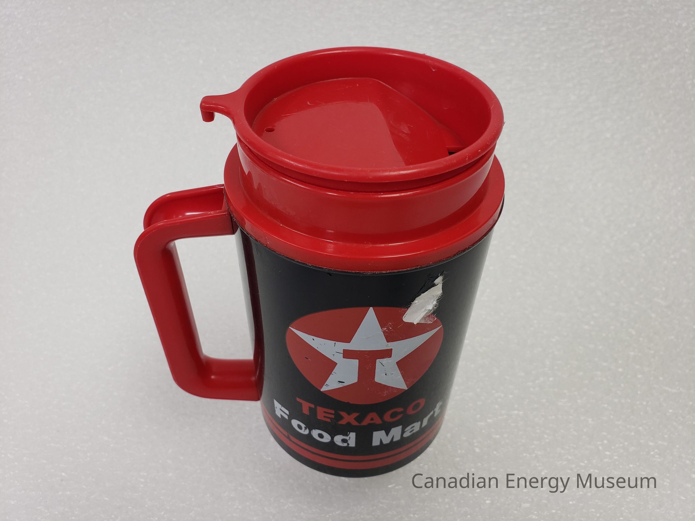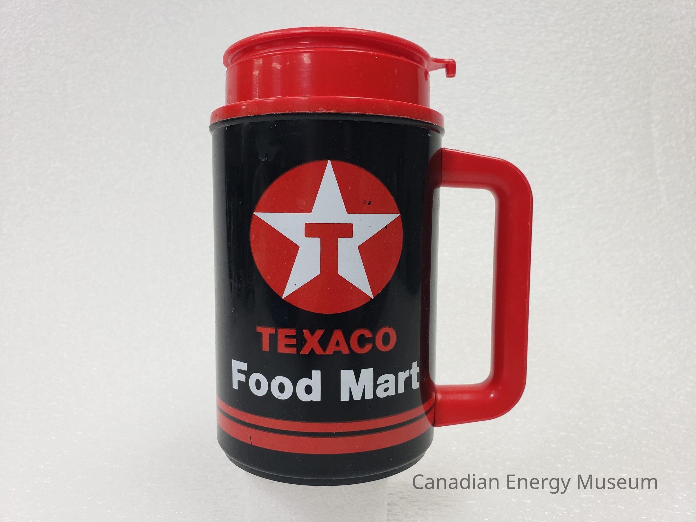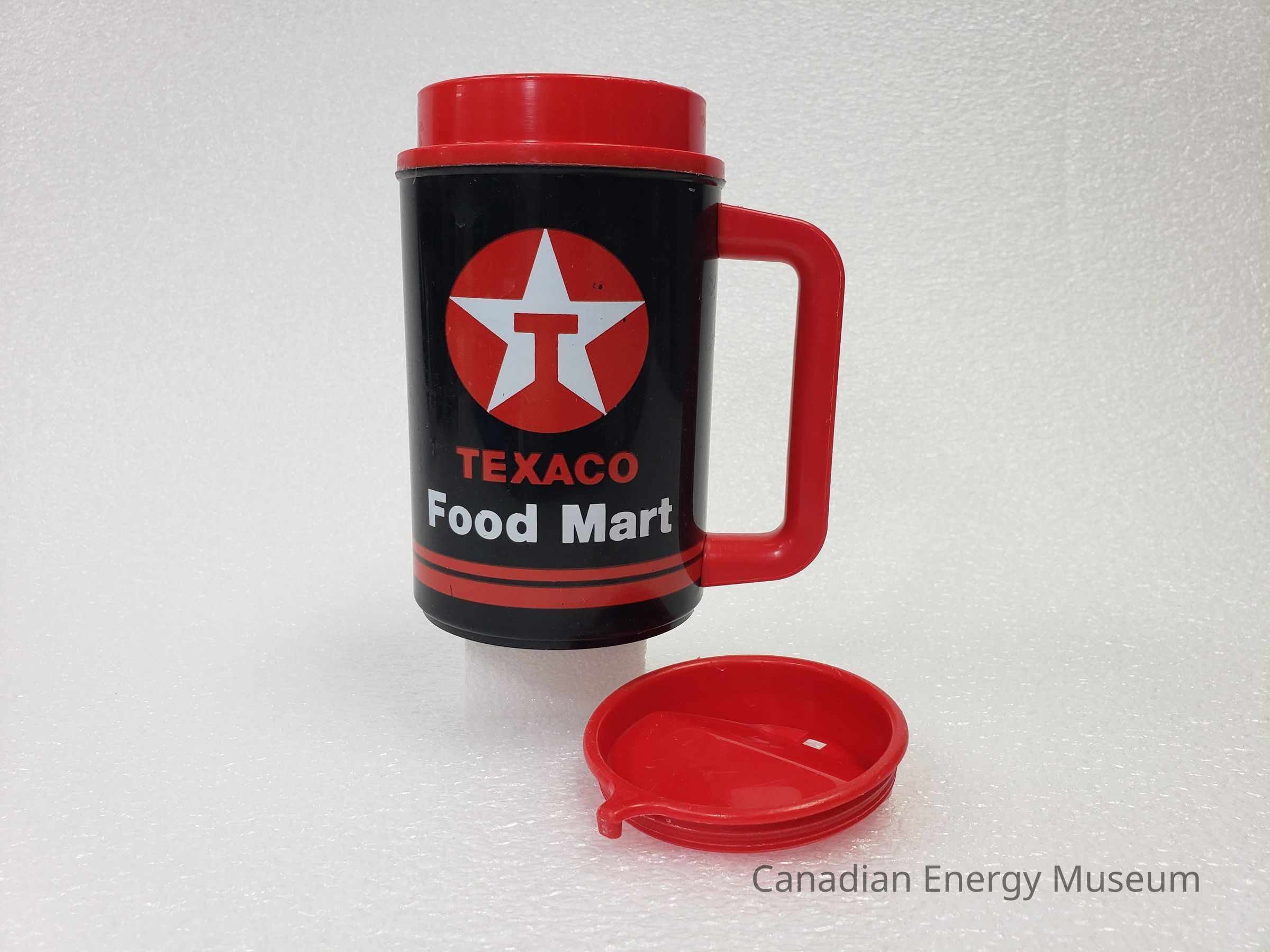This is a double-walled travel mug/thermos, in red plastic, with a removable lid (also in red plastic). The mug is barrel-shaped, with a consistent shape from the lip to the base (which rounds under). At the top of the mug is a tall lip and at the base of the lip is a flat disc that is slightly wider than the rest of the body. The body of the mug is coloured black, with the following design details: In the upper portion of the mug is Texaco's round start logo (red circle, white star, red "T"); below the logo is the red block text "TEXACO"; and underneath again is the white block text "Food Mart". These design elements appear twice, on either side of the handle. Running around the circumference of the mug (a medium-thickness line on top, and a thick line at the bottom). The handle is tall and rectangular, with rounded corners. The lid fits inside of the lip of the mug and secures with a double ring of ridges. The drinking side has a sunken area leading to a small rectangular hole. On the opposite side is a small hole and a hooked tab for assistance in removing the lid. On the base of the mug, on the lightly recessed surface are the following moulded details: "22oz. THERMOS"; "HOT!/COLD!"; and "WHIRLEY INDUSTRIES, INC.; WARREN, PA, U.S.A."