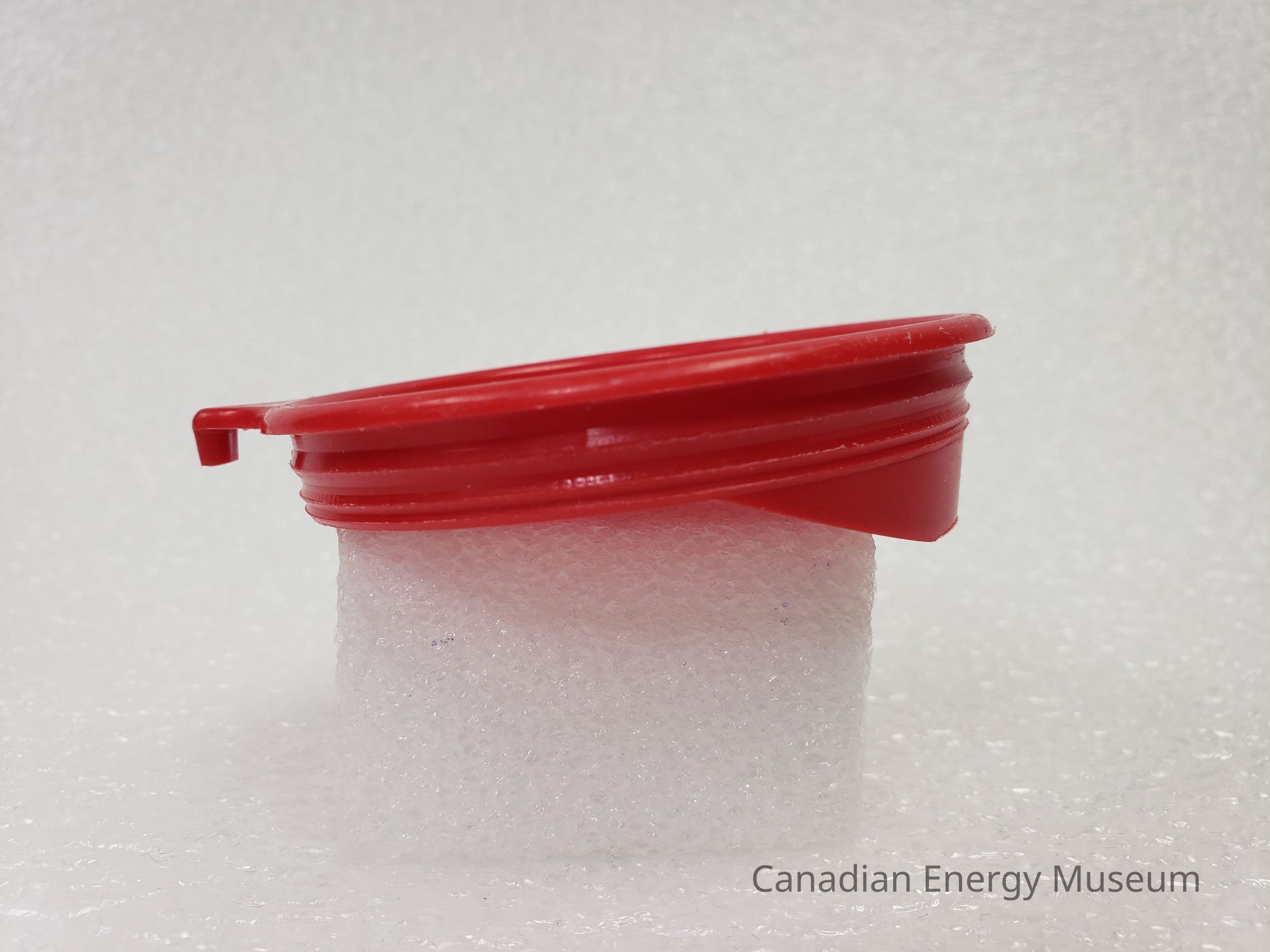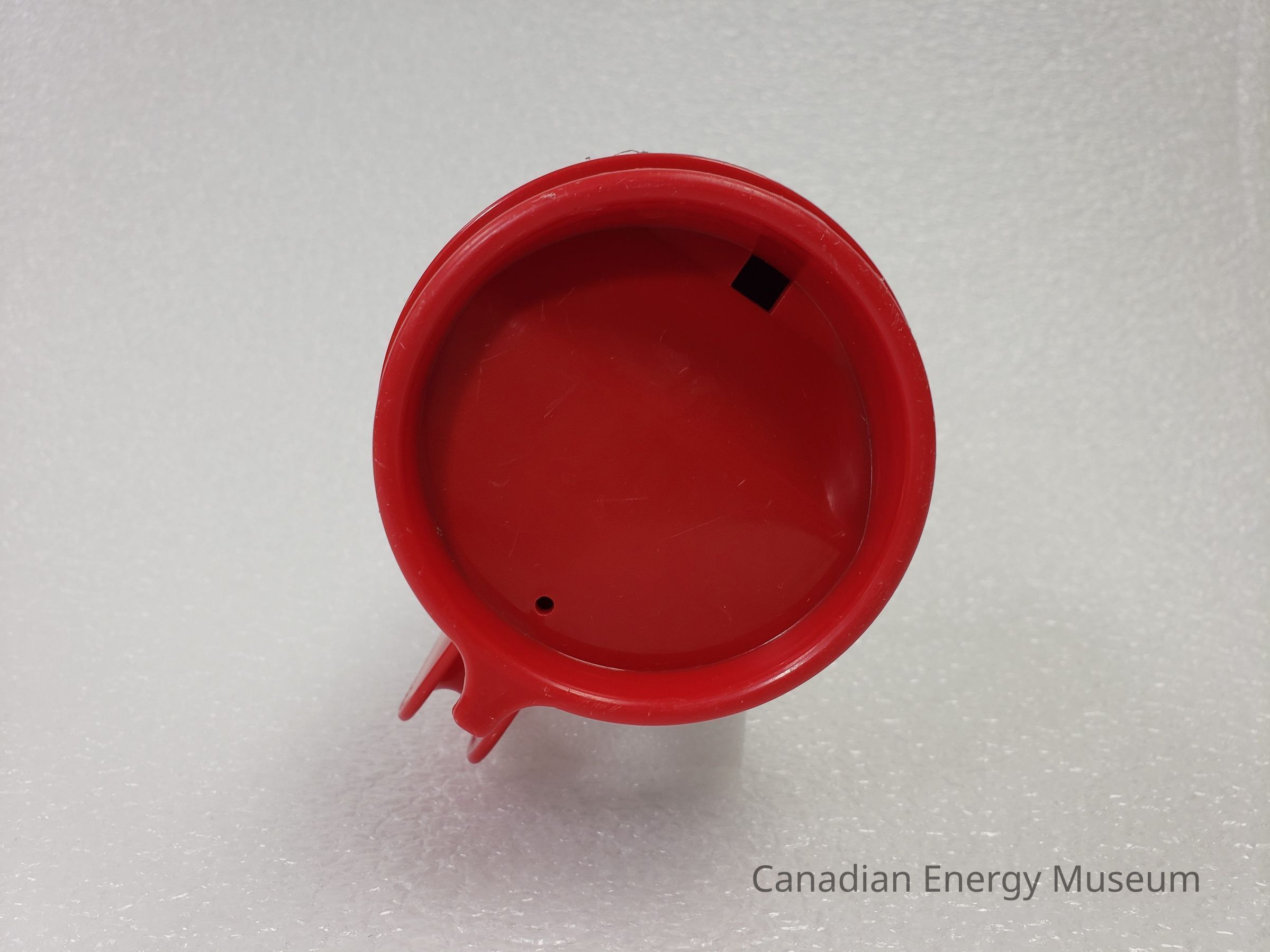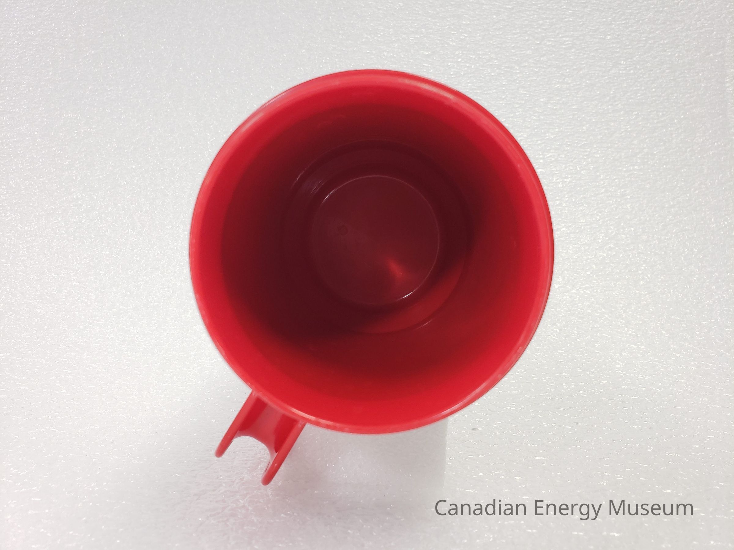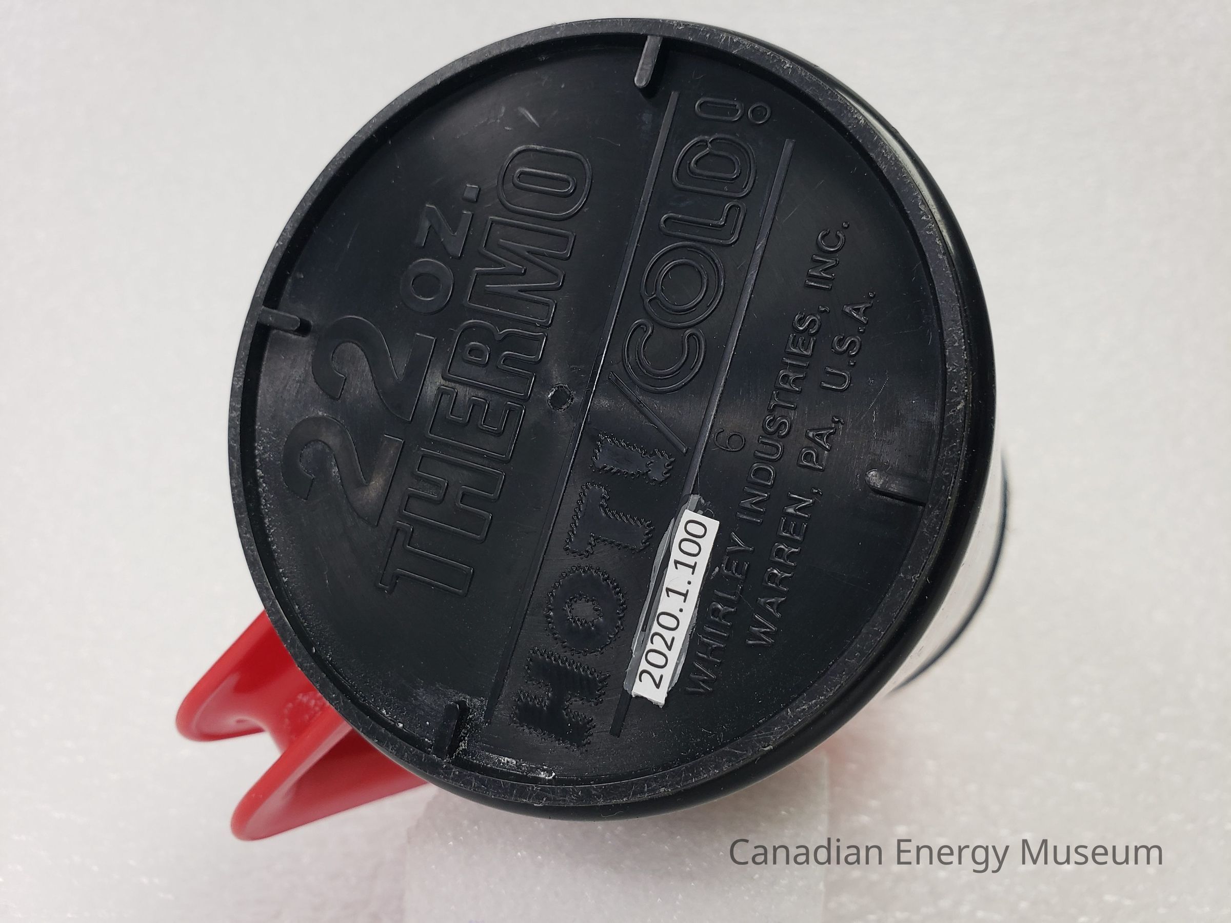 This is a double-walled travel mug/thermos, in red plastic, with a removable lid (also in red plastic). The mug is barrel-shaped, with a consistent shape from the lip to the base (which rounds under). At the top of the mug is a tall lip and at the base of the lip is a flat disc that is slightly wider than the rest of the body. The body of the mug is coloured black, with the following design details: In the upper portion of the mug is Texaco's round start logo (red circle, white star, red "T"); below the logo is the red block text "TEXACO"; and underneath again is the white block text "Food Mart". These design elements appear twice, on either side of the handle. Running around the circumference of the mug (a medium-thickness line on top, and a thick line at the bottom). The handle is tall and rectangular, with rounded corners. The lid fits inside of the lip of the mug and secures with a double ring of ridges. The drinking side has a sunken area leading to a small rectangular hole. On the opposite side is a small hole and a hooked tab for assistance in removing the lid. On the base of the mug, on the lightly recessed surface are the following moulded details: "22oz. THERMOS"; "HOT!/COLD!"; and "WHIRLEY INDUSTRIES, INC.; WARREN, PA, U.S.A."