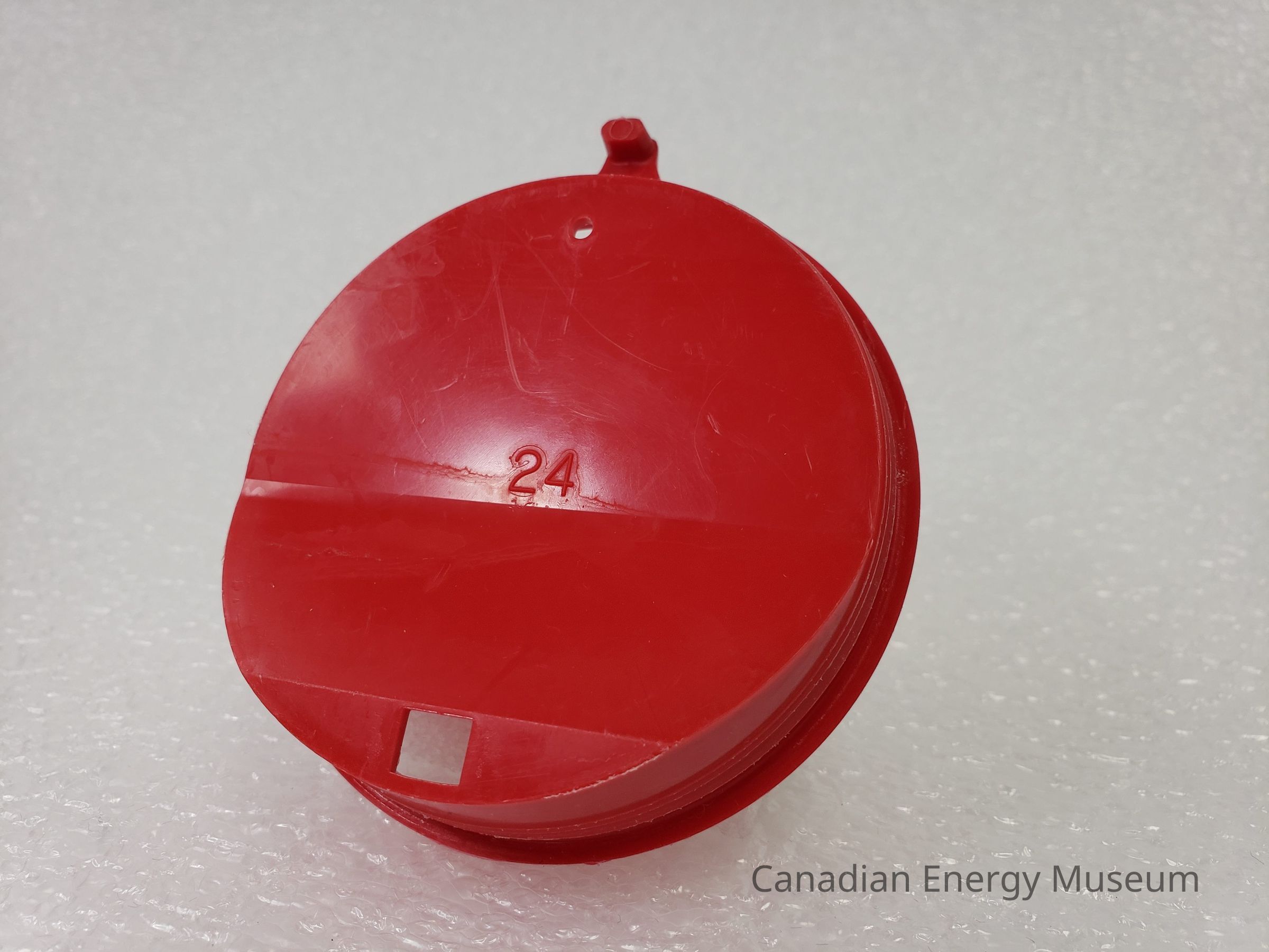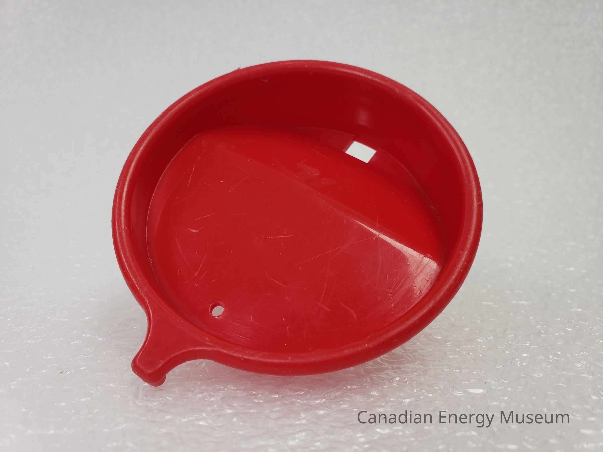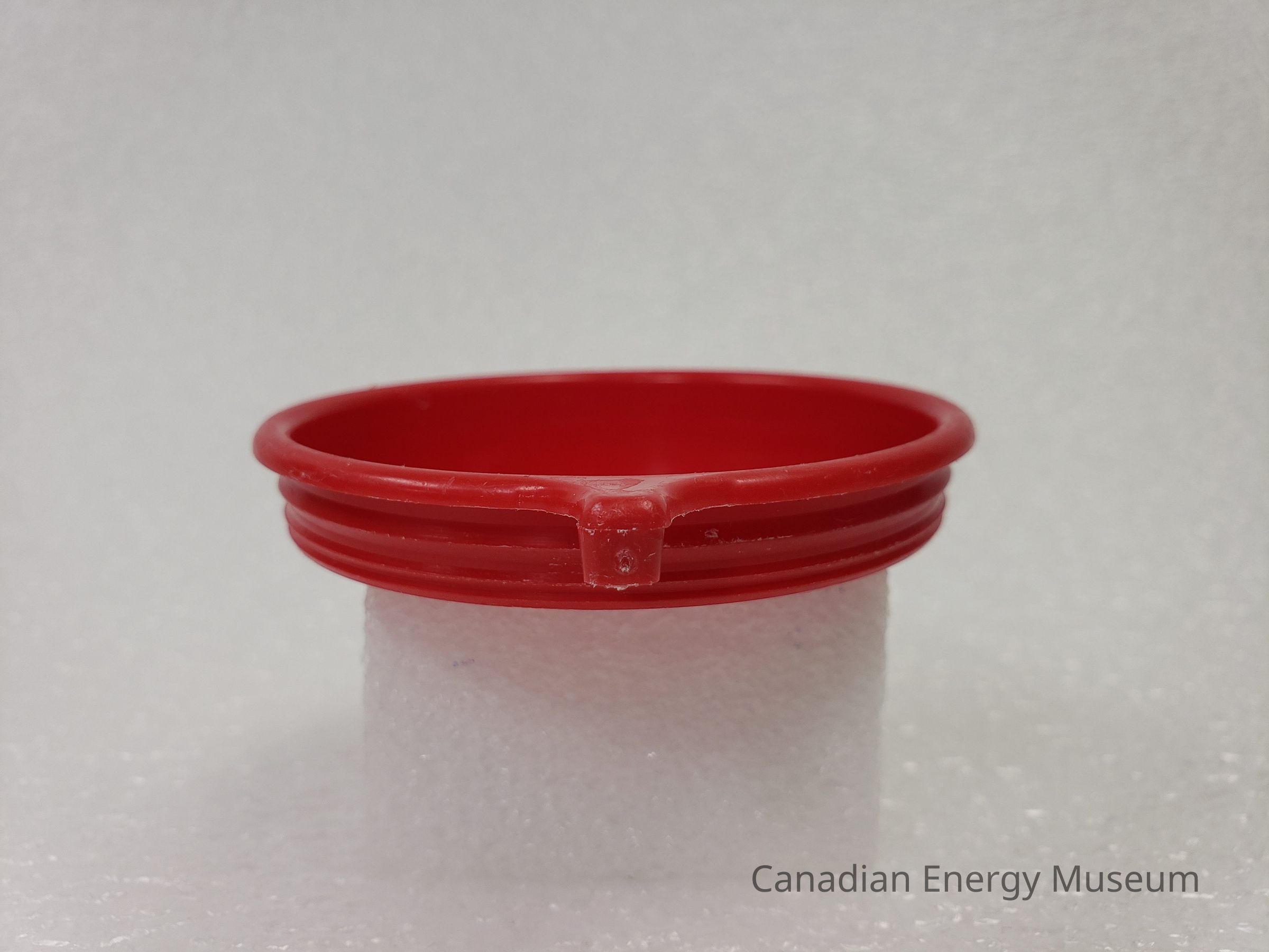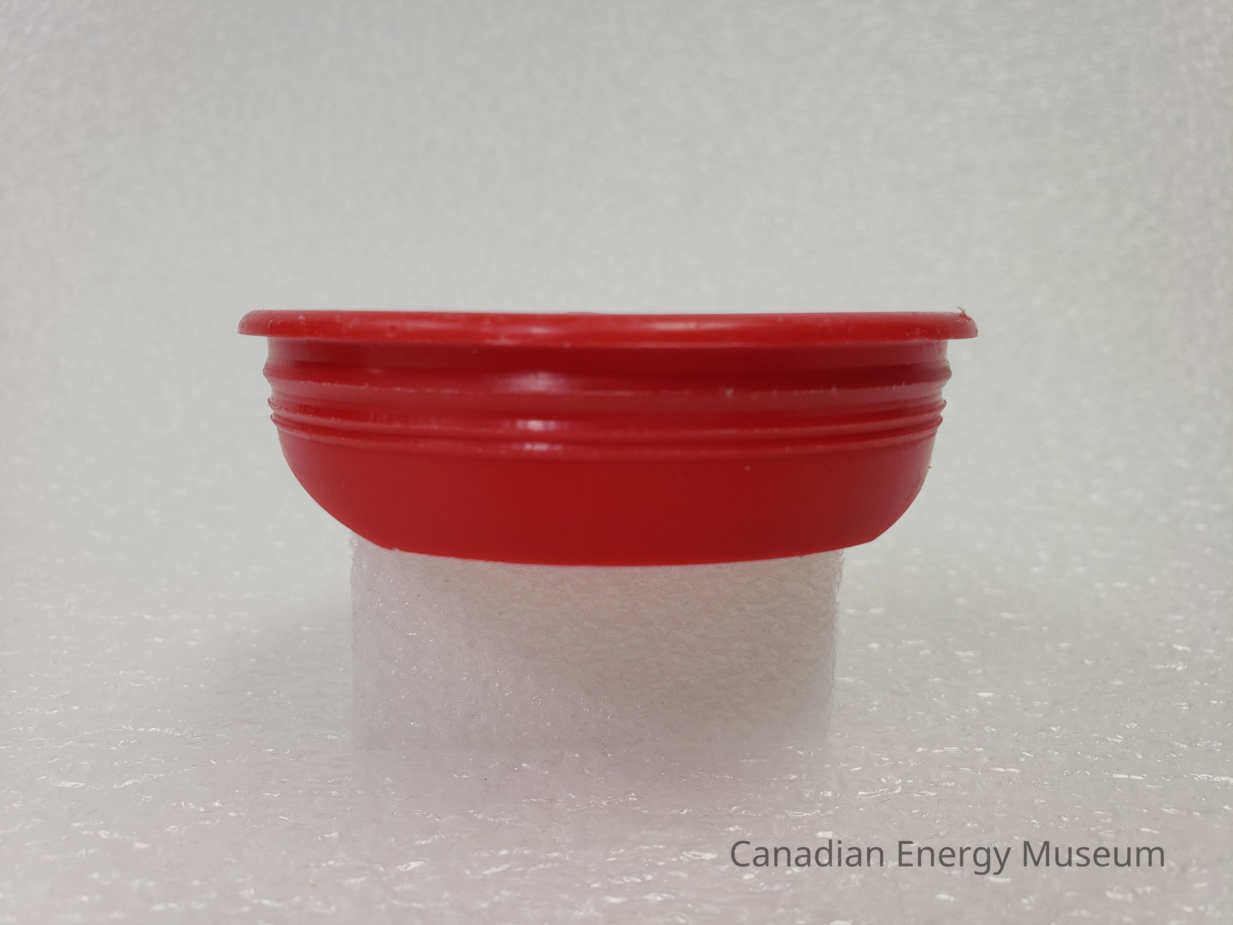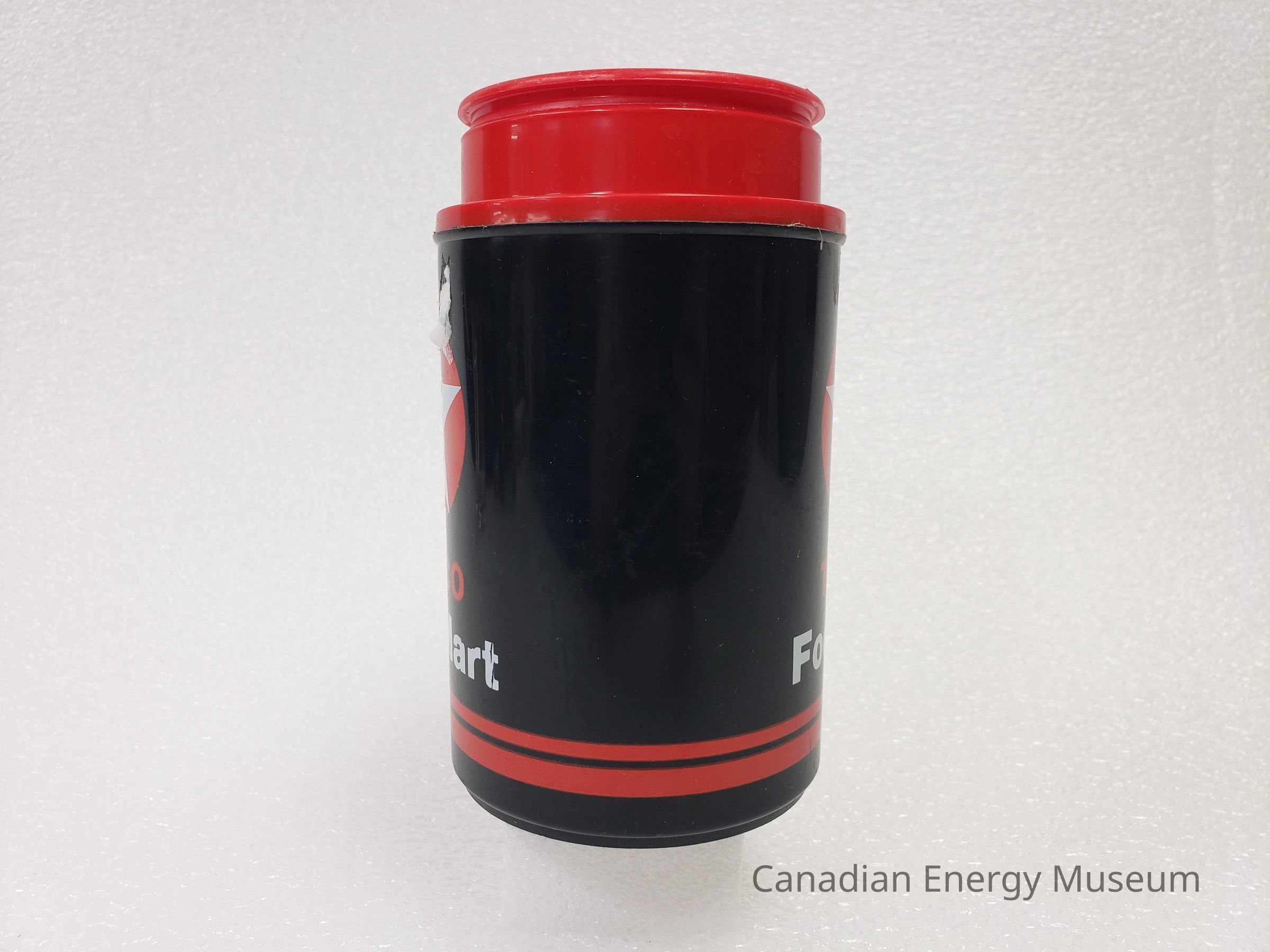 This is a double-walled travel mug/thermos, in red plastic, with a removable lid (also in red plastic). The mug is barrel-shaped, with a consistent shape from the lip to the base (which rounds under). At the top of the mug is a tall lip and at the base of the lip is a flat disc that is slightly wider than the rest of the body. The body of the mug is coloured black, with the following design details: In the upper portion of the mug is Texaco's round start logo (red circle, white star, red "T"); below the logo is the red block text "TEXACO"; and underneath again is the white block text "Food Mart". These design elements appear twice, on either side of the handle. Running around the circumference of the mug (a medium-thickness line on top, and a thick line at the bottom). The handle is tall and rectangular, with rounded corners. The lid fits inside of the lip of the mug and secures with a double ring of ridges. The drinking side has a sunken area leading to a small rectangular hole. On the opposite side is a small hole and a hooked tab for assistance in removing the lid. On the base of the mug, on the lightly recessed surface are the following moulded details: "22oz. THERMOS"; "HOT!/COLD!"; and "WHIRLEY INDUSTRIES, INC.; WARREN, PA, U.S.A."