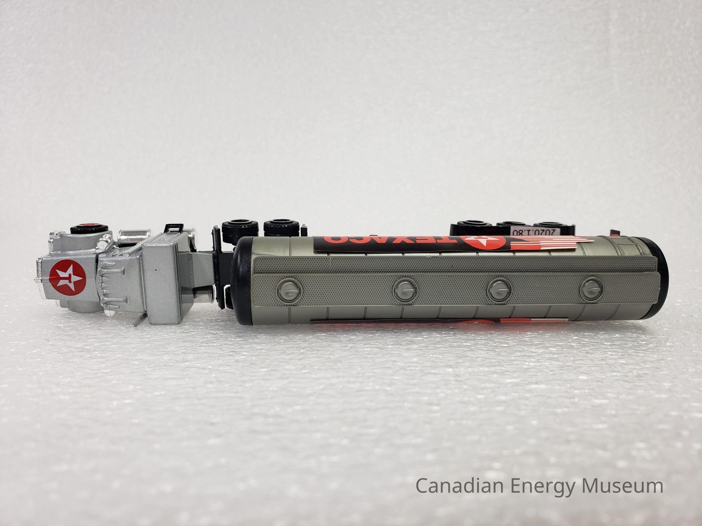 Features: A 1:87 scale model of a Kentworth tanker truck and trailer. The body of the truck and trailer is a metallic-silver, with black and red detailing. The truck section is predominantly metallic-silver, with a round star Texaco logo on the hood, black wheels, and red/silver hubcaps on the front set of wheels. The hood of the truck is articulated and can be hinged forward to show the engine. The trailer/tank is cylindrical with vertical ridges. It is a slightly different shade of grey/silver, with black ends, a black base, and black top section. Along the back 2/3s of the tank are red tubing details. Along the majority of both sides of the tank is a large black with red text decal, with "TEXACO" to the front, a red and white circle star logo to the centre, and motion lines mirroring the shape of a star to the back.