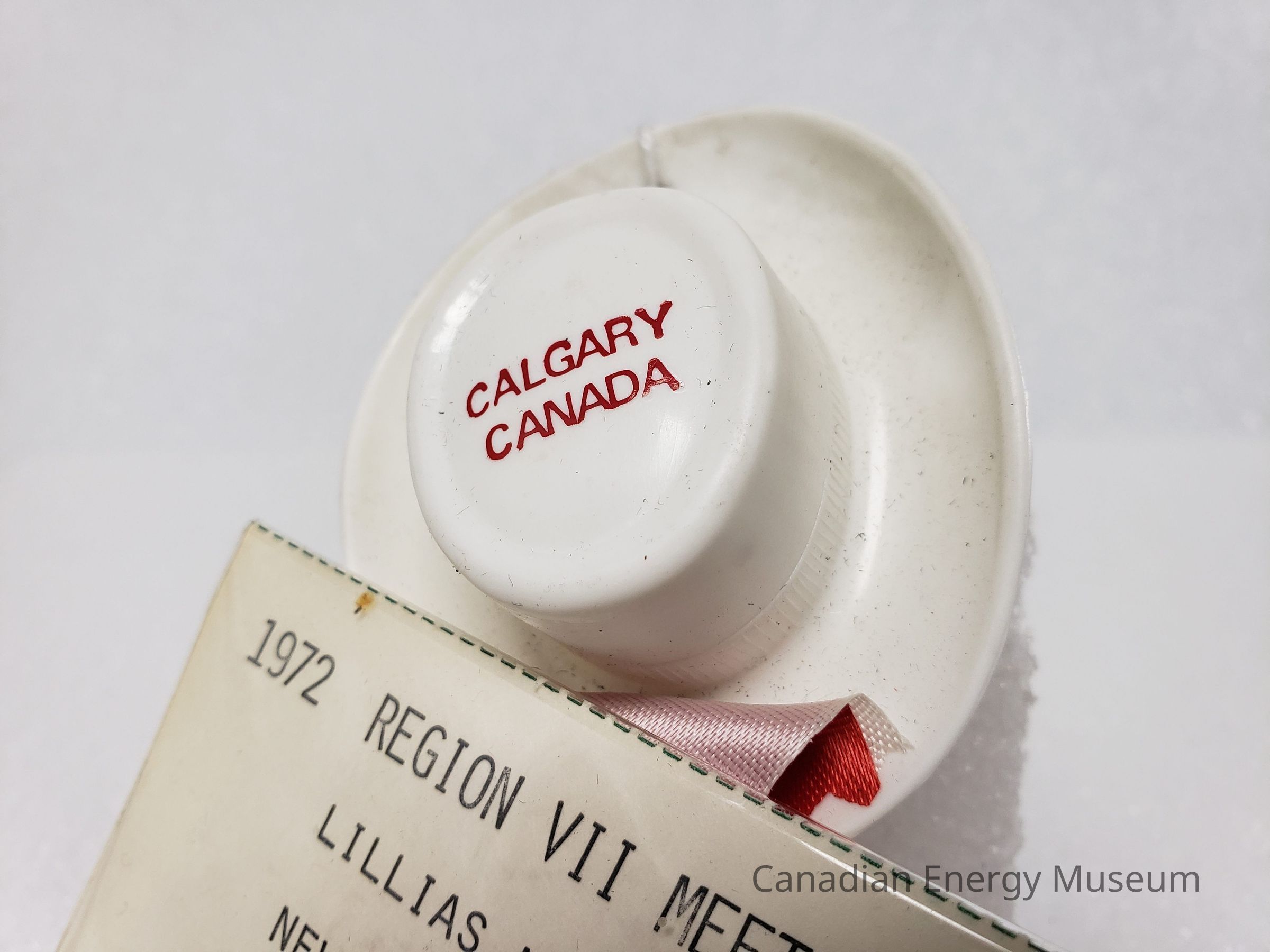 The plastic hat is all white, with "CALGARY CANADA" printed in red san serif font on the top of the hat. On the back brim are two small brass-coloured metal eyelets.