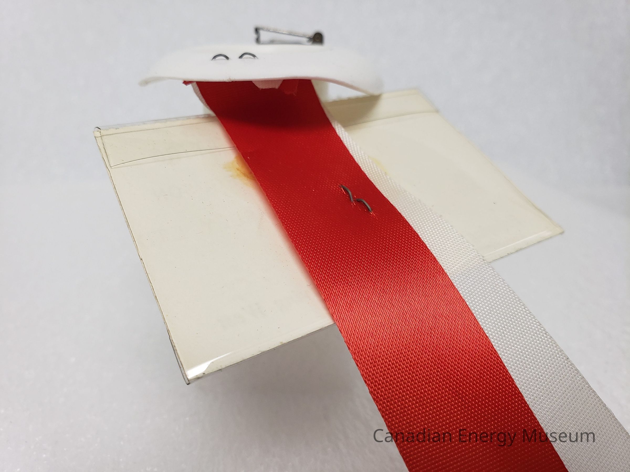 There are two ribbons, one white and one red. Both are made of a lightly satin-like material, likely a polyester/synthetic. The bottom edges are crimped with a zig-zag shape. The top is secured to the hat with a silver-coloured staple through the front brim.