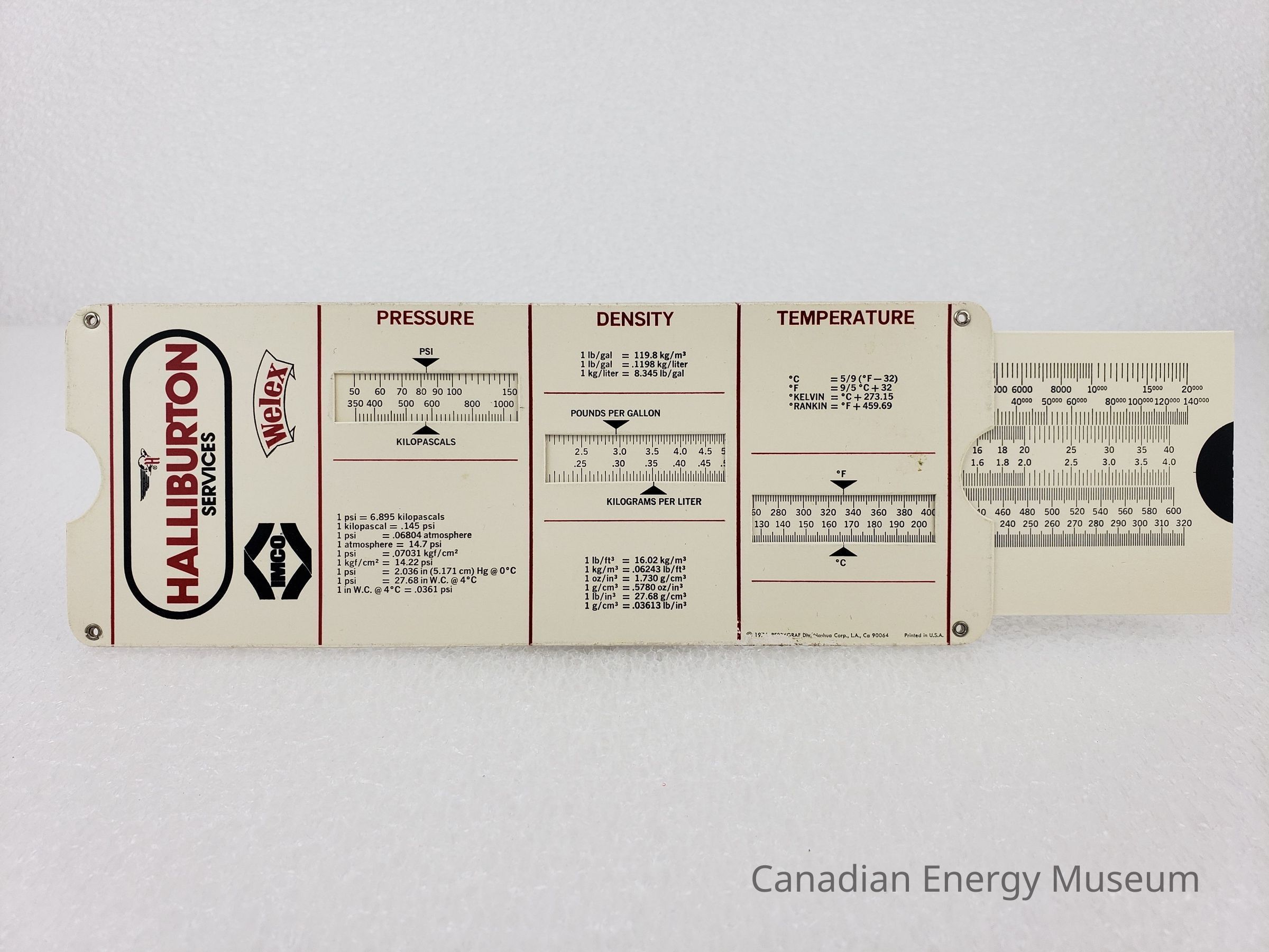 Slide Rule, Slide, Slide Chart, Conversion Chart, Slide Converter, White, Red, Black, Cardboard, Calculations Table, Calculator, Halliburton Services Ltd., Welex, IMCO, Pressure, Density, Temperature, Length, Area, Volume, Weight, Metal, Technical Stationery, Ruler, Stationery, 1970sDescription