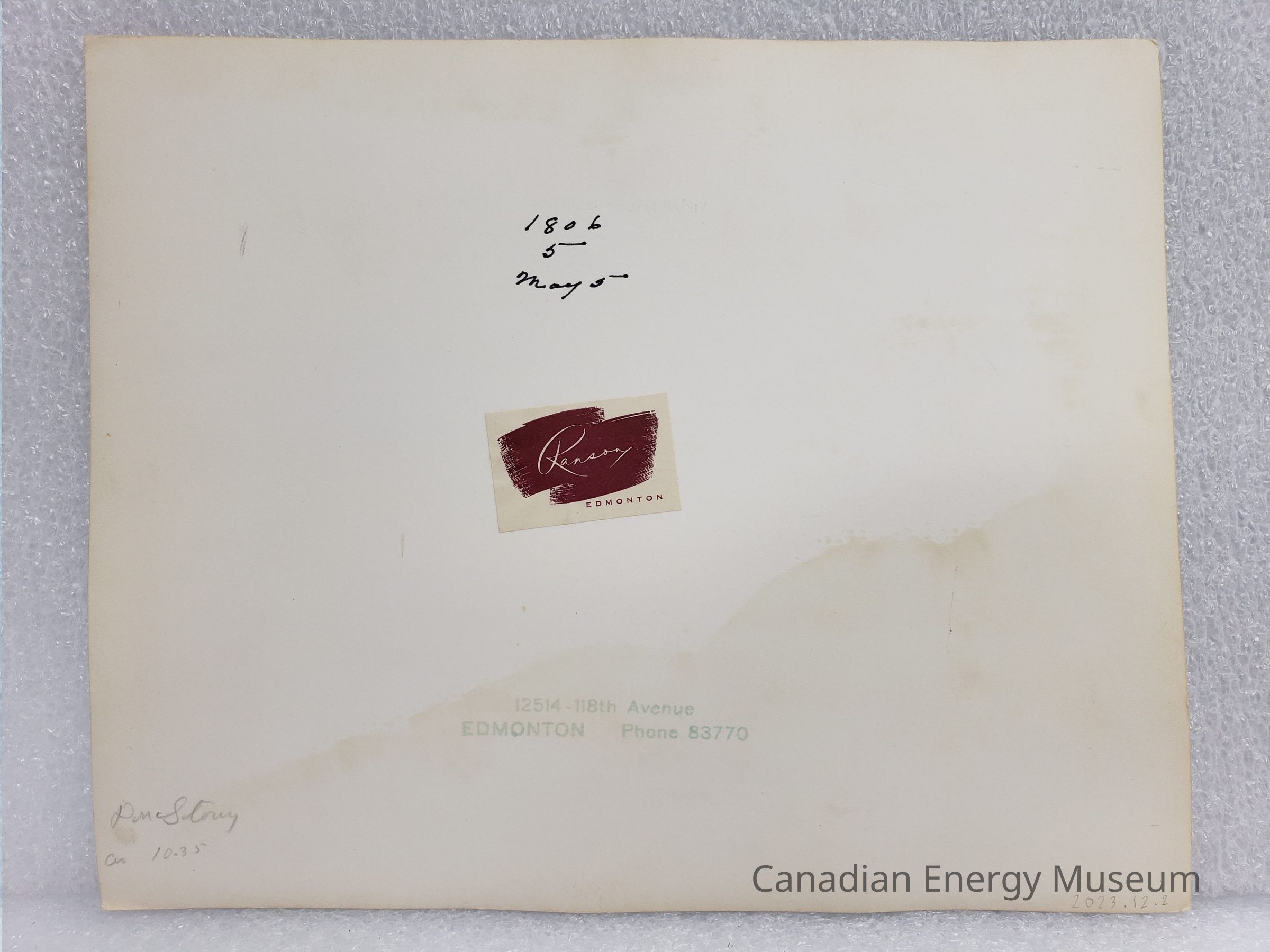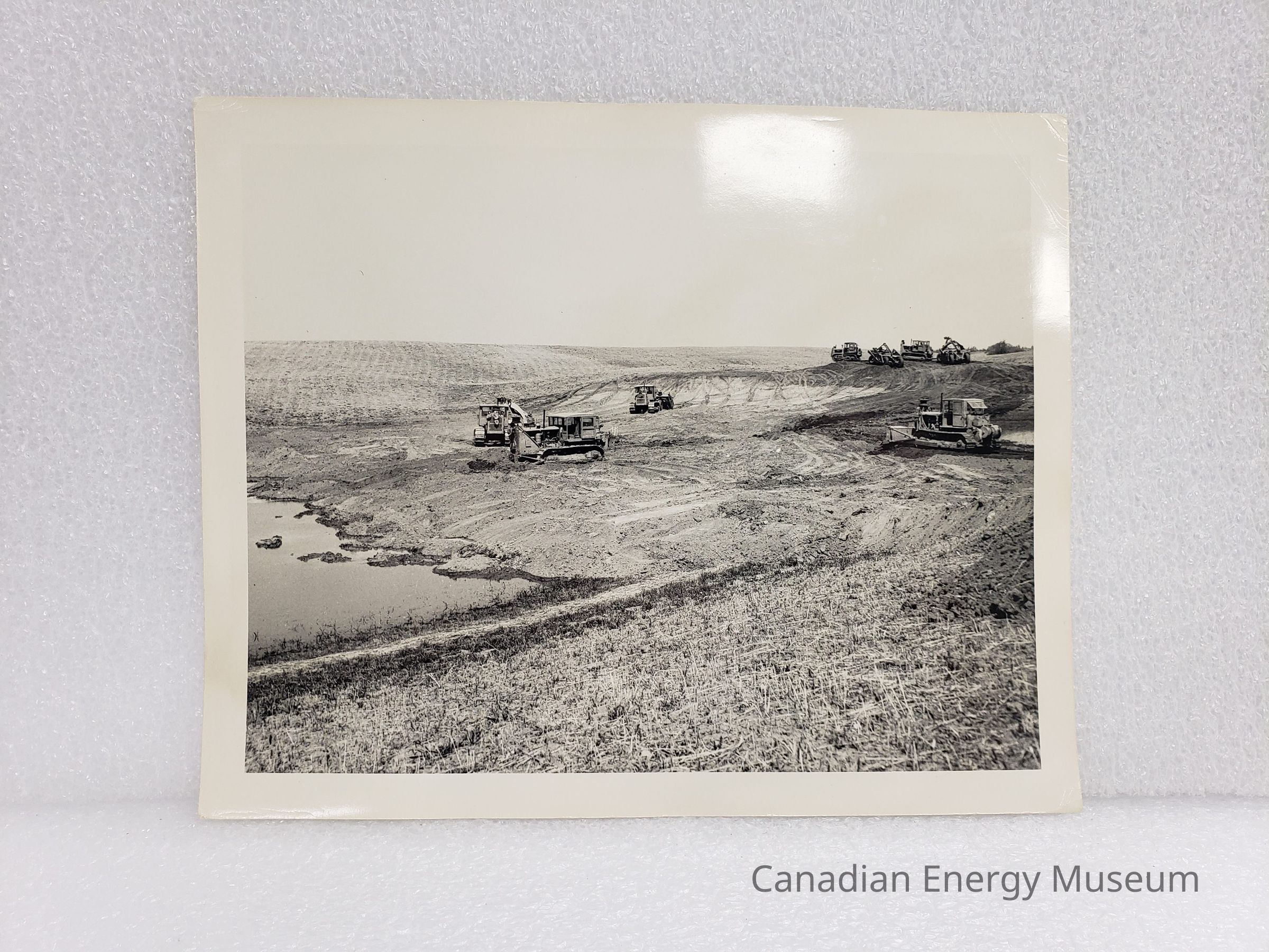 A large, black and white photographic print of a field with FOUR bulldozers in the mid-point, and FOUR bulldozers in the background. In the left-foreground is a small body of water. On reverse is handwritten in black ink "1806; 5; May 5"; a sticker branded to [Ransom/Ransoy/Ransory?]; a green stamp reading "12514-118th Avenue; EDMONTON Phone 83770"; and handwritten pencil text reading "PM S[??]; On 10.35".