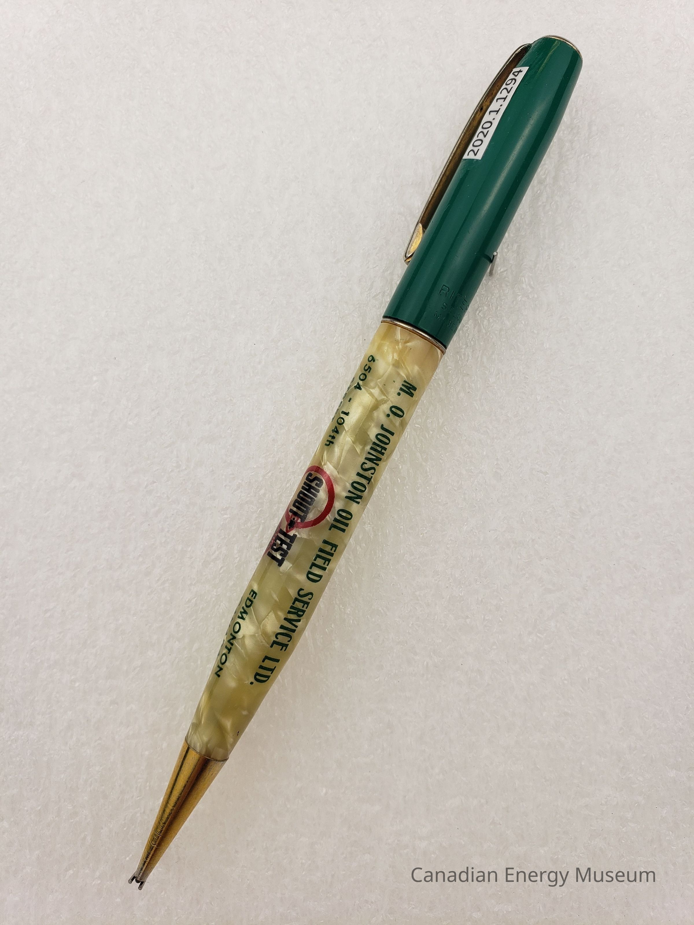 Pen: A mechanical pencil, with a plastic body and metal detailing. The lower body is a pearlized yellow-cream plastic, with green, black, and red print, reading "M. O. JOHNSTON OIL FIELD SERVICE LTD.; 6504 - 104TH STREET; EDMONTON CANADA; PHONE 36115" and a small illustrated logo reading "SHOOT - TEST". The upper body is a plain green plastic. The metal detailing includes a gold-coloured section around the pencil tip; a fine silver-coloured band seporating the yellow-cream and green section; the silver-coloured clip branded to "Ritepoint" with end-cap. The pencil led mechanism is a twist motion at the fine band mentioned above.