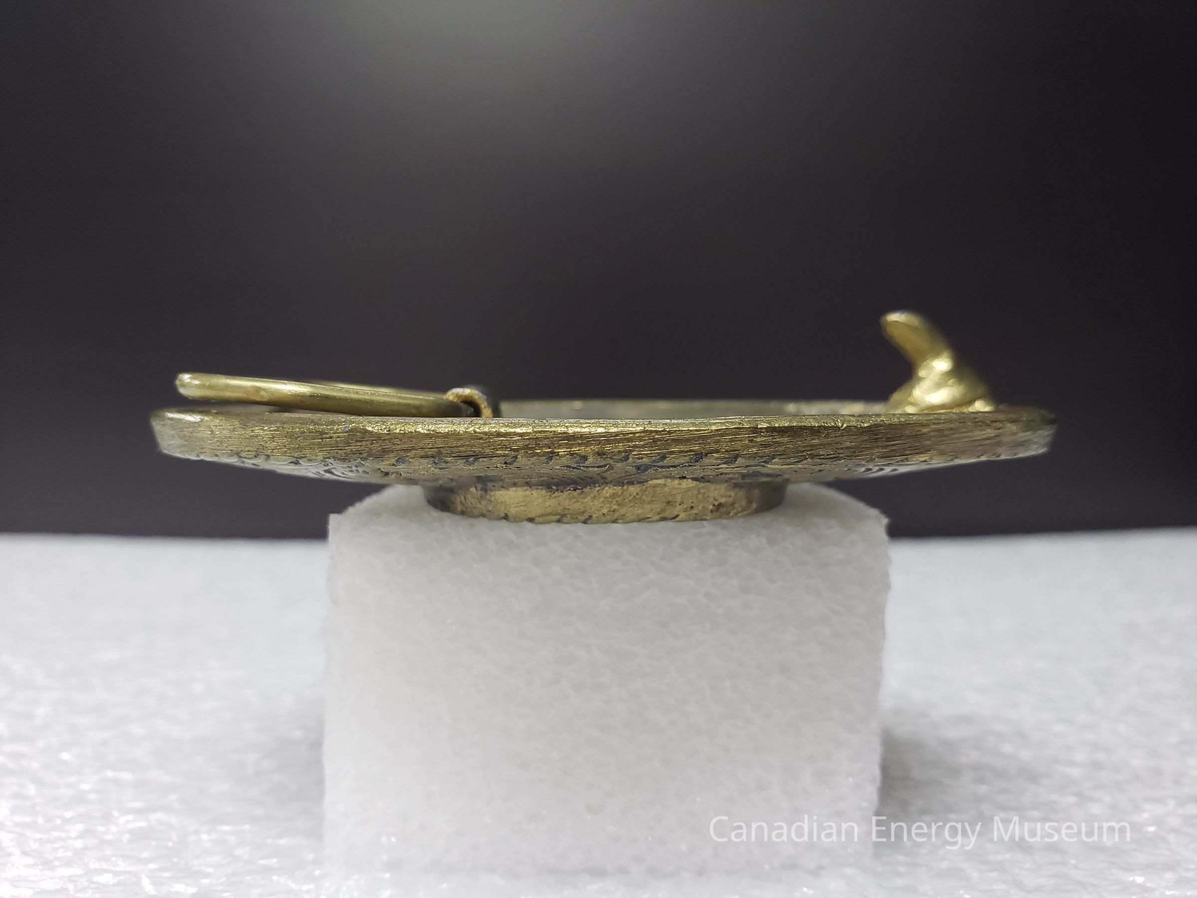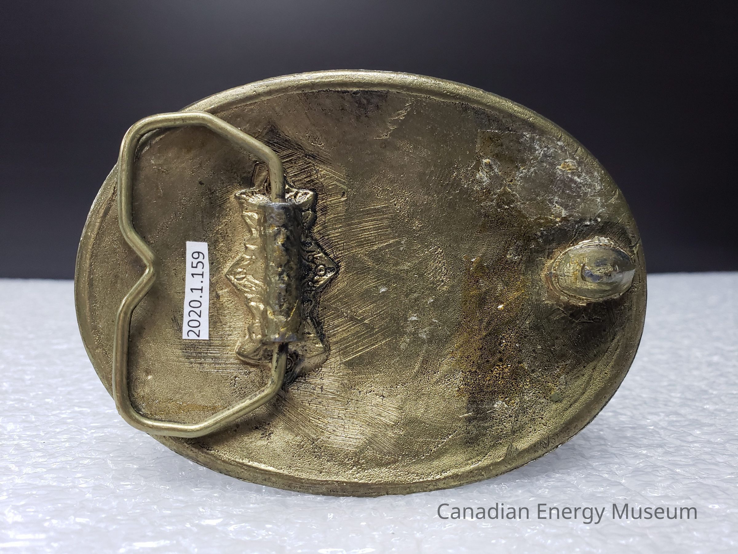Old Description (Kelsey Dalrymple, 3 June 2020): Baker Oil Treating. Oval brass belt buckle with circular white enamel face. Blue text. (Donated by Gordon McQuaig).Collection
