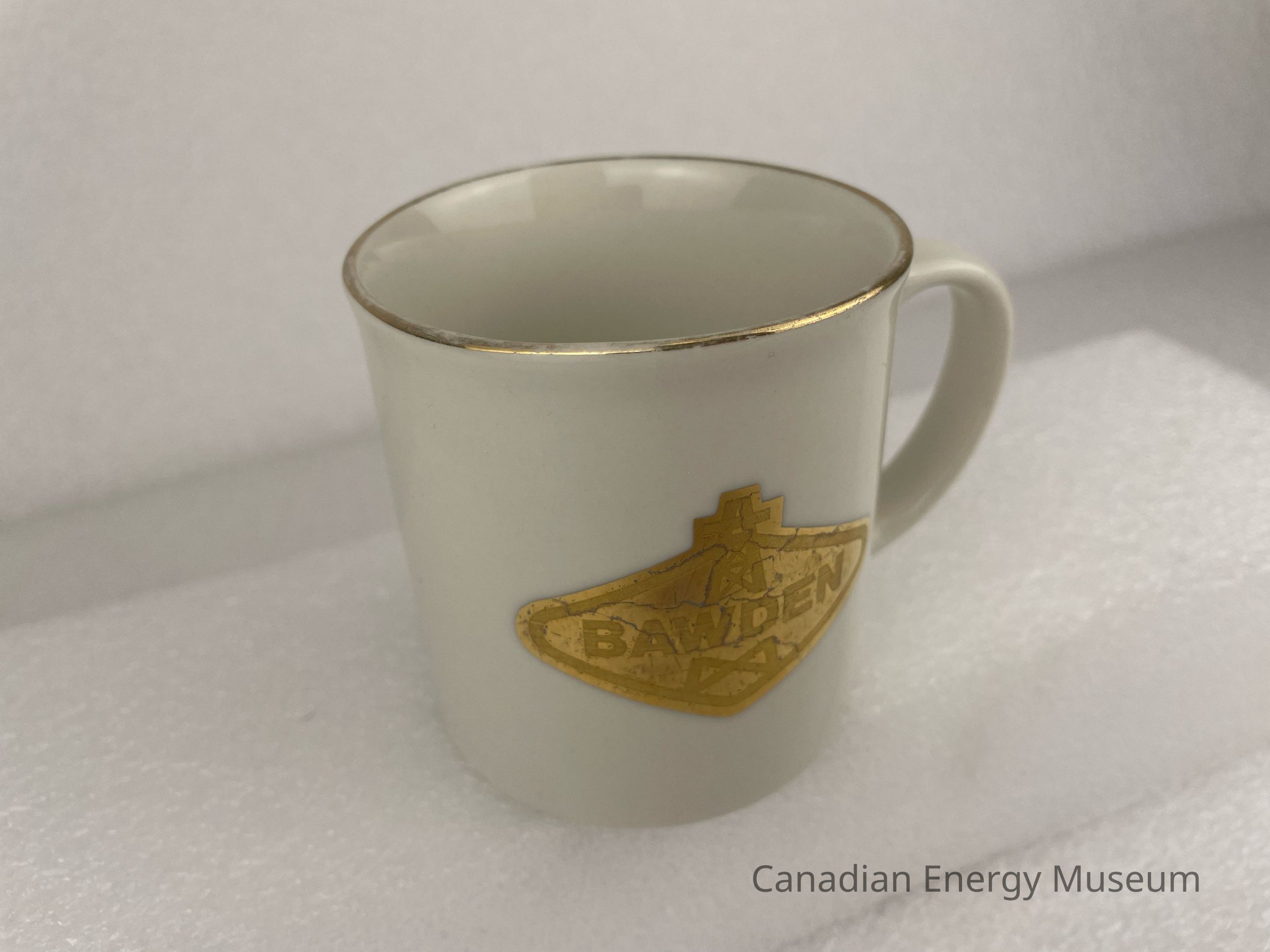 A fine ivory china mug with a gold rim branded to Bawden. The front of the mug features a gold horizontal diamond shape with an oil derrick in the centre and text reading, "BAWDEN".Collection
