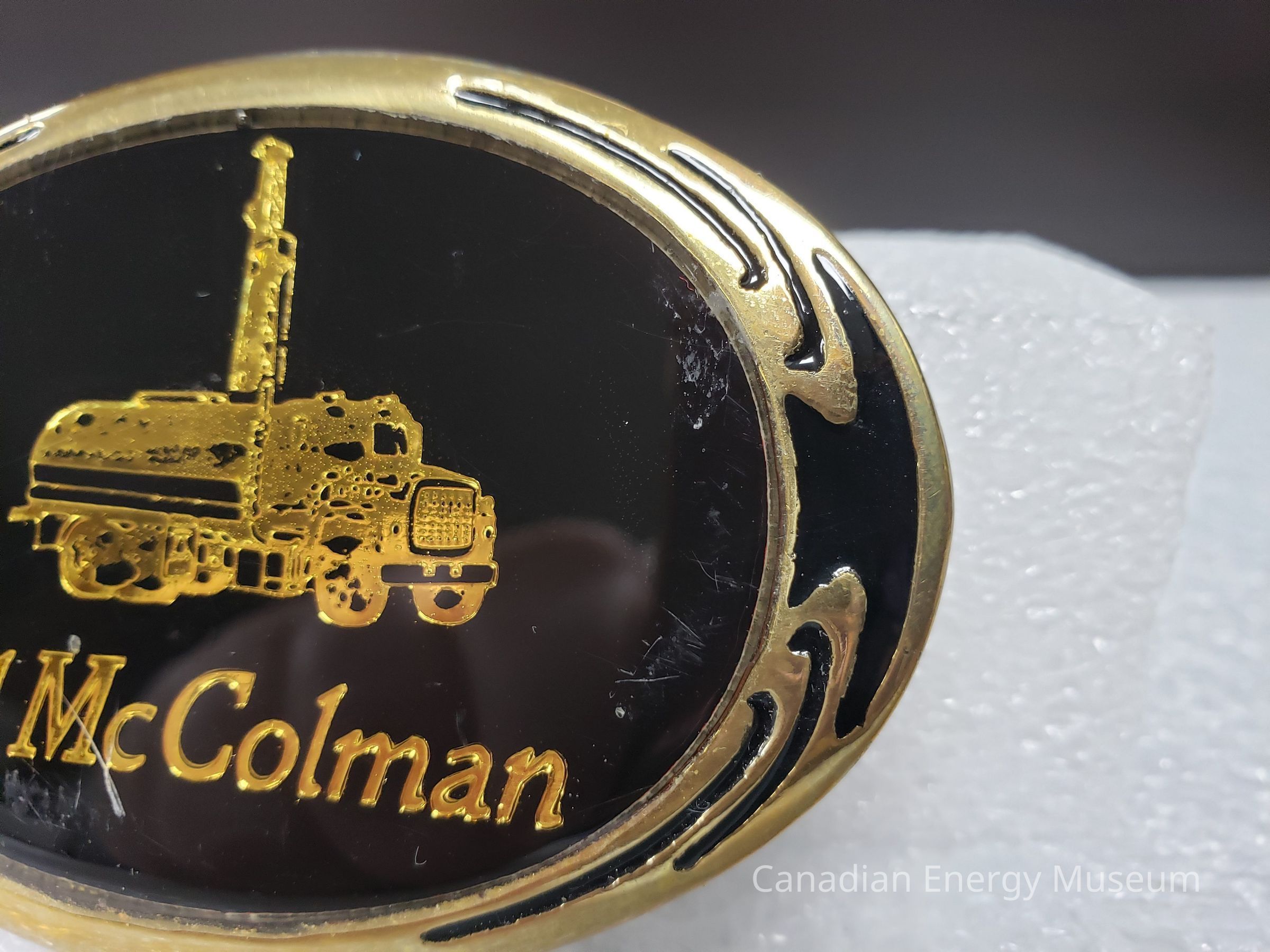Old Description (Kelsey Dalrymple, 3 June 2020): Bill McColman. Brass oval belt buckle with black enamel face, gold tanker truck in center (Donated by Gordon McQuaig).Collection