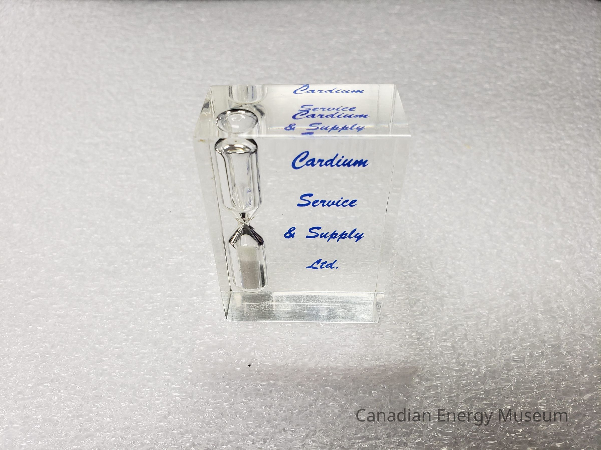Features: A small block of clear acrylic/resin, with a built-in hourglass (clear with white sand) to the left. On the front-facing surface is printed in blue cursive font "Cardium Service & Supply Ltd.".Collection