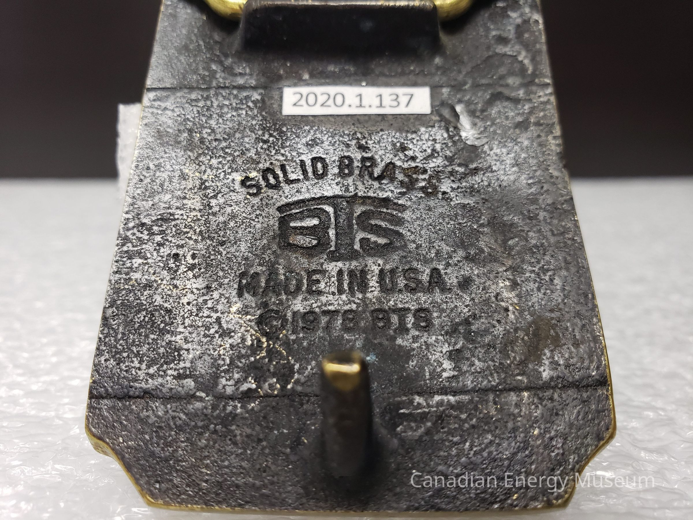 Back Elements: The back has a rough black finish, with bronze-finish on the hinge and hook. The hinge is an elongated hexagonal-shape, and the hook is slightly curved. Between them is the debossed text "SOLID BRASS" with an initial logo "BTS". Below is "MADE IN U.S.A.; © 1978 BI8".