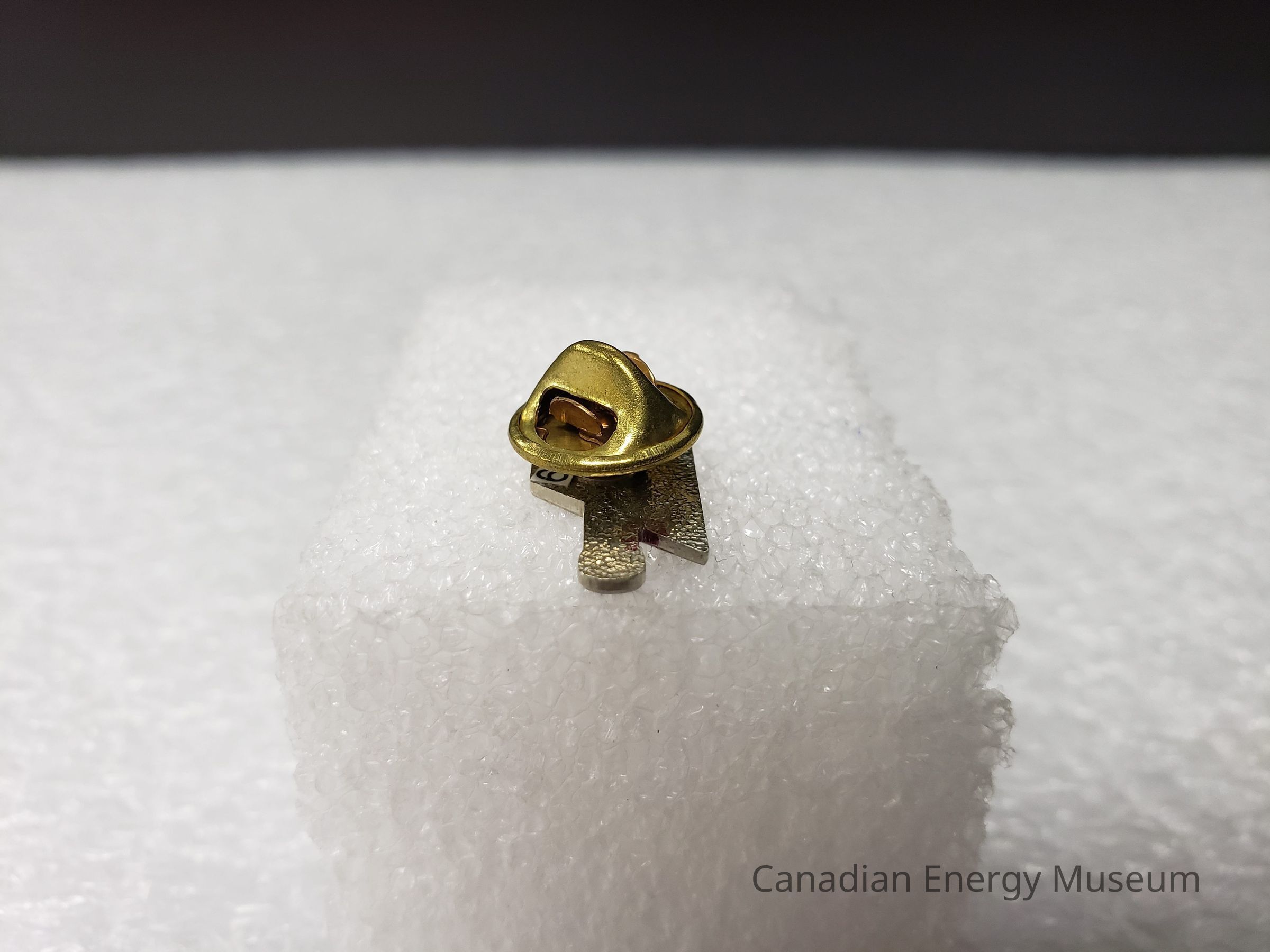 Old Description(Kelsey Steil, 6/1/2022):Lapel pin. Shaped like a diamond with a pipe crossing over the centre. Silver with burgundy border and starburst design in centre. Text reads: Diamond Products Heritage Ltd.Collection