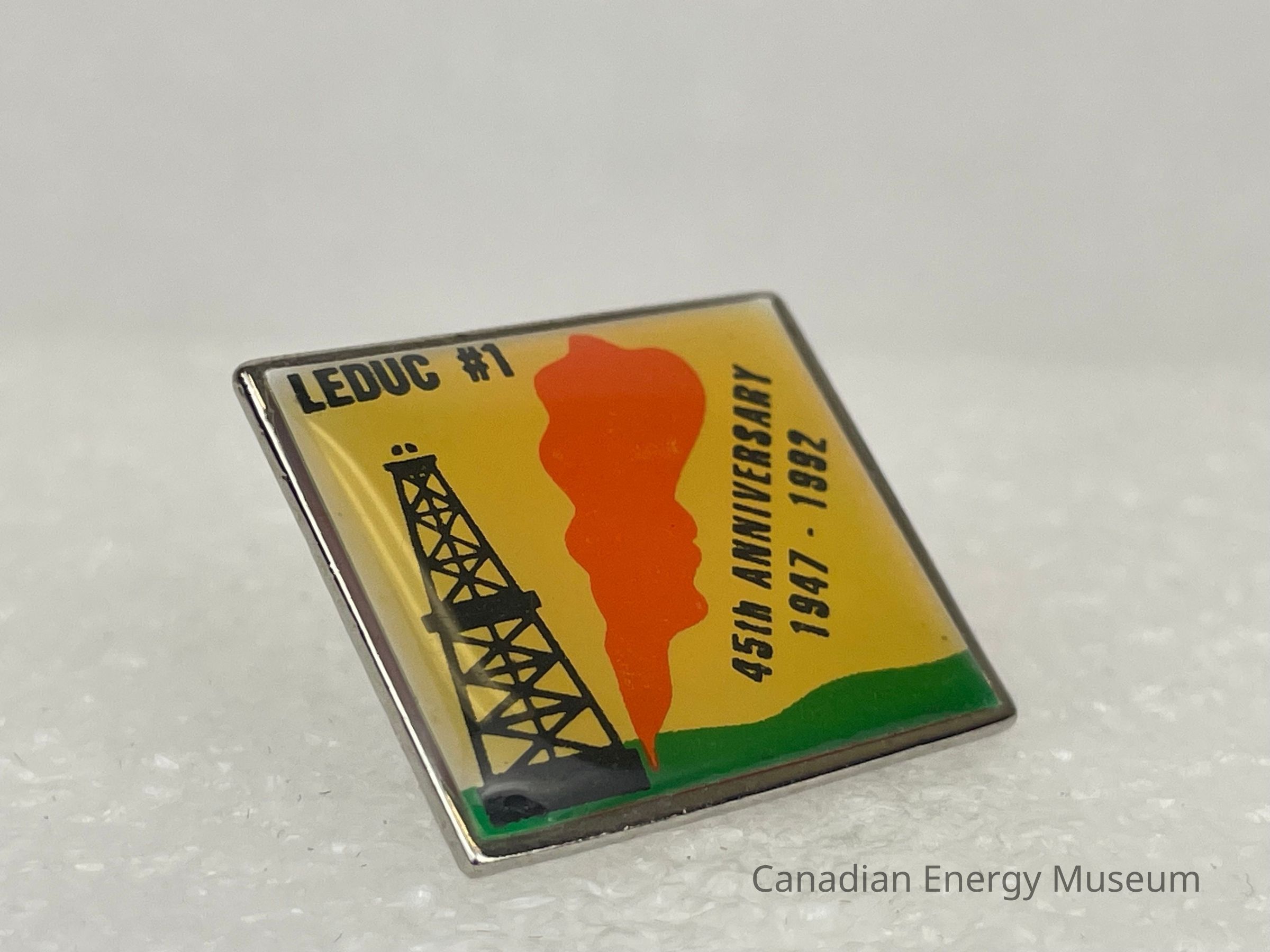 Pin is a rectangular shape made of a silver coloured metal. The design consists of a yellow background with green grass, and a black oil derrick on the left with orange smoke rising from its base. The top left corner displays black text reading, "LEDUC #1". Black text is also placed on the right, horizontally aligning with the smoke and reads, "45TH ANNIVERSARY 1947 - 1992".