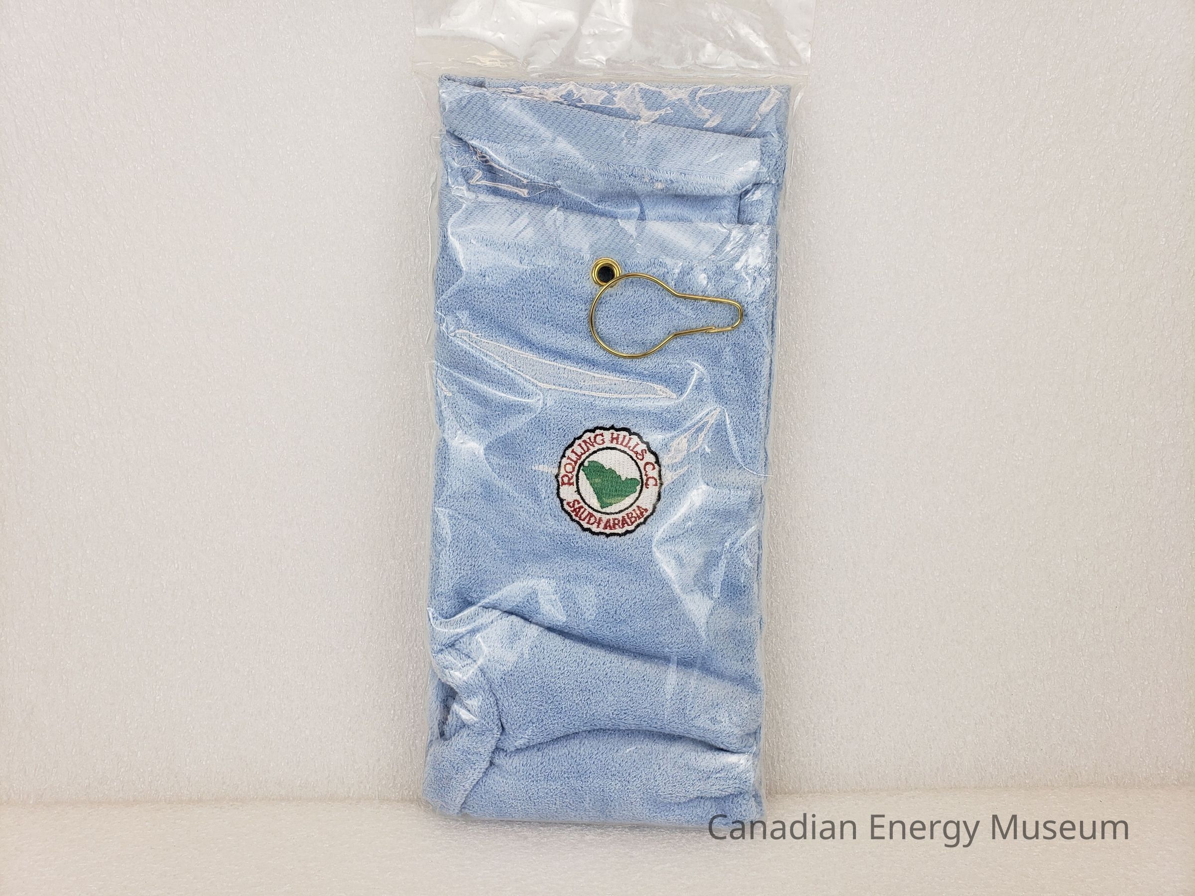 Design: A pale-blue terry cloth gold towel, with a small embroidered image branded to Rolling Hills C.C. (Saudi Arabia) in the centre of the towel (when folded). The towel is still inside its clear plastic packaging. The towel is folded vertically in thirds, then again in half horizontally. Through the centre-top of the folded towel is a gold eyelet, and sitting loose inside the packaging is a pear clip.