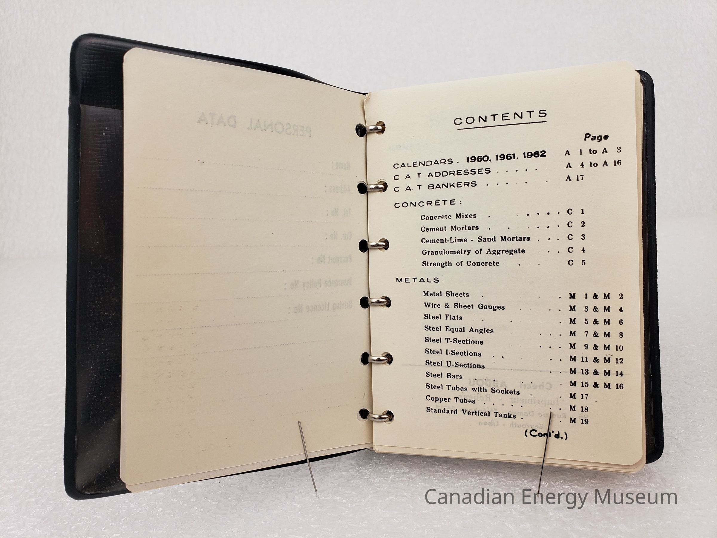 A spring-ring bound pocket-sized planner, branded to CAT. Includes year calendars for 1960-1962; C.A.T. contacts list; assorted calculations and conversions charts related to oil and drilling; timezone calculator; blank pages for contacts and notes; and a three-colour fold-outworld-map.