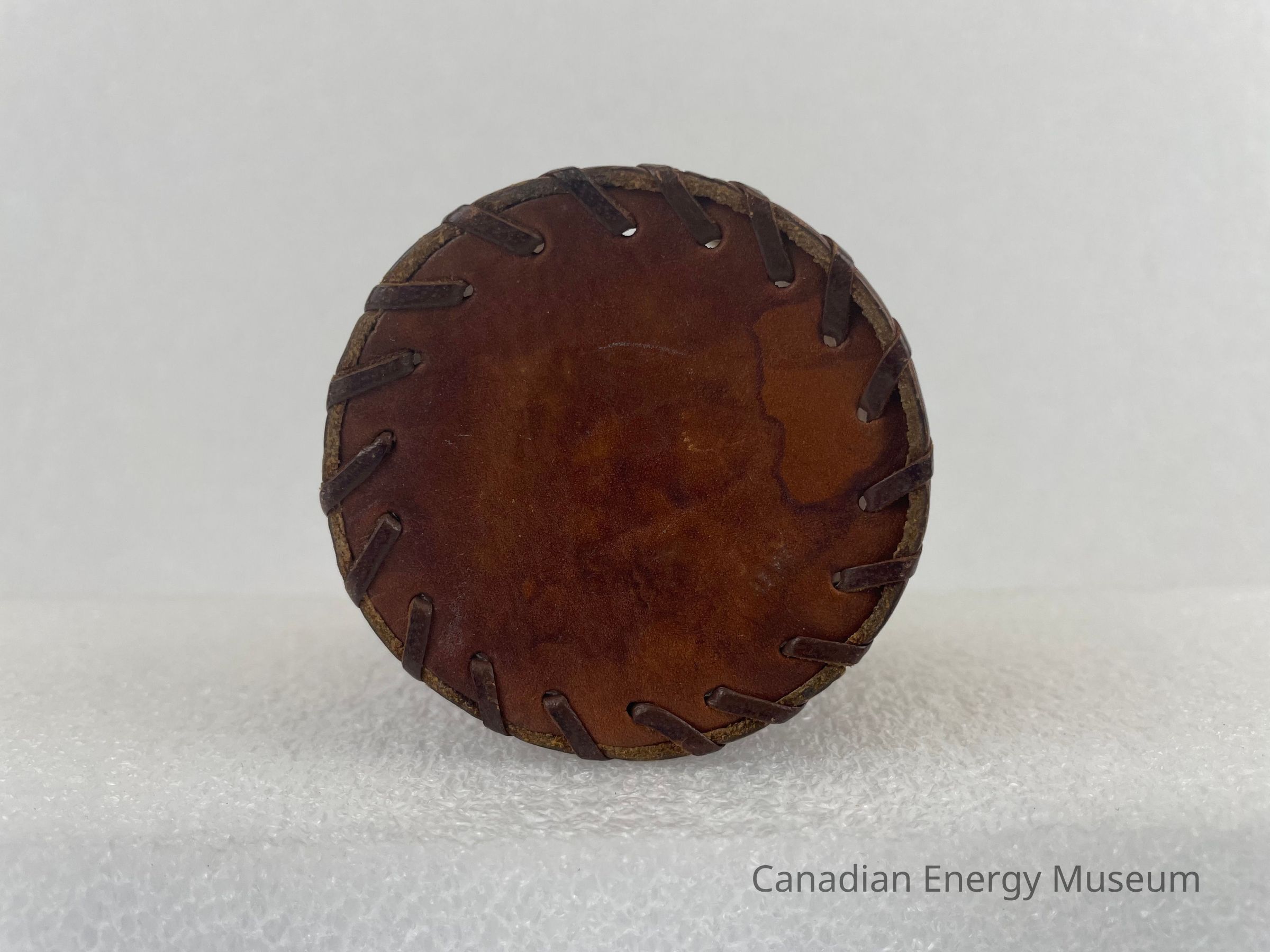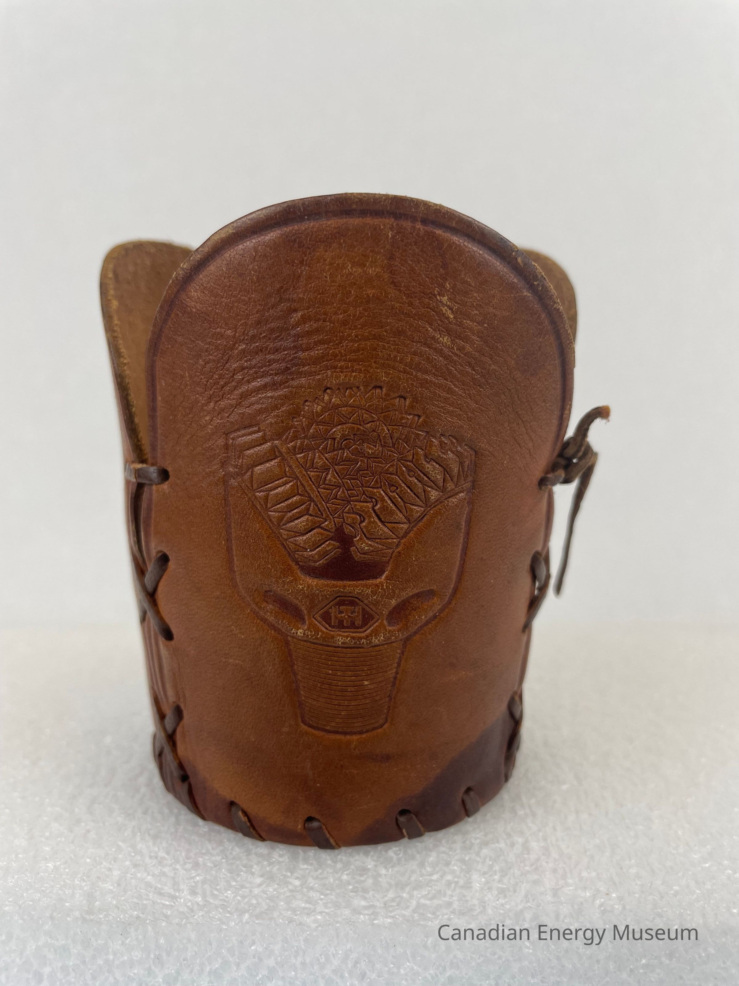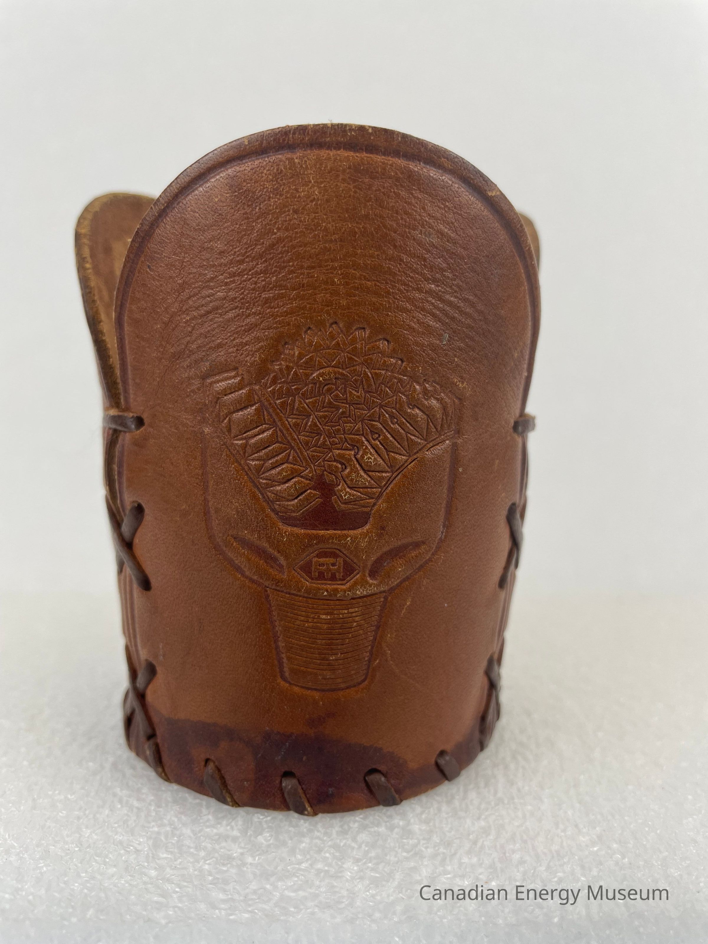 Description: A leather glass koozie, made by Hughes Tool Company. The koozie is made up of four different leather pieces. The bottom is a circular leather piece, and the interior features an engraved logo of a triangle with the letters "HT" in the centre. The sides are made up of three rounded rectangular shapes, each with identical engraved drill bits. The pieces are stitched together with brown leather string.Collection