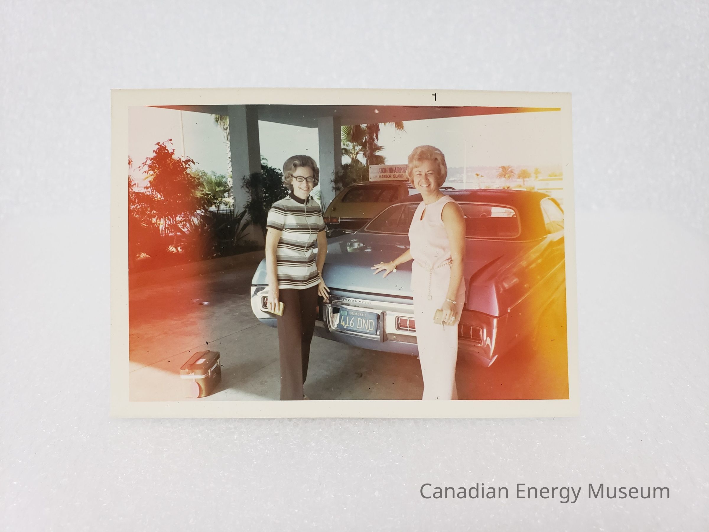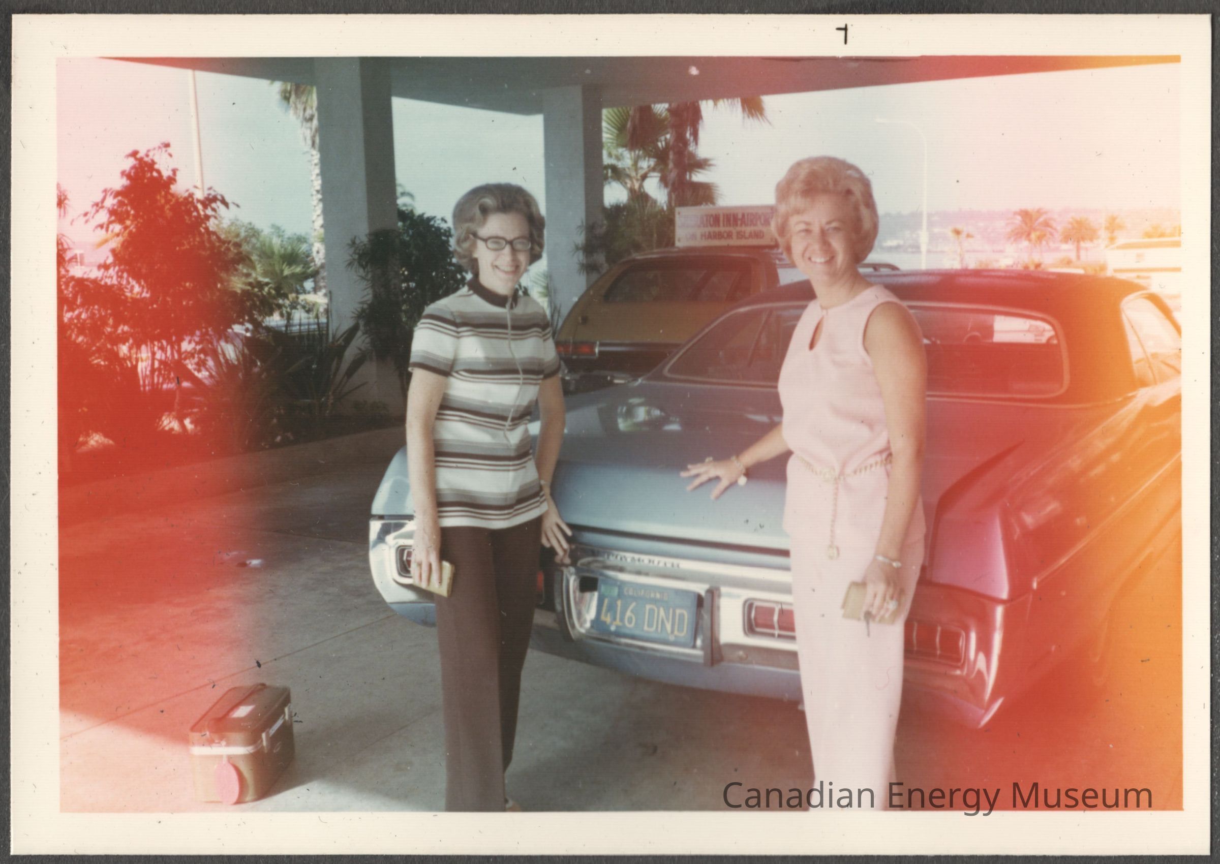 Description: To the right is a lady in white pants and a sleeveless top set with a chain belt, whose hand is resting on top of the trunk of the car. To the left is a lady in brown pants and a cream and brown striped short-sleeved and zip-up top, whose hand is resting lower in the car's trunk. The vehicle is a dusty-blue with the license plate 416 DND, and is parked in a hotel portico. On the ground to the left is a small green carry-case, and in the background is a mustard taxi. Coincided with the 1971 Association of Desk and Derrick Clubs of North America's 20th Annual Convention in San Diego.