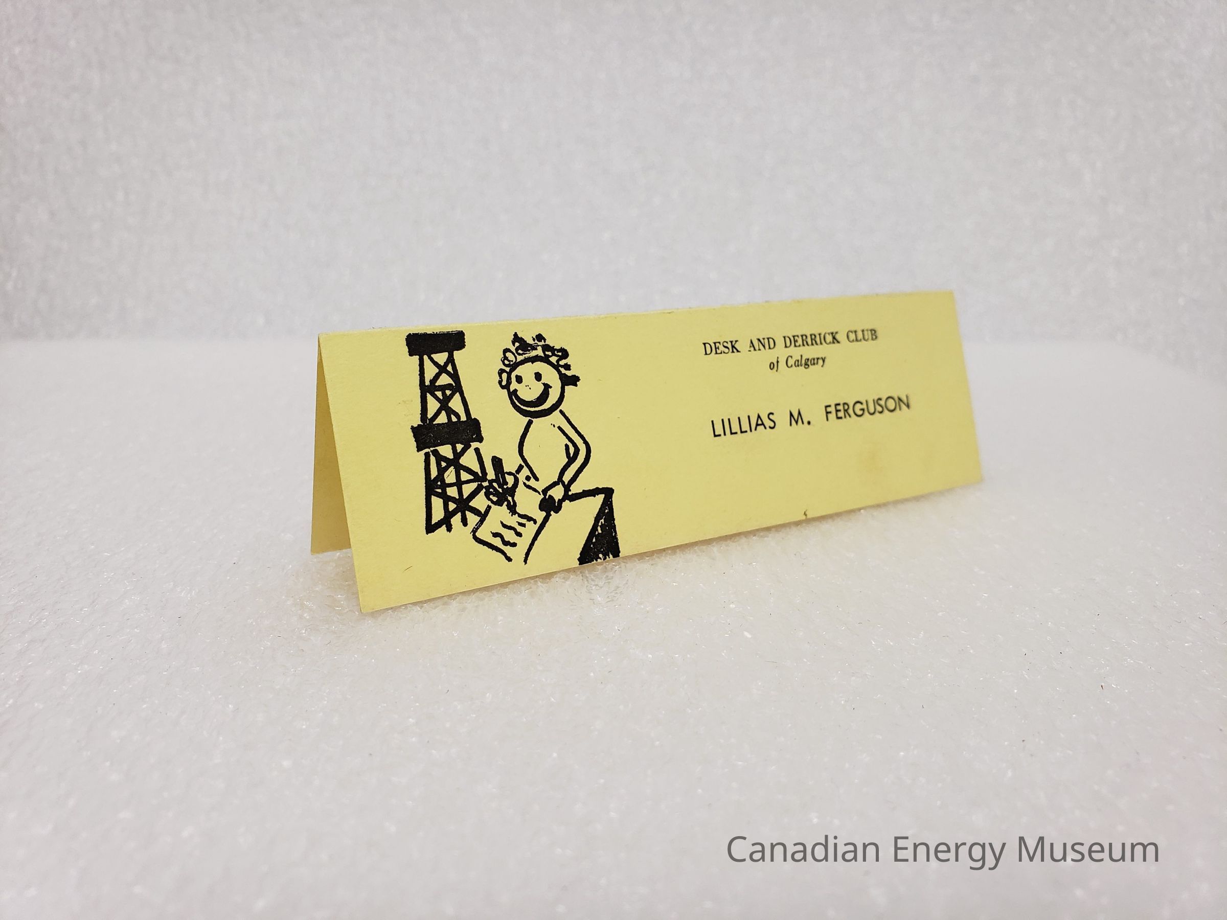 An elongated rectangular place card, made out to Lillias M. Ferguson. To the left of the card's front panel is an illustration of stylised lady writing at a desk with a derrick in the background (à la the ADDC logo). To the right is written "DESK AND DERRICK CLUB of Calgary; LILLIAS M. FERGUSON".