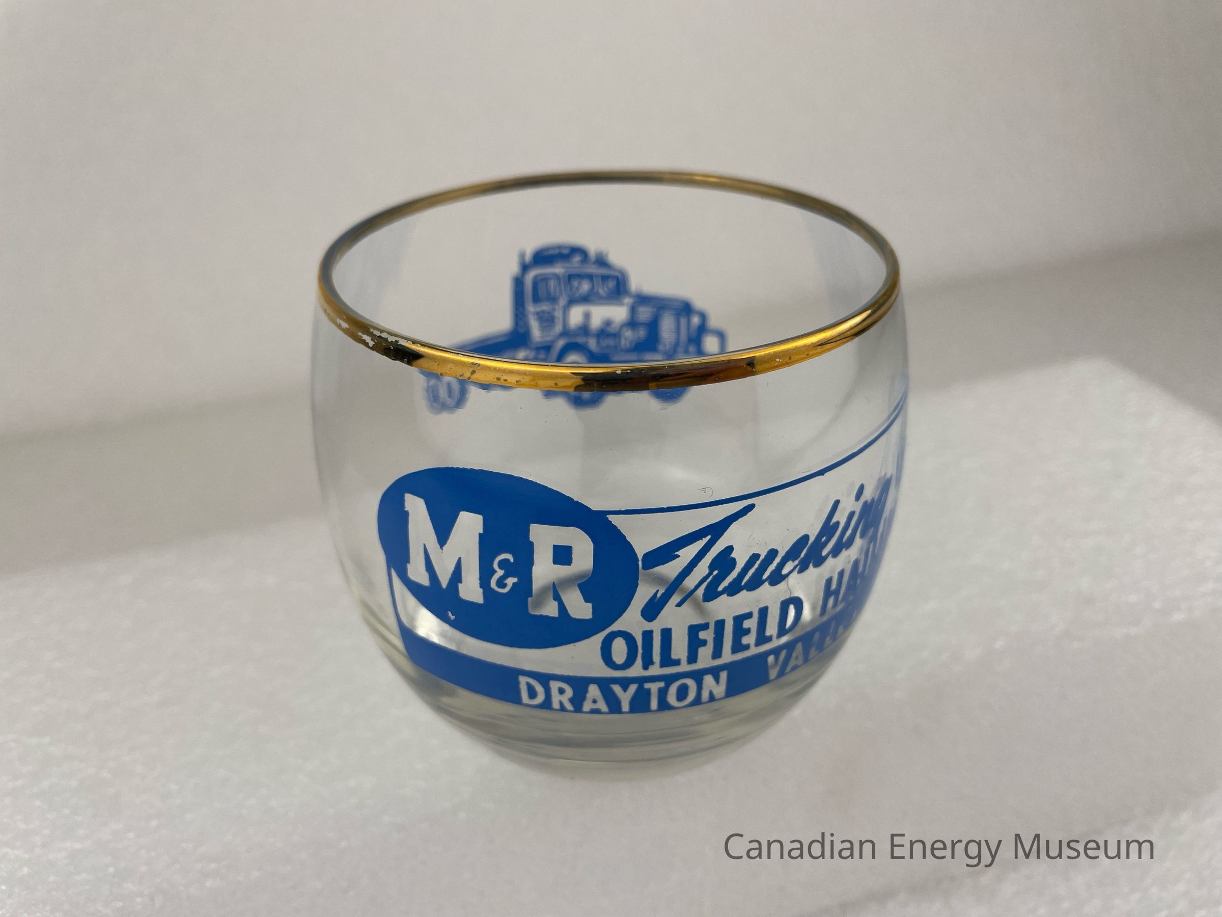 A rounded, clear whisky glass with a gold rim branded to M & R Trucking Ltd. Oilfield Hauling. The front of the glass features a blue design of an outlined rectangle with a blue oval on the top left corner, with "M&R" inside. Next to the oval, within the rectangle, text reads, "Trucking LTD. OILFIELD HAULING". A blue, thin rectangle at the bottom has text, "DRAYTON VALLEY". The back of the glass features a large blue illustration of a semi truck.Collection