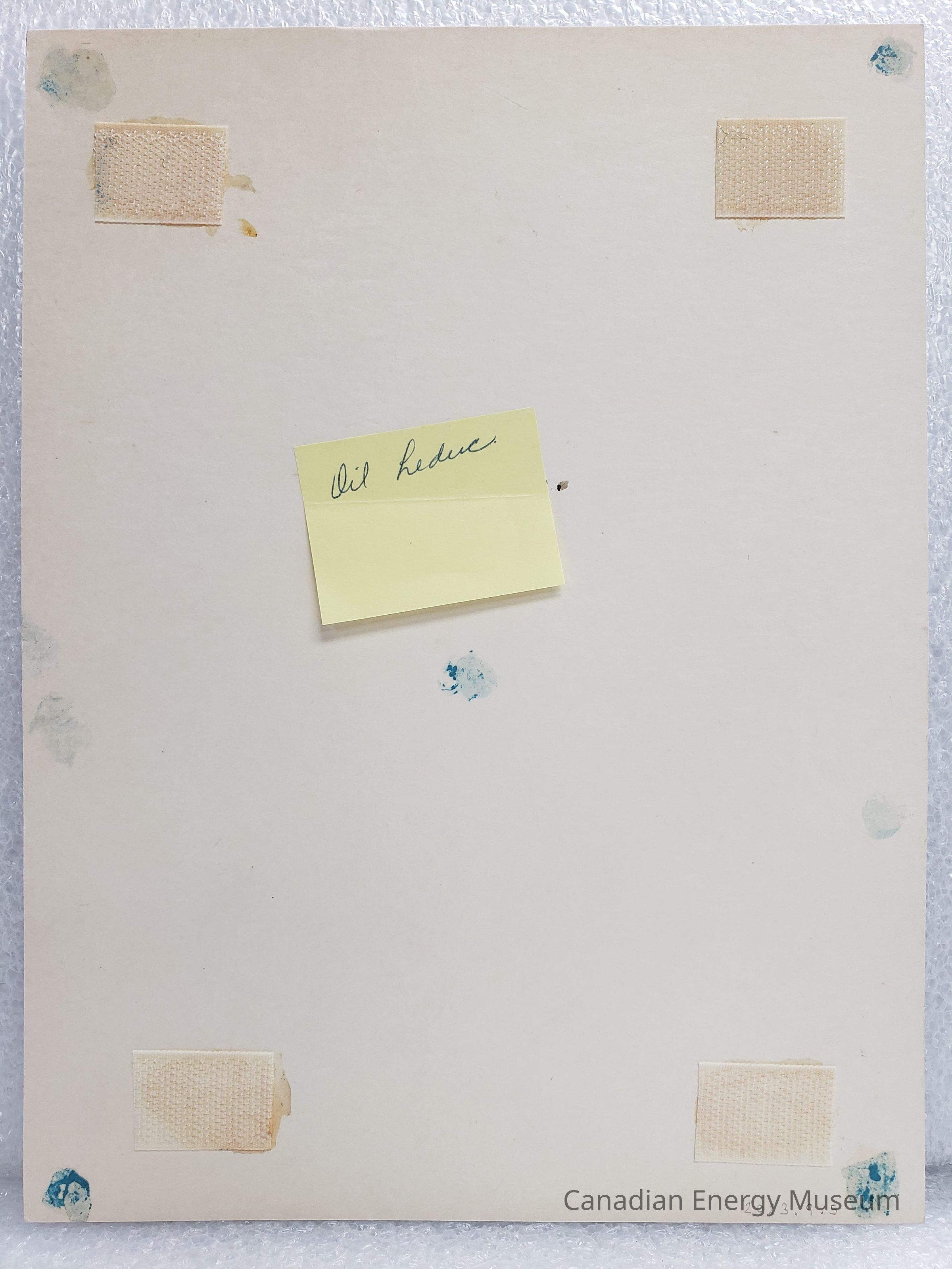 The print is mounted onto white, heavy cardboard, with velcro in each corner and residue from blue sticky tack. In the centre of the back is a small yellow post-it reading "Oil Leduc".Collection