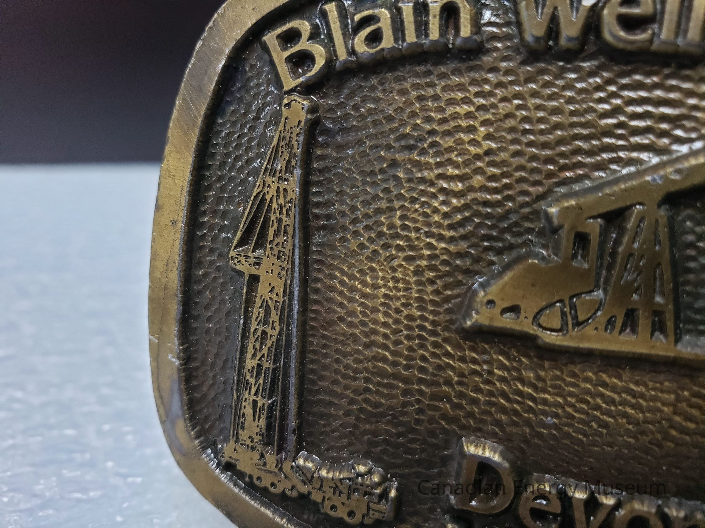 Old Description (Kelsey Steil, 4/7/2021): Blain Well Service Ltd. Devon, Alberta. Oblong brass belt buckle. Pumpjack in center, service rigs on either side.Collection