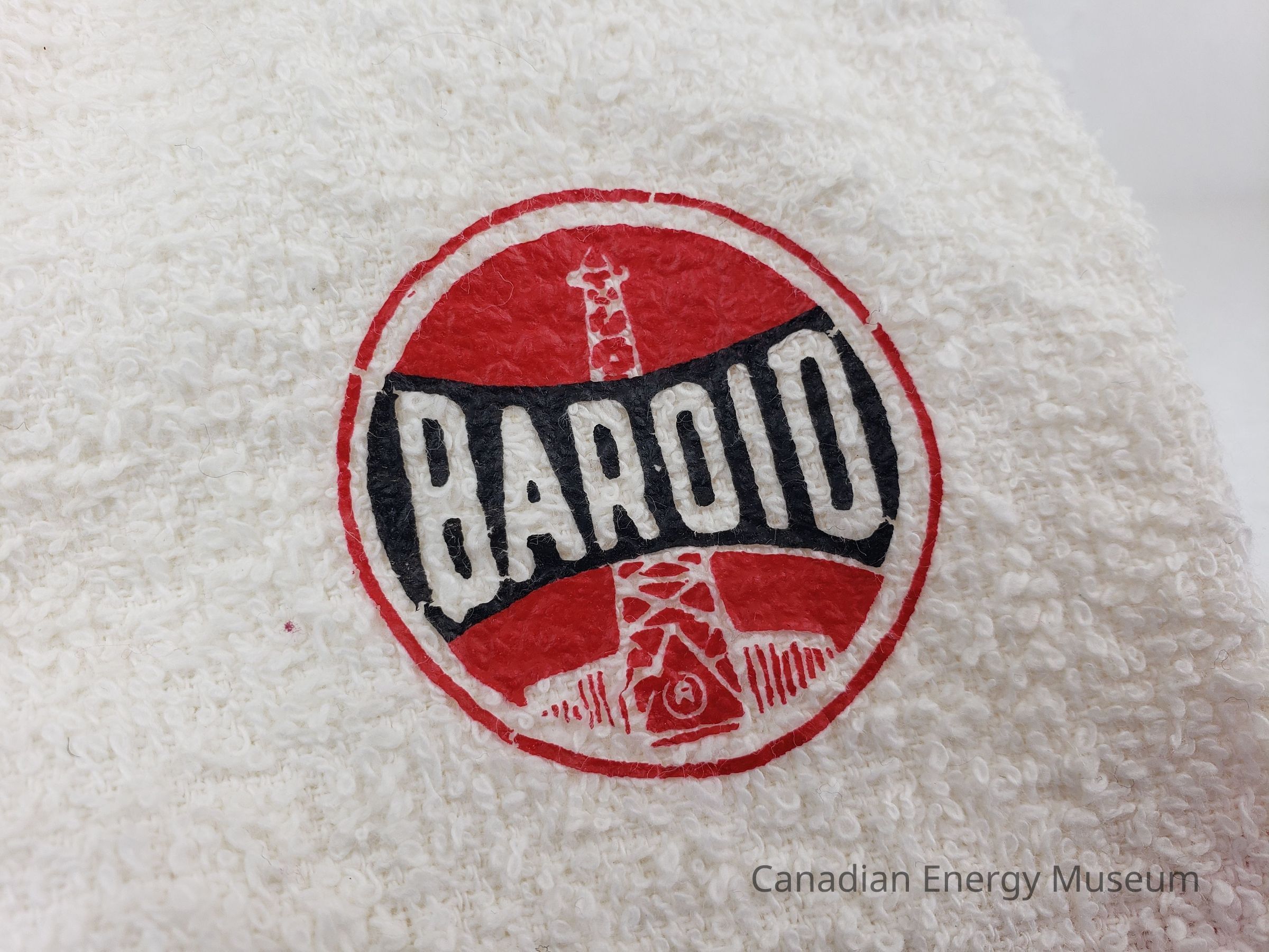 Design: A small pleated terry cloth towel, with a button loop at the top. At the bottom is a small Baroid logo printed in red and black, and the edges are lined in red stitching.