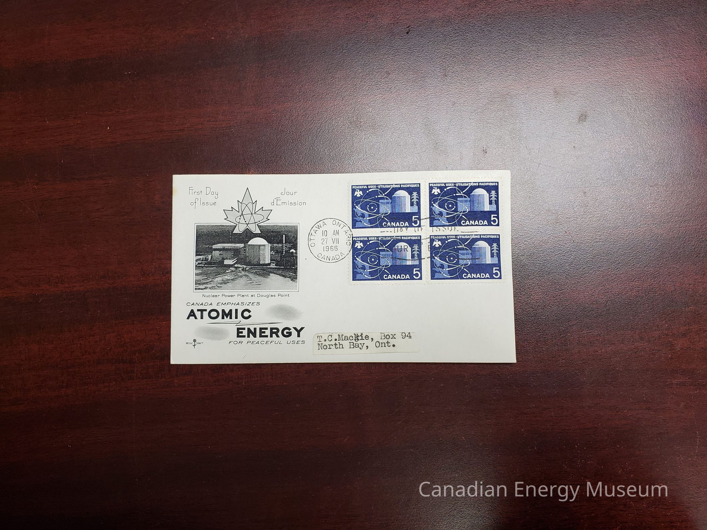 1960s, Nuclear, Atomic, Stamp, Postal Stamp, First Day Cover, Canada, Blue, First Day Issue, Ottawa, Post-WWII, Postwar, Paper, Paper Ephemera, Alternative Energy, Peace, Science, Douglas Point, Nuclear Power Plant, DoveDescription